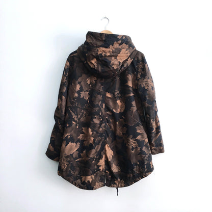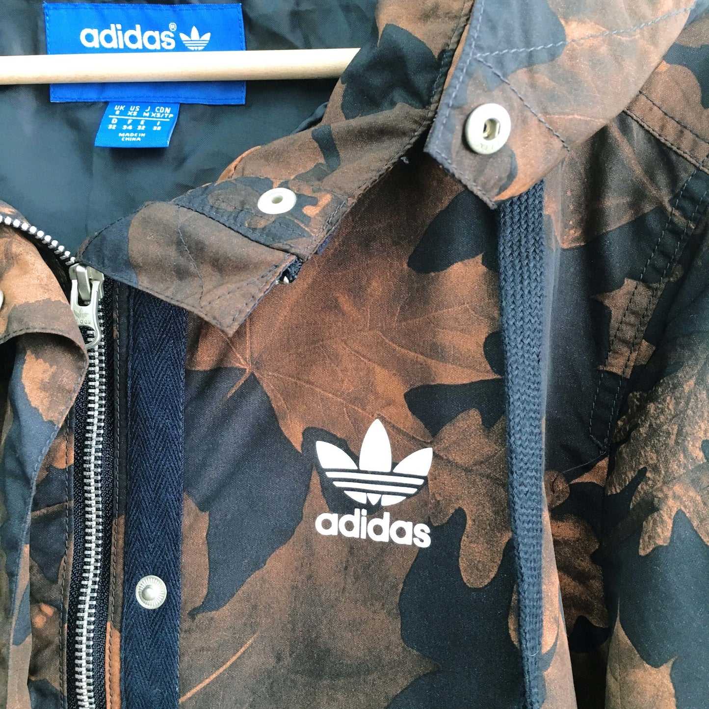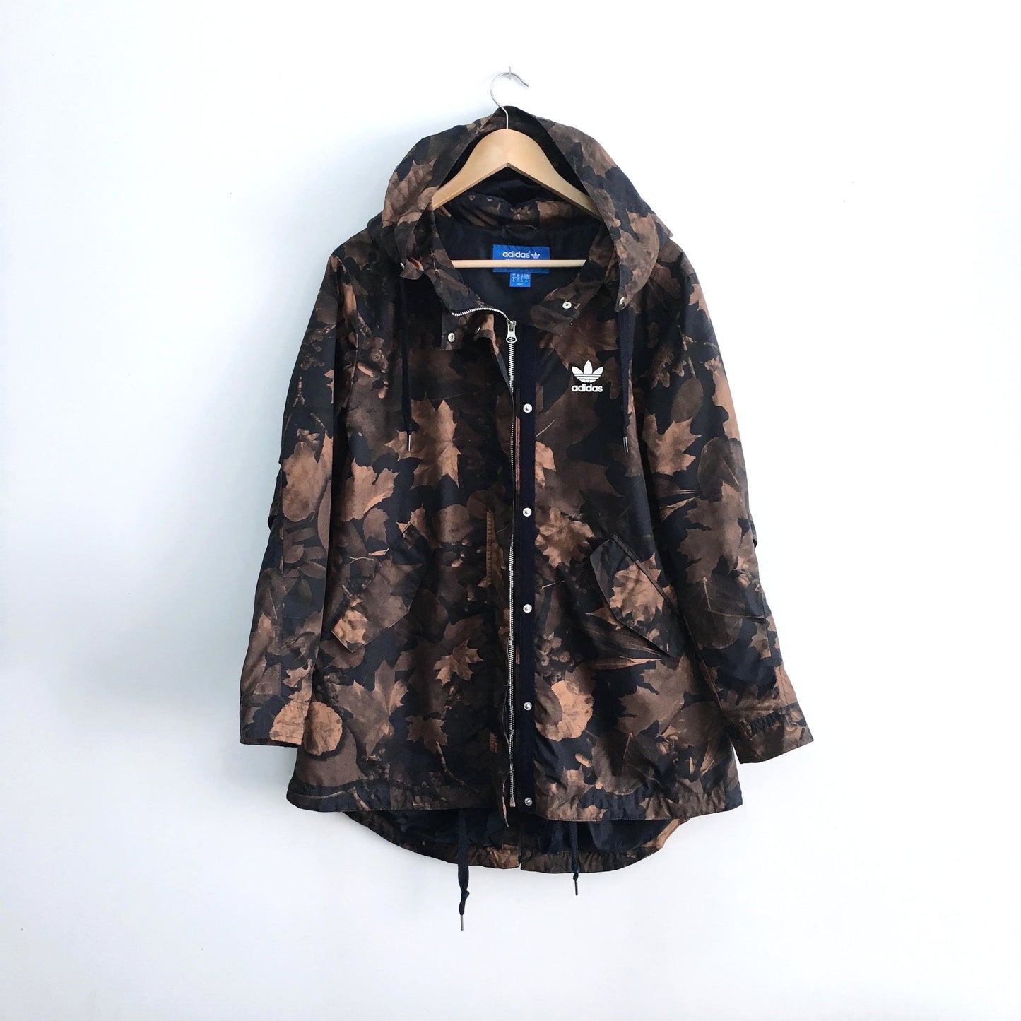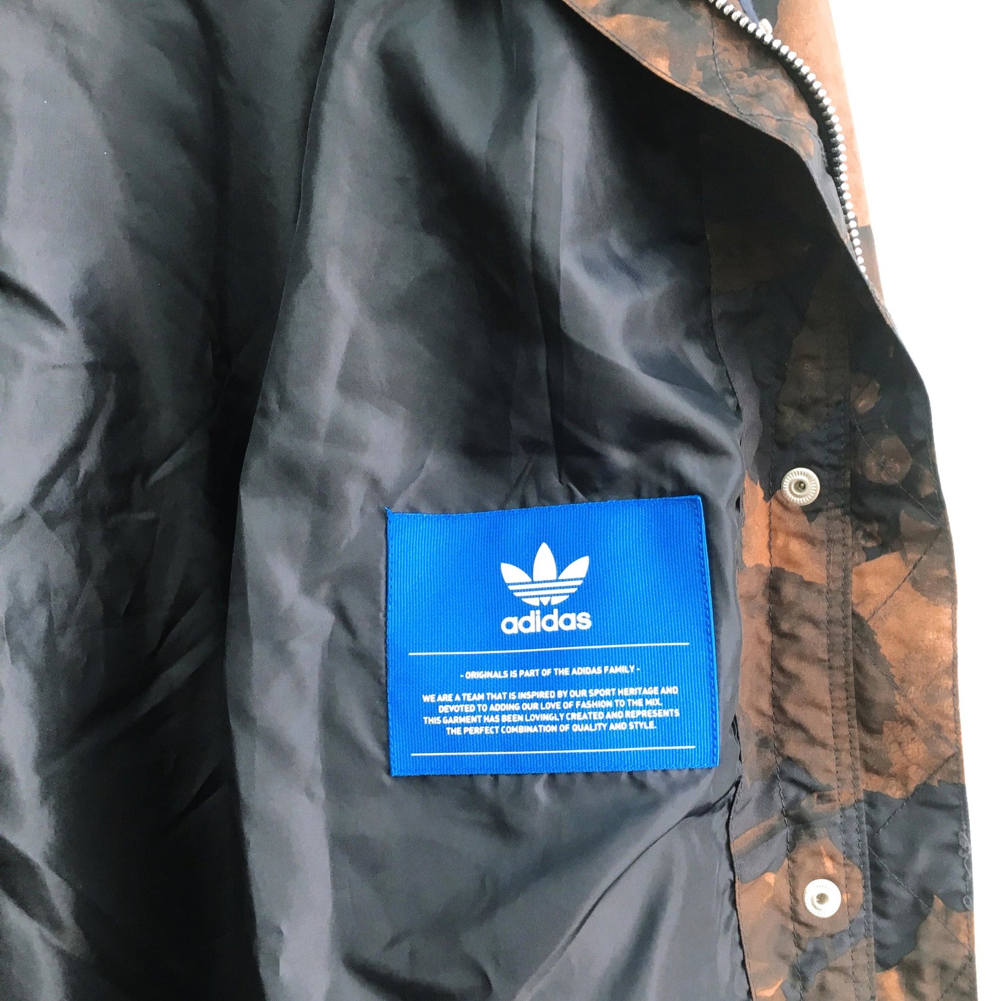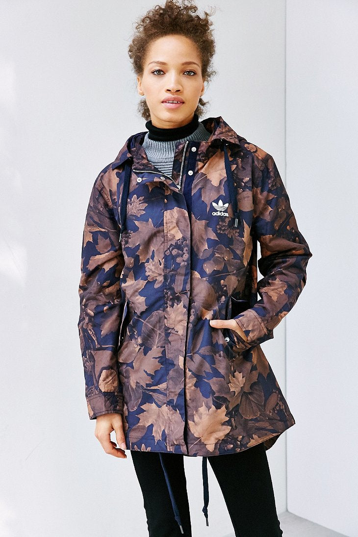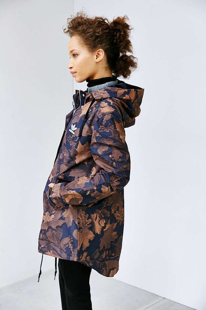Item Description: Inspired by the silhouettes of the '70s, this slouchy, relaxed-fit parka features a vintage-faded leaf print as a stylish take on the camouflage trend. An oversized hood with drawstrings keeps your head protected from the elements, and the classic trefoil logo on the front adds to the sporty-cool vibes. 100% polyester