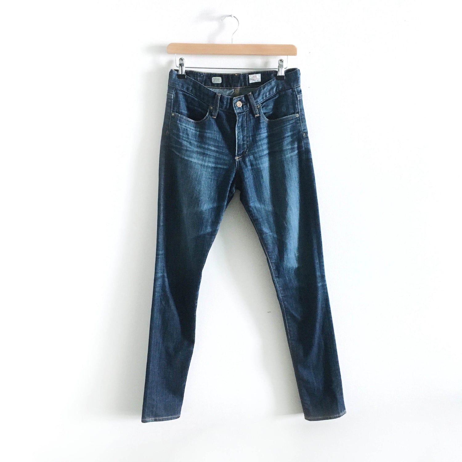 Item Description: These ankle skinny jeans feature 4-pocket styling and a single-button closure. Stitching at back pockets. Whiskering at front and behind knee. Worn edges and mild distressing. Dark wash high rise skinny 94% cotton 4% poly 2% spandex Colour: 6-year