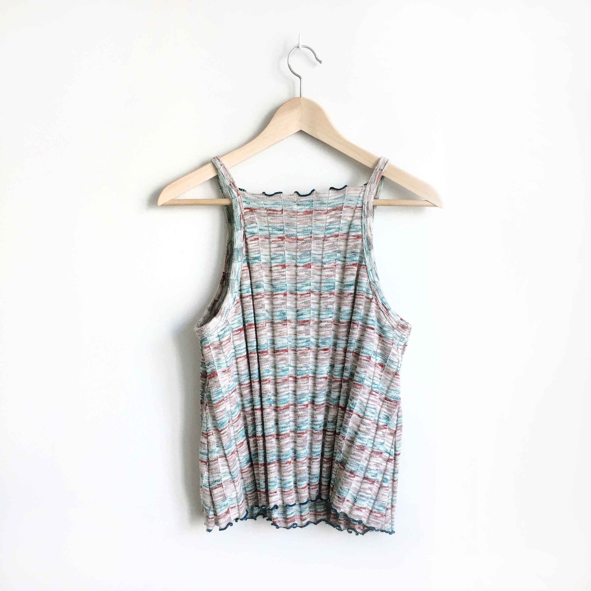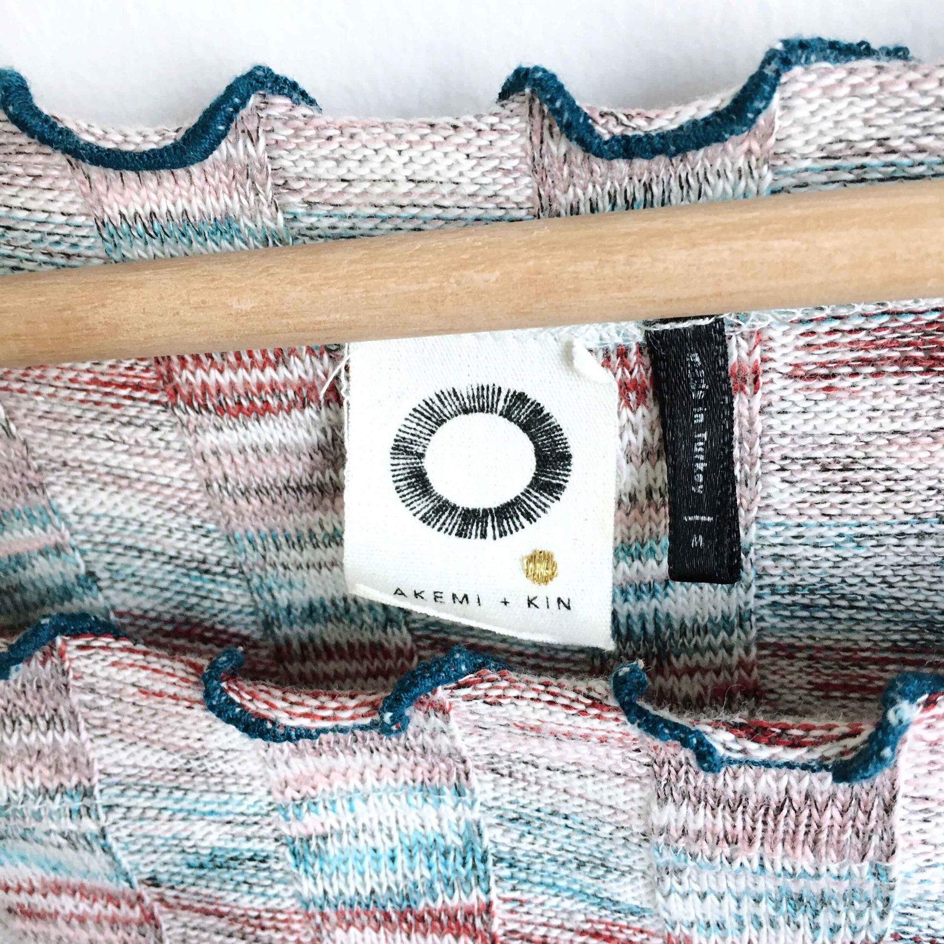 Item Description: This halter style tank from Akemi + Kin features an oversized rib perpendicular to colour heather stripes. A straight neckline with a curly hem gives this a retro feel. Lots of stretch, slightly swing silhouette. 75% cotton 23% polyester 2% elastane