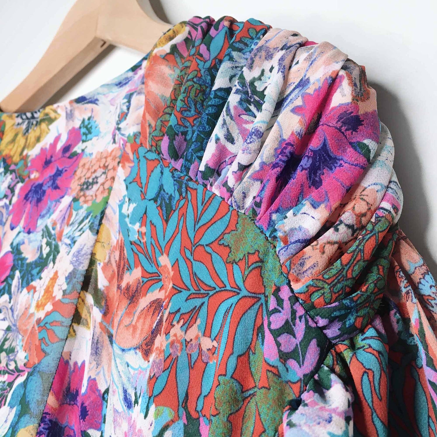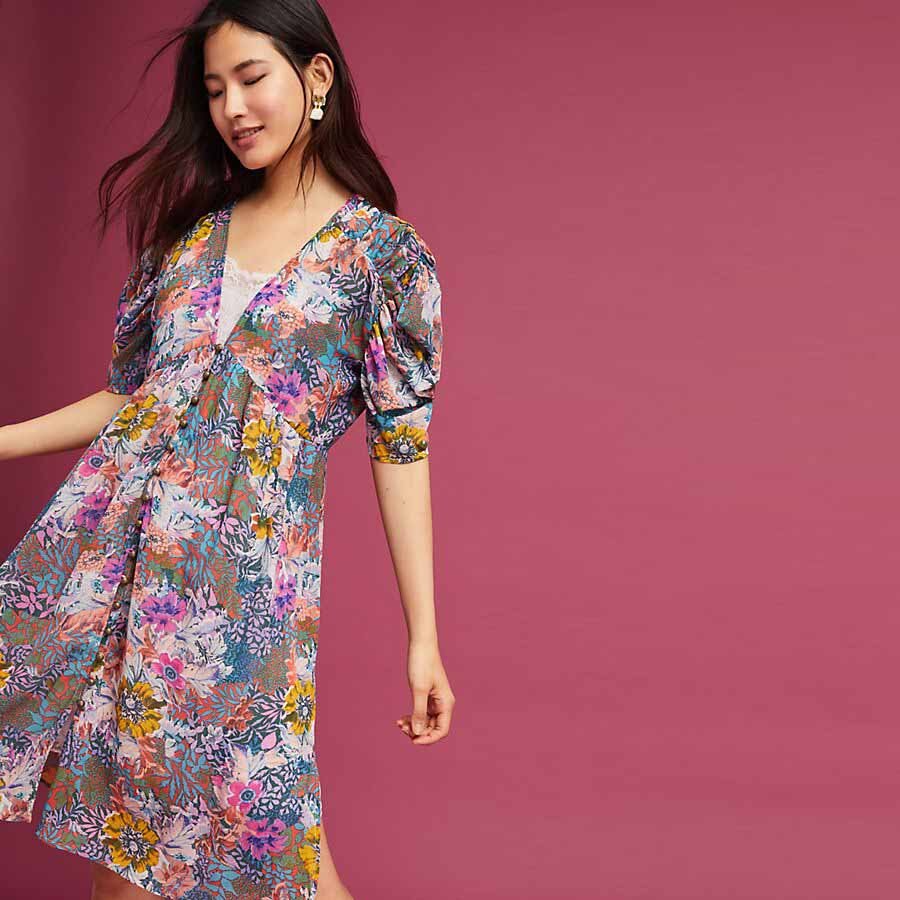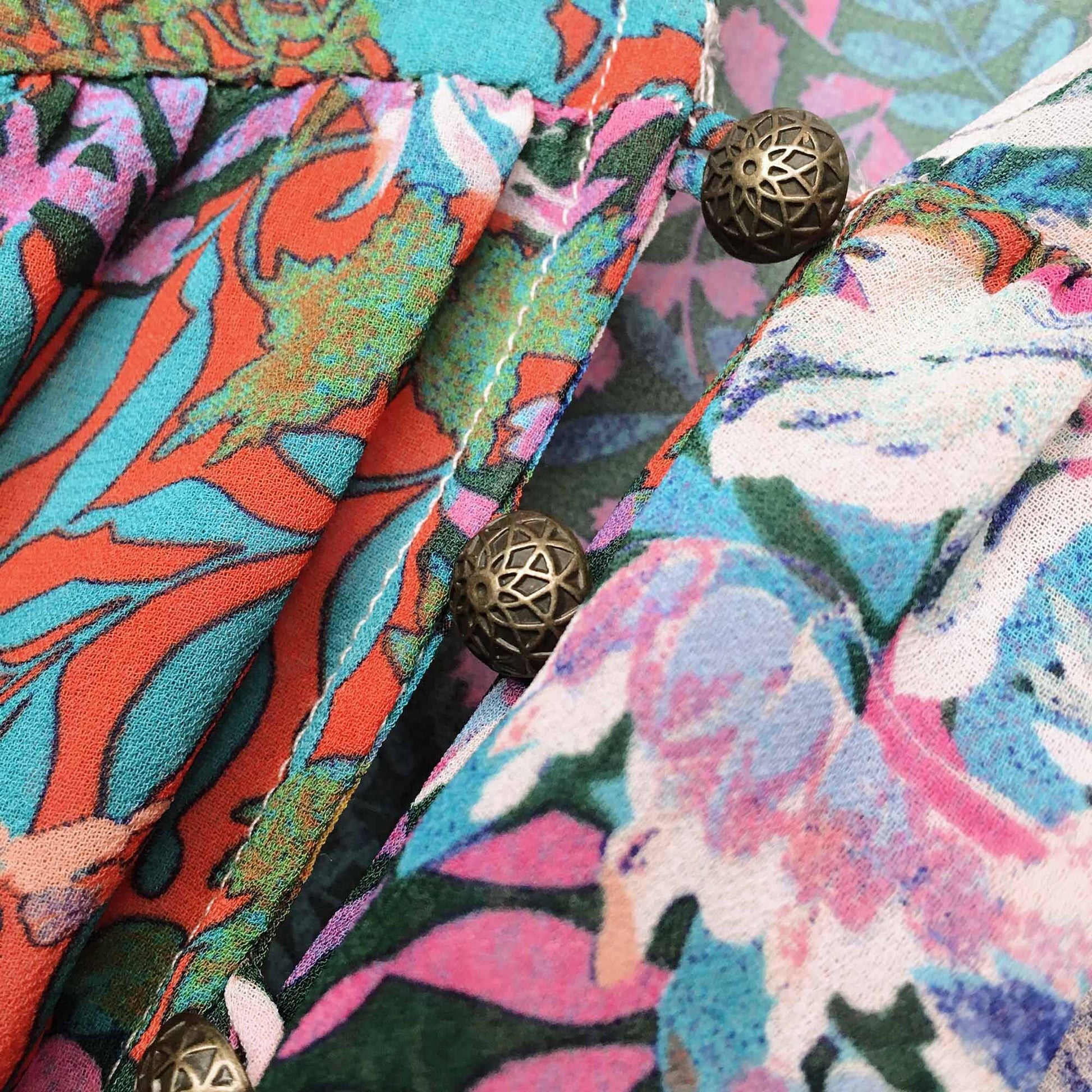 Item Description: This beautiful floral boho dress from Akemi + Kin features gathered, ruched shoulders for added drama, a metallic button down front and babydoll swing. Layer over an existing dress or slip - slip not included. 100% polyester