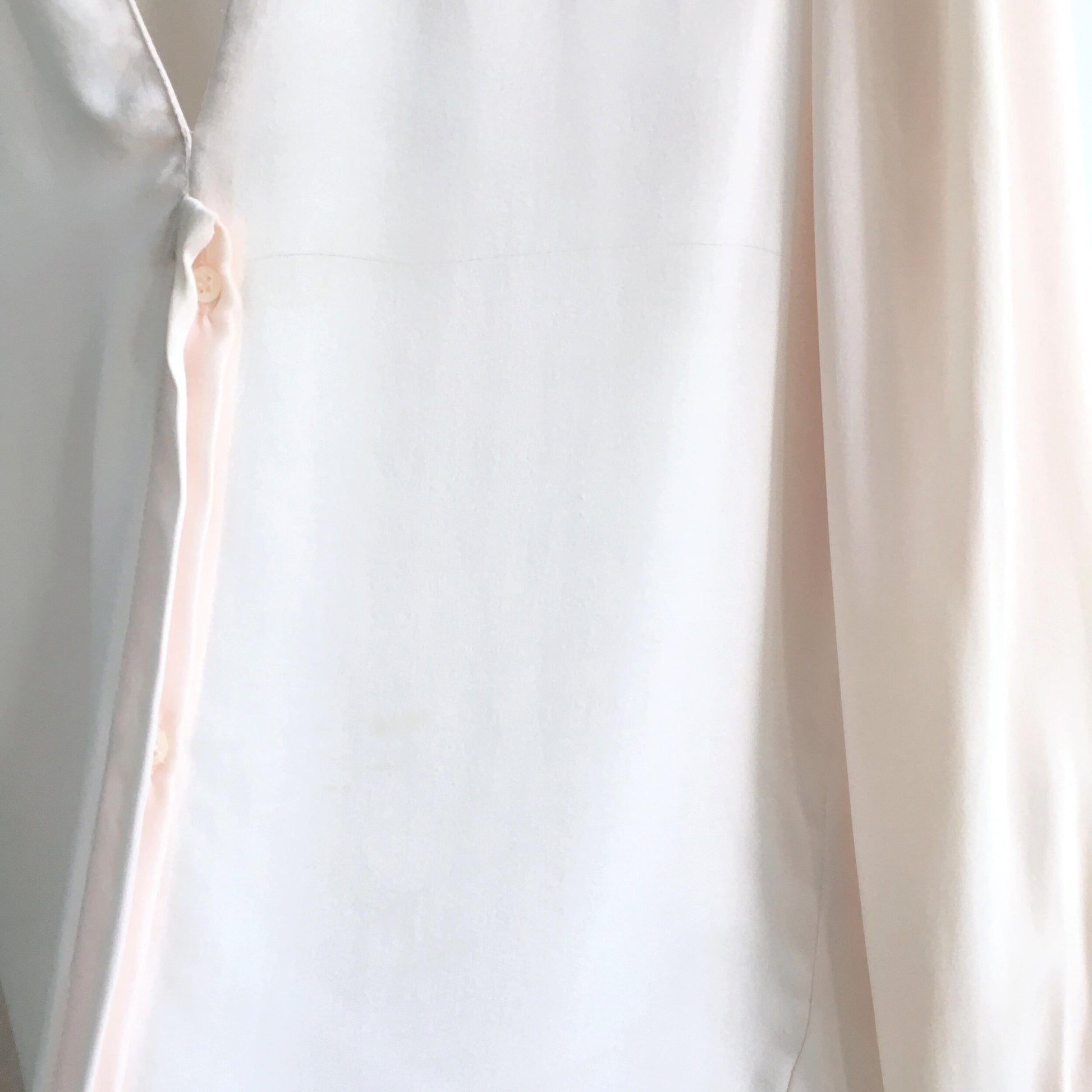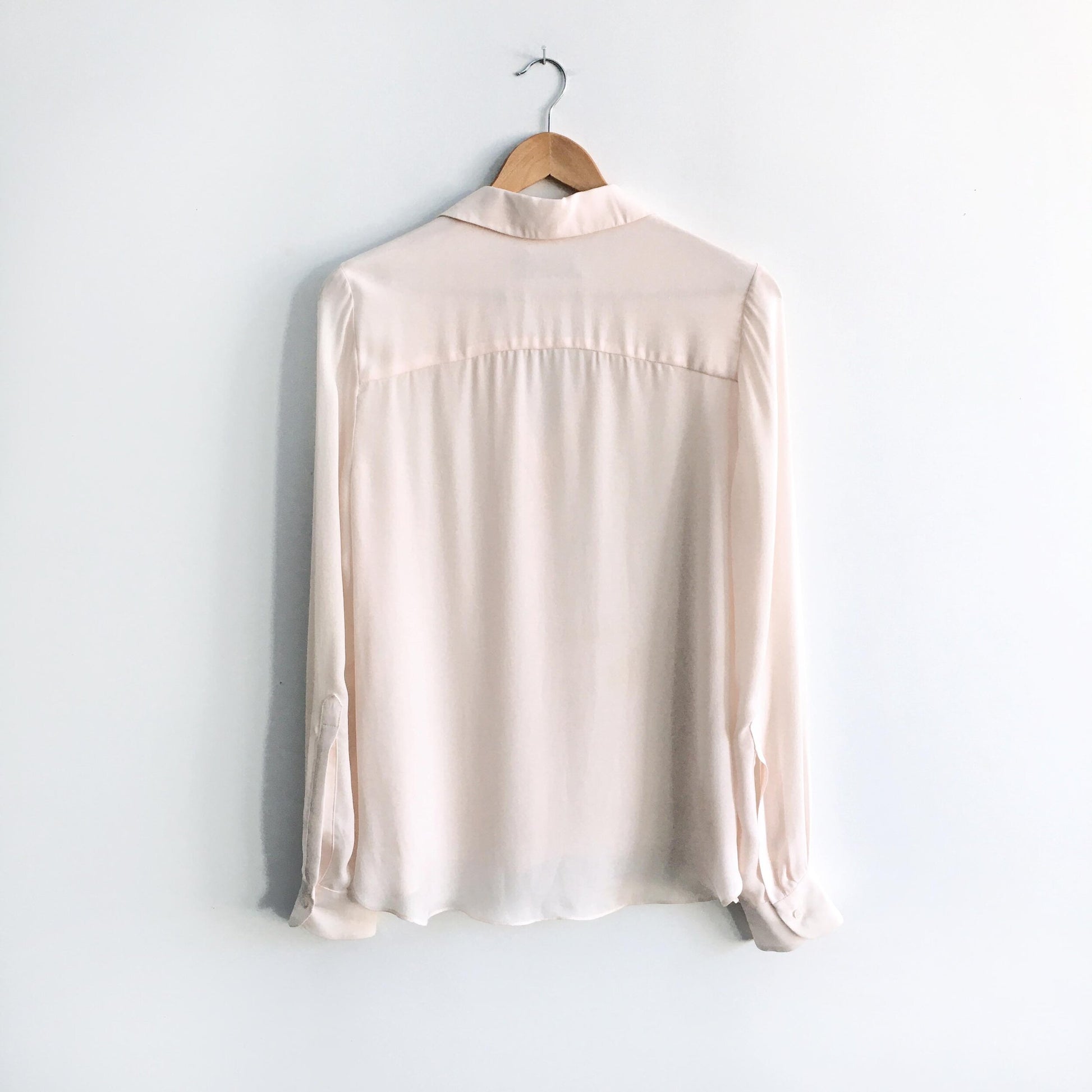 Item Description: This exceptionally pretty satiny silk blouse from A.L.C. features a soft pink hue, chiffon sleeves, and v-neck with covered button closure. 100% silk