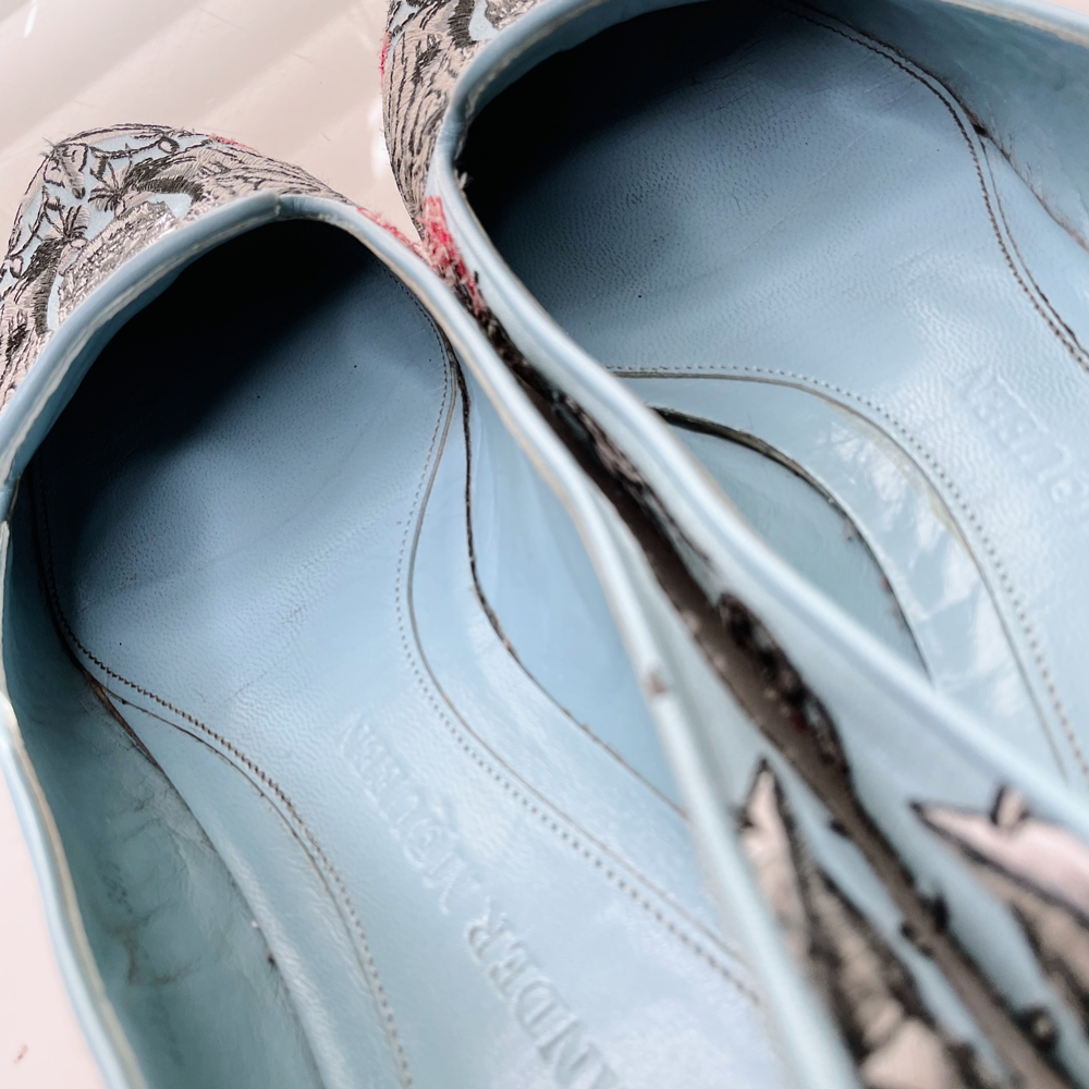 Item Description: These stunning slip on flats from Alexander McQueen feature an all over embroidered tiger skull scene on a light blue silk shell with leather insole and sole. Perfect for a statement driving loafer.