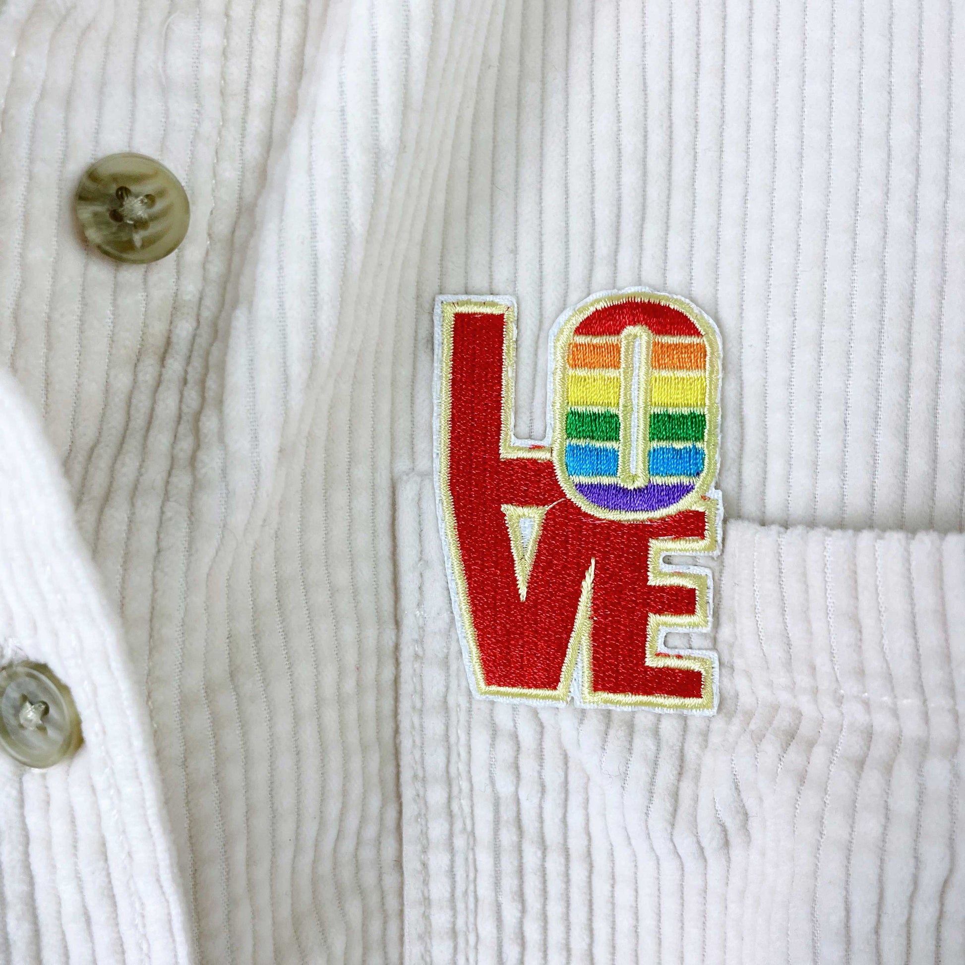Condition: GOOD - we reworked this cute shirt jacket with a LOVE patch to cover up a stain that we tried, but couldn't wash out. There is still a green mark on the back of the sleeve and very small spots near the patch but otherwise she good to go!