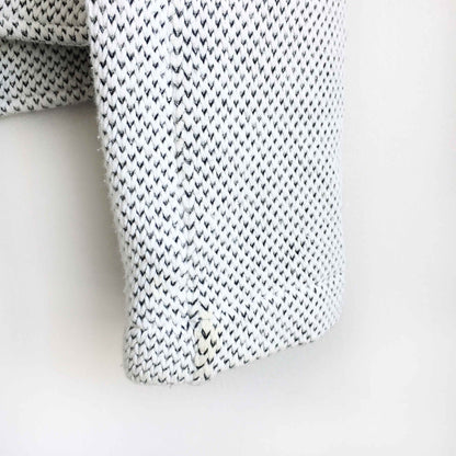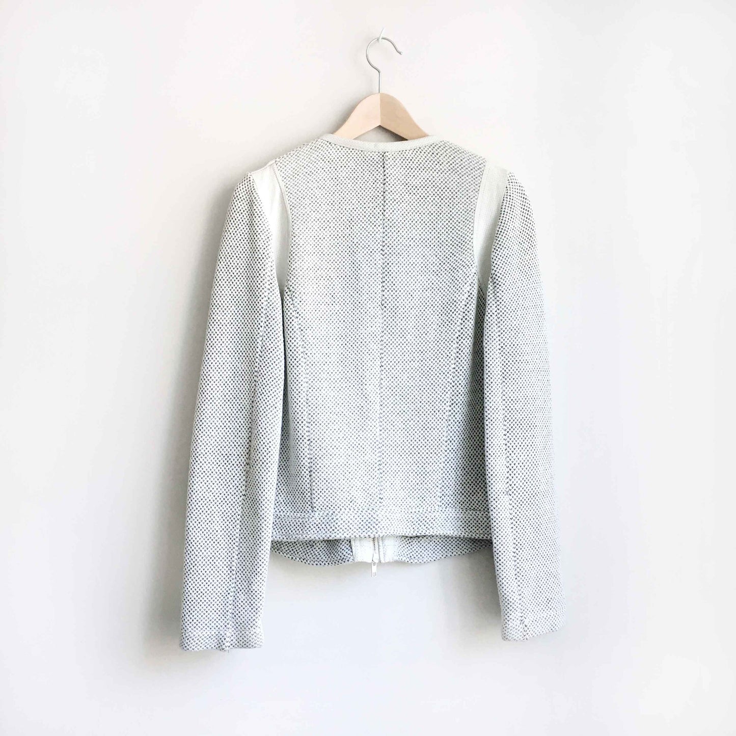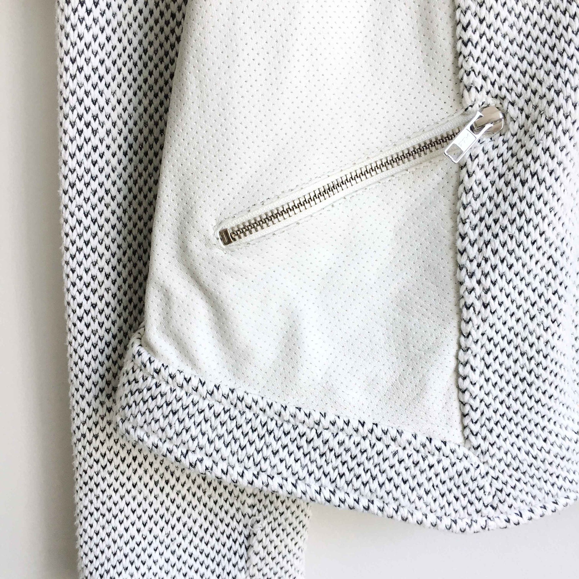 Item Description: This gorgeous white knit jacket from Ams Pure features metallic thread and perforated leather trim in a stylish and clean silhouette. 87% cotton 9% viscose 2% polyamide 2% lurex, trim 100% lambs leather