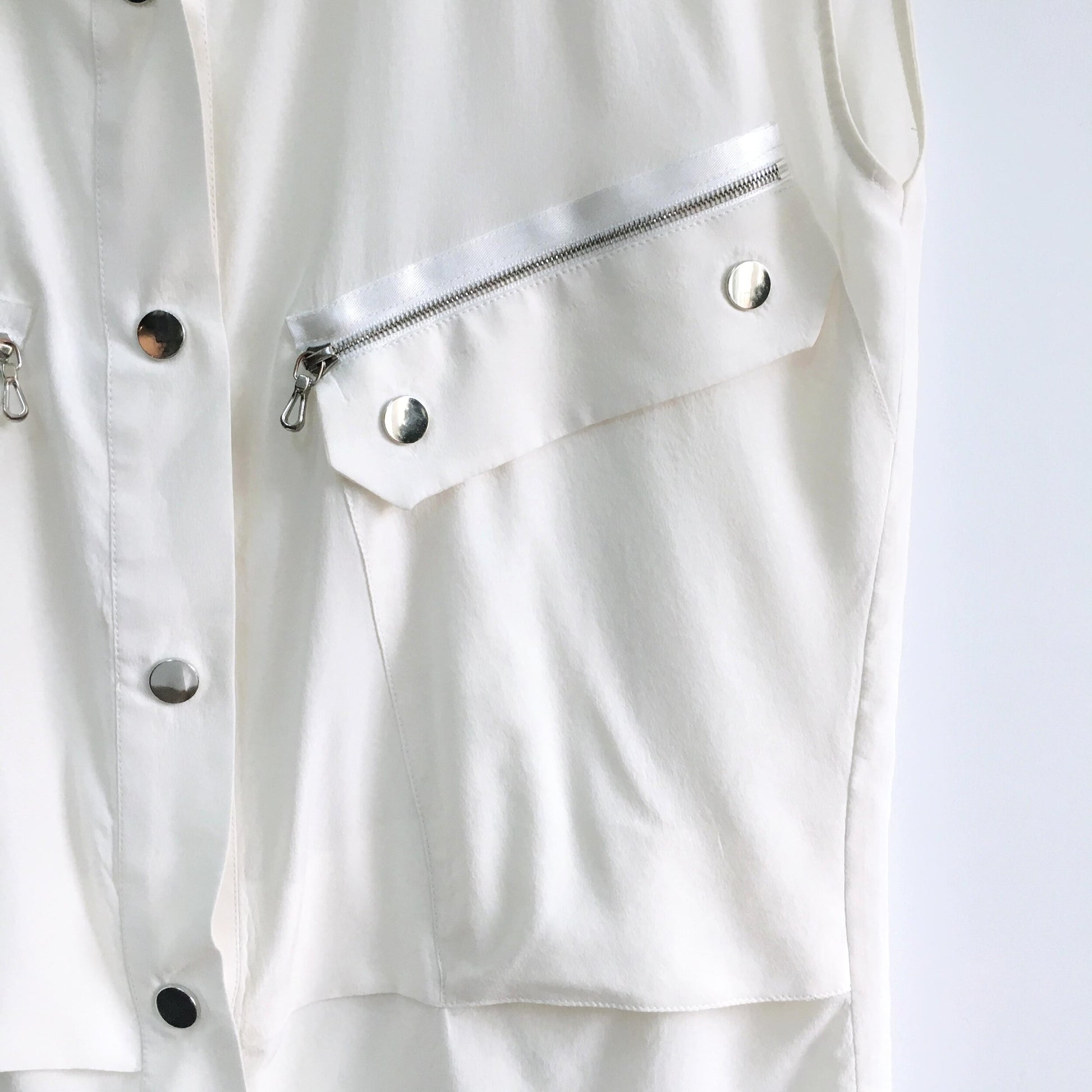 Item Description: This elegant silk blouse from designer Anthony Vaccarello features front pockets, snap button closure and stud details. 100% silk