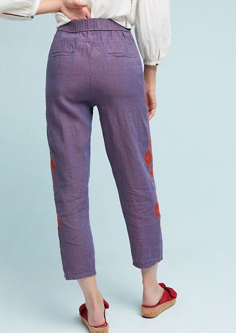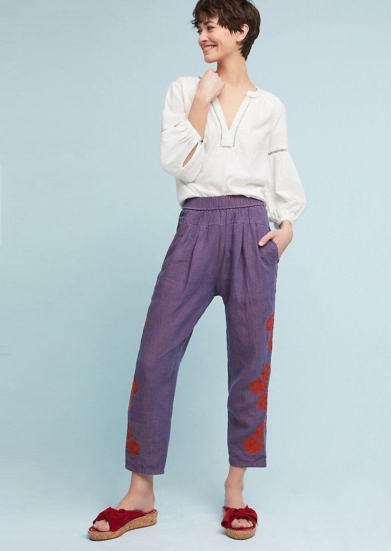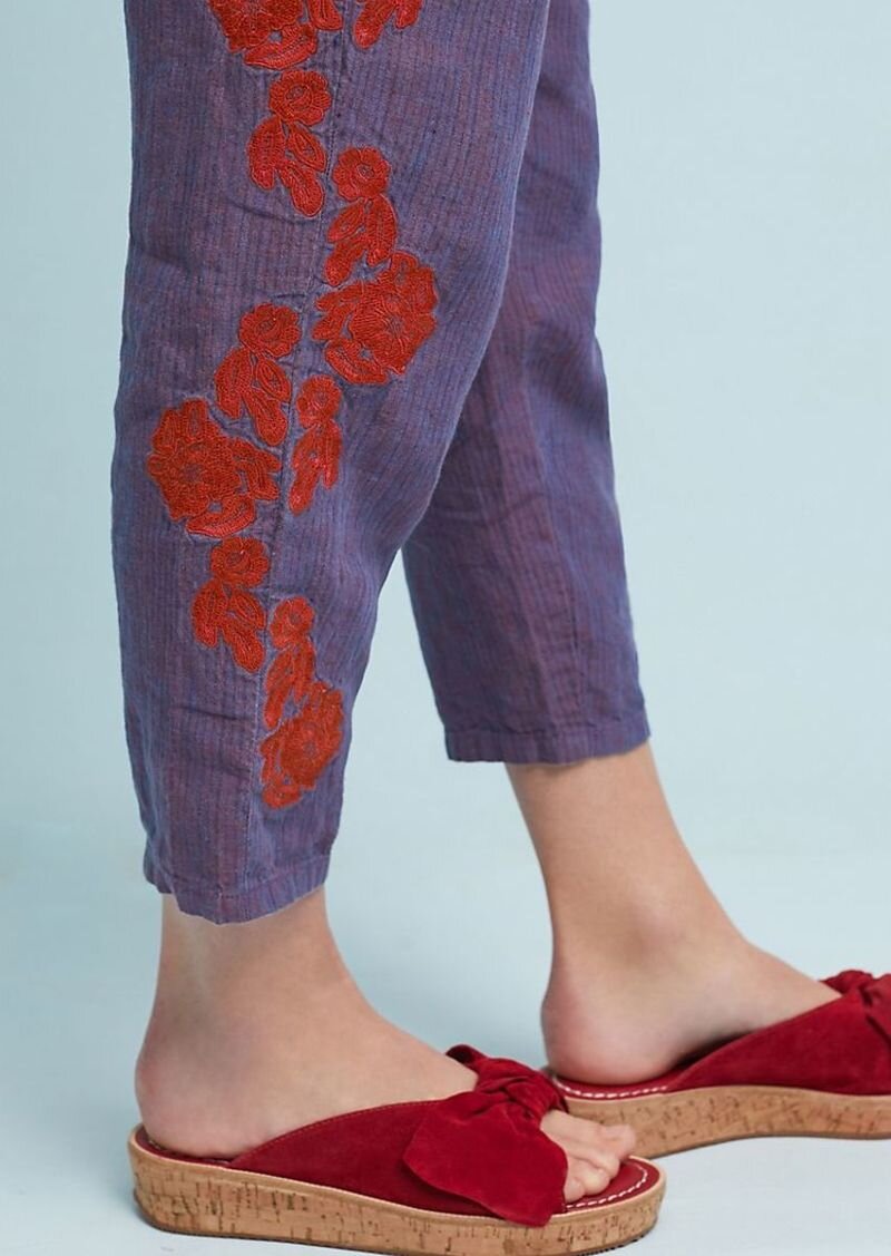 Item Description: These relaxed embroidered linen pants from Anthropologie feature a drop waist and orange flowers down the sides.