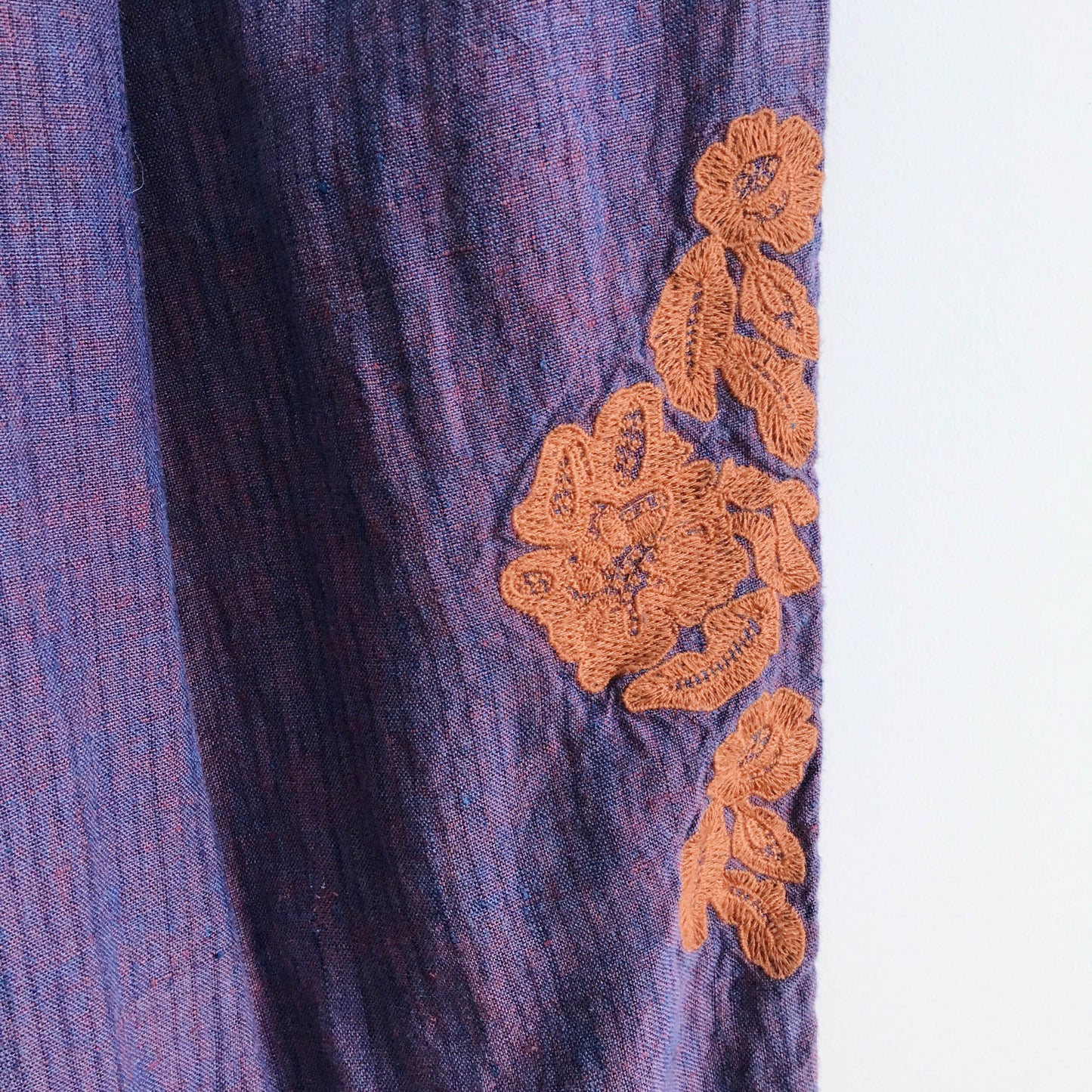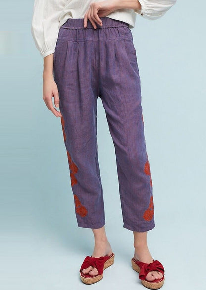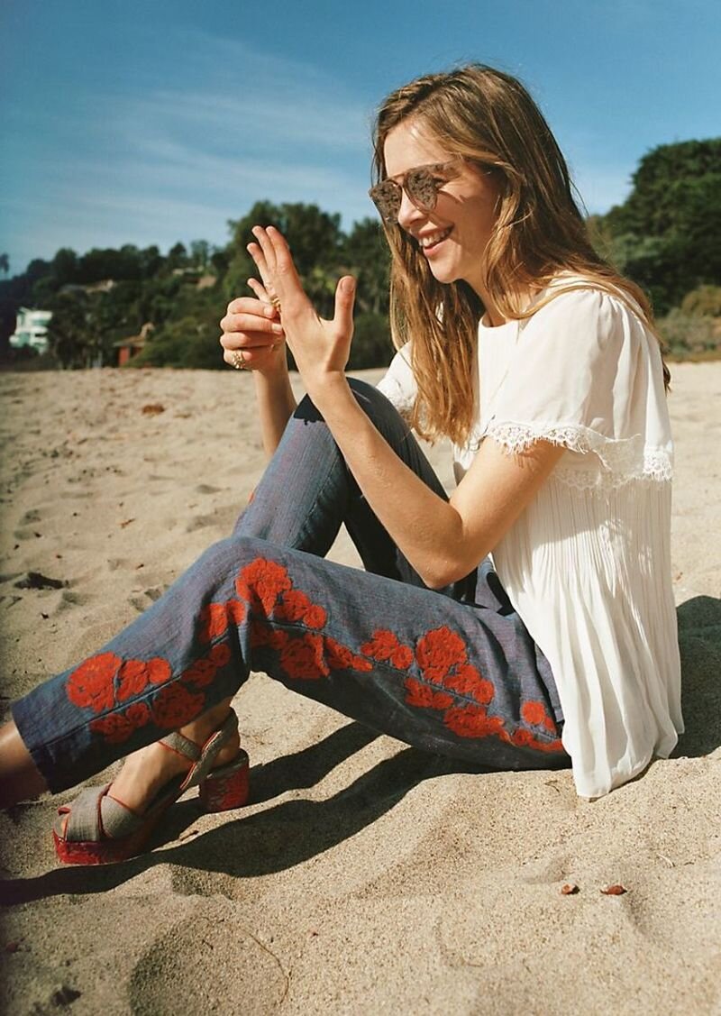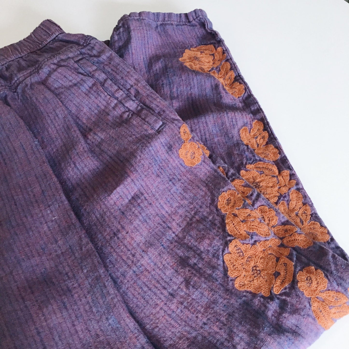 Item Description: These relaxed embroidered linen pants from Anthropologie feature a drop waist and orange flowers down the sides.