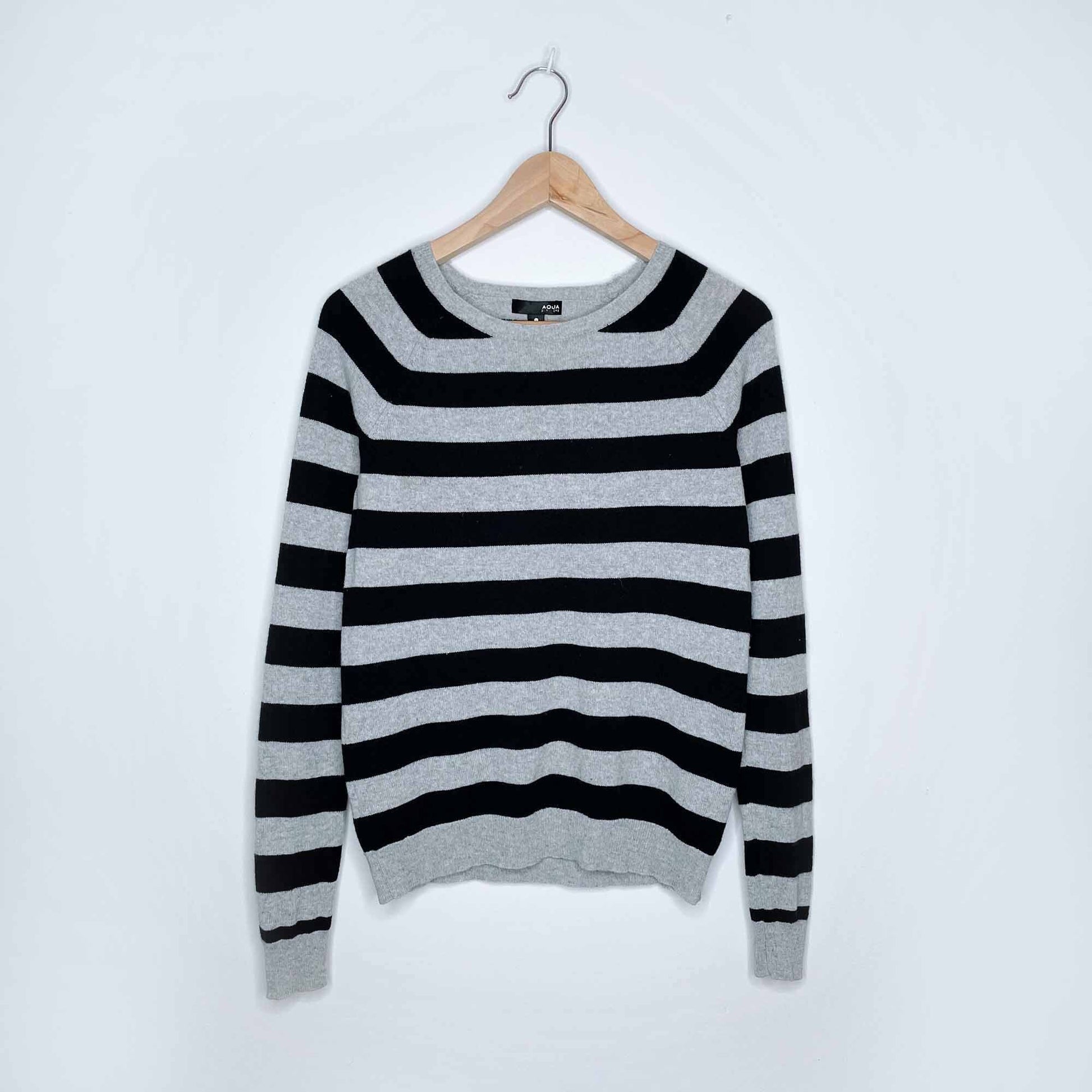Item Description: This classic look from Aqua Cashmere features a skull print back on a striped raglan sleeve crewneck. 100% cashmere