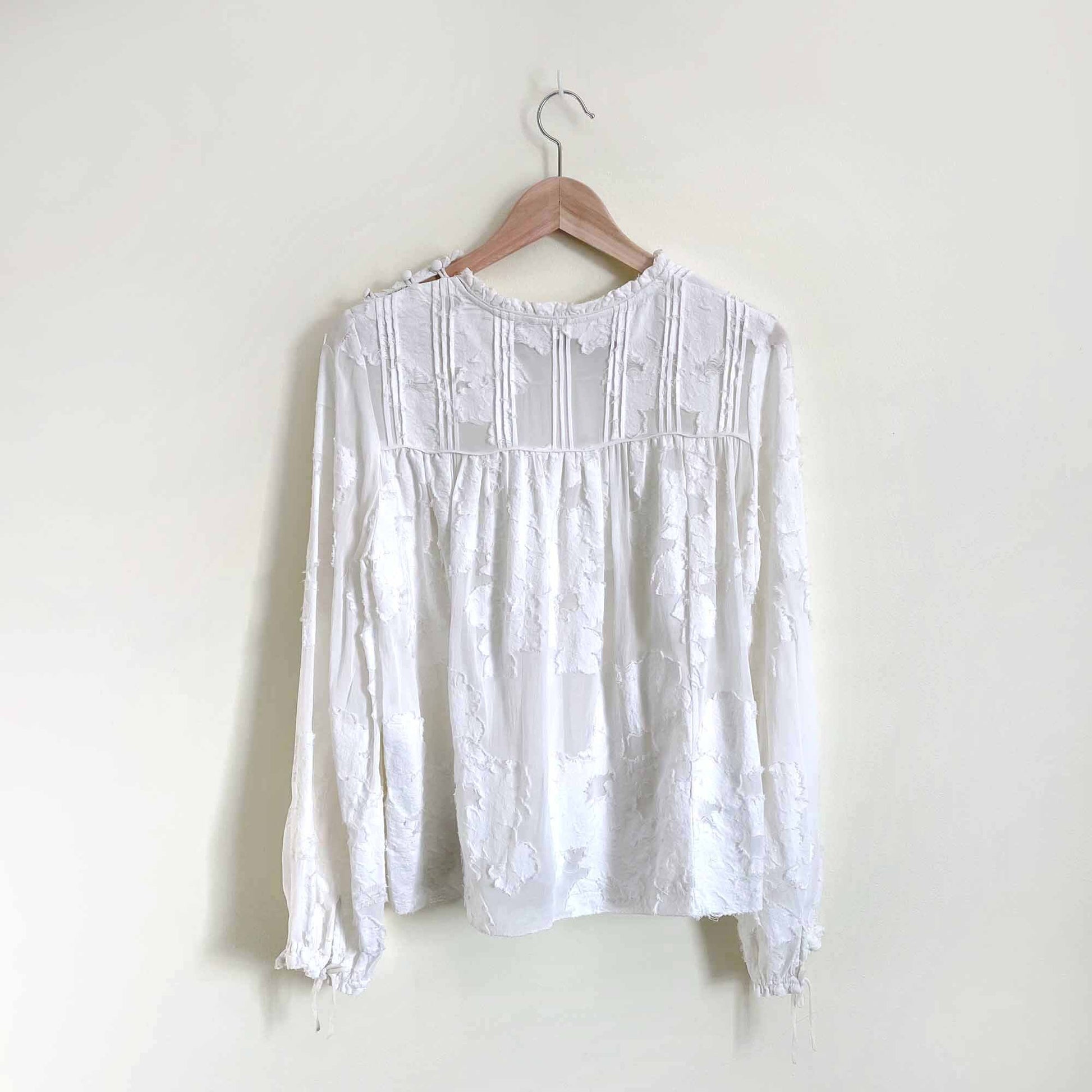 Item Description: Vintage-inspired and thoroughly romantic, this version of the Aritzia Wilfred Lourdes Blouse is made with a beautiful jacquard that's been clipped by hand in a floral pattern. Delicate pintucks add to the feminine feel. 63% viscose 37% cotton, trim 100% silk