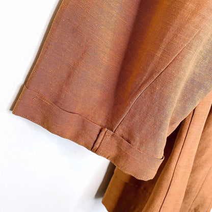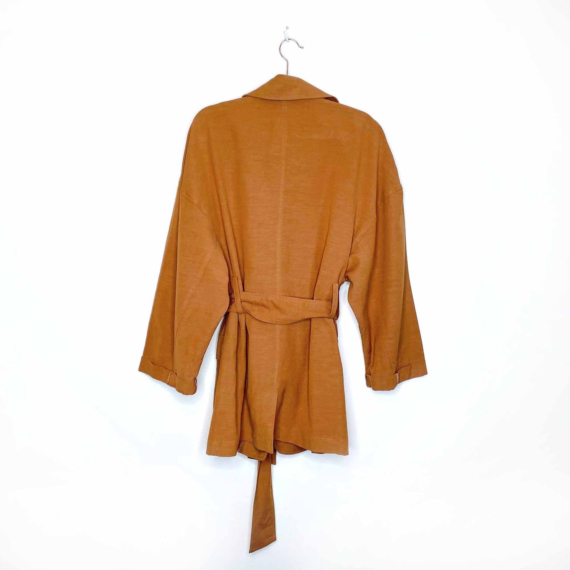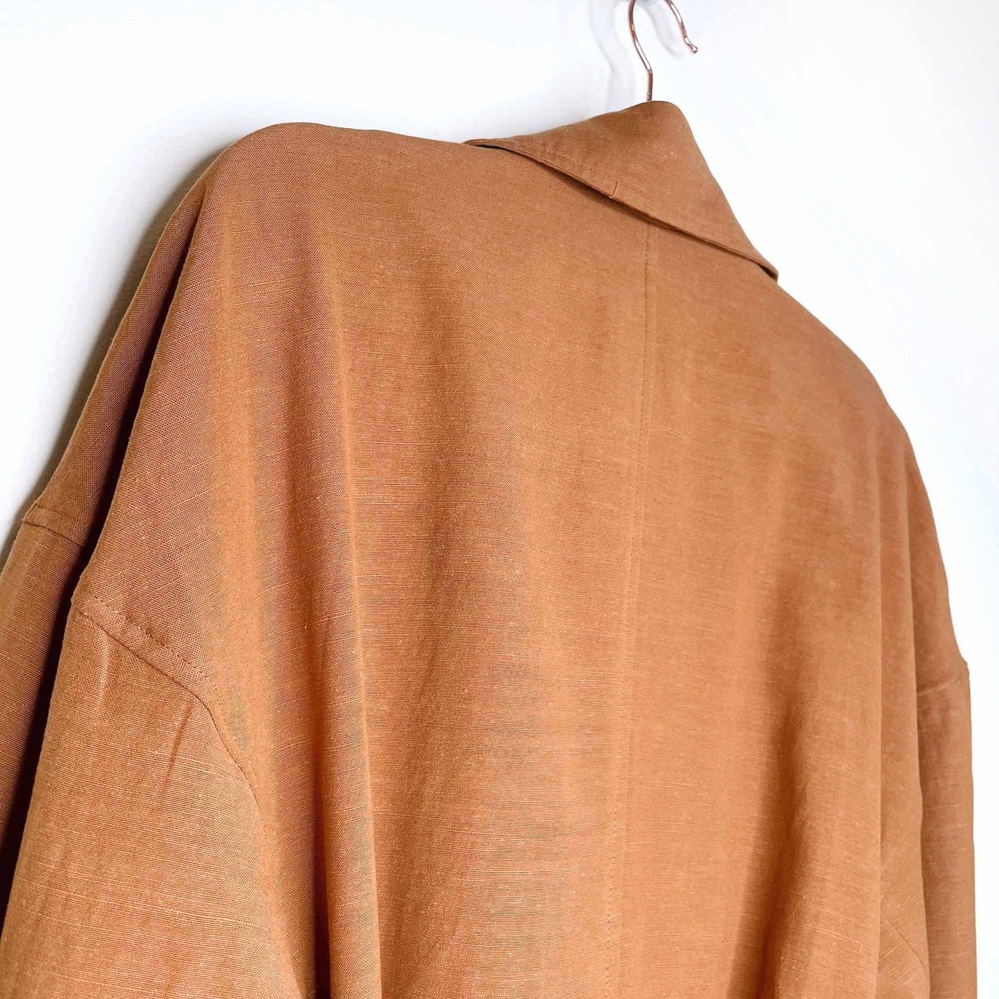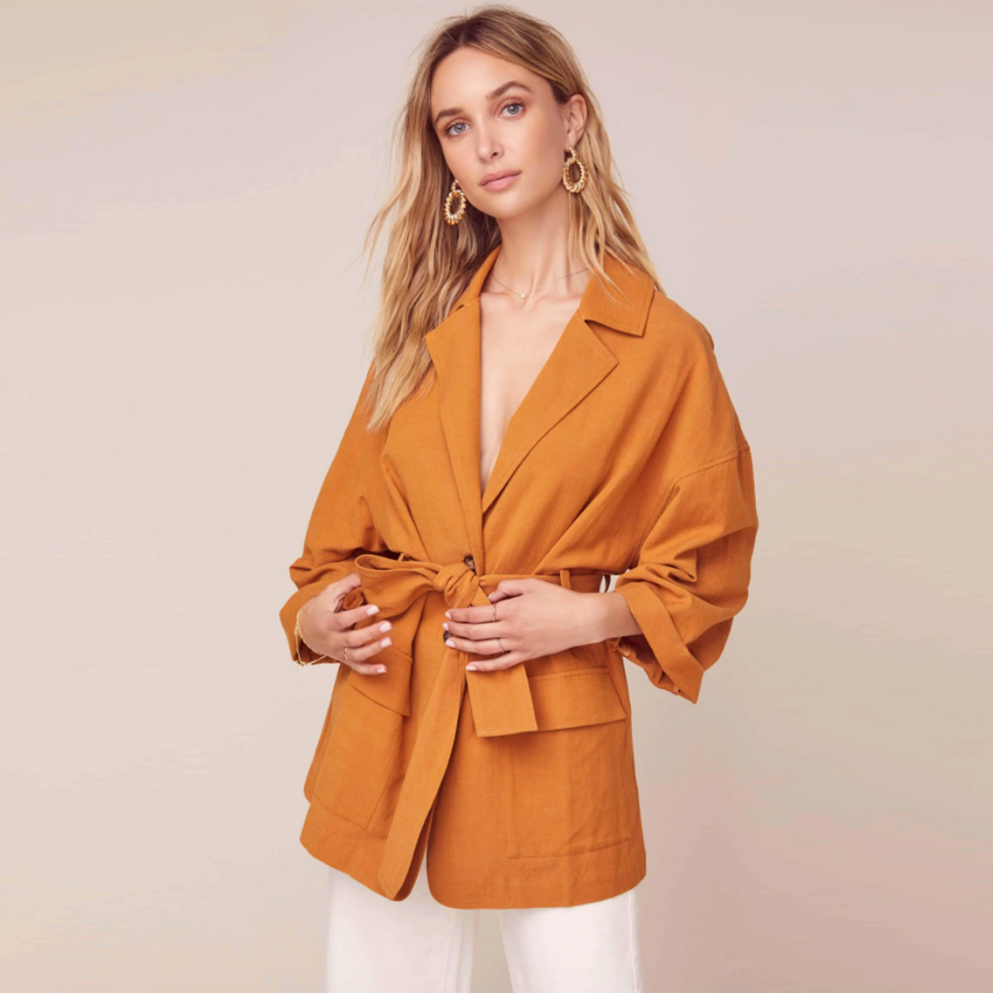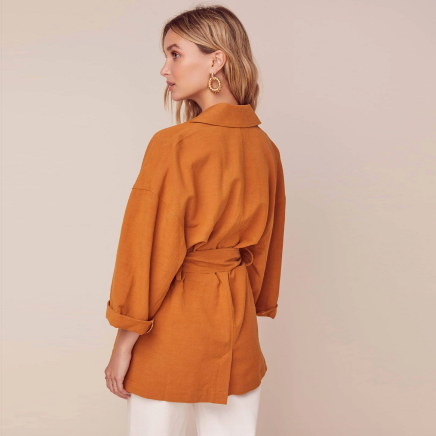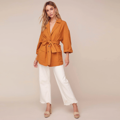 Item Description: The Gemini Jacket is the perfect winter to spring transition piece! It features a notched lapel with a plunging neckline that leads to a buttoned front and tie waist accent. Double patch pockets at the front and long oversized sleeves. Vented back. 80% linen 20% cotton