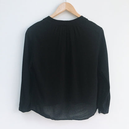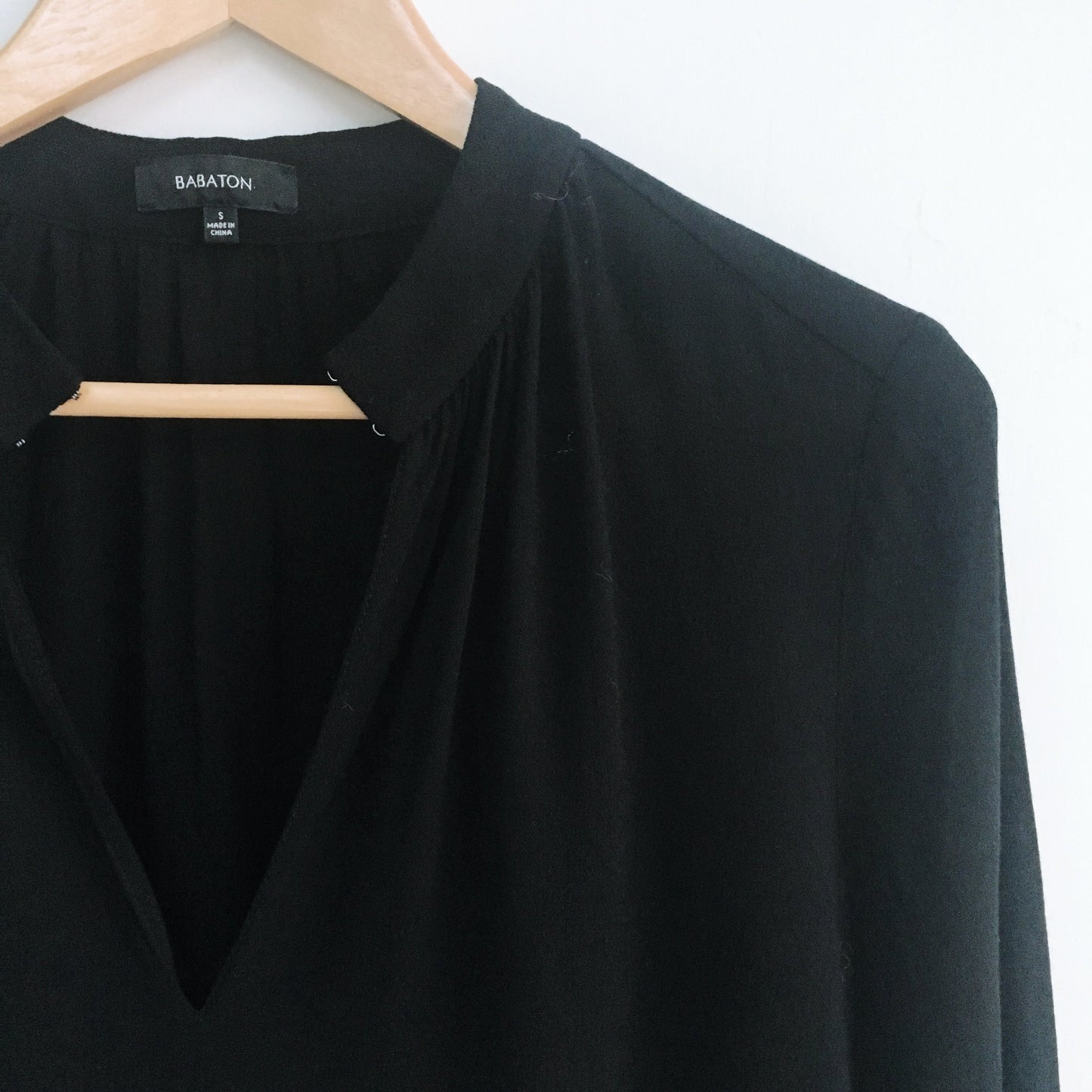 Item Description: This cropped blouse with 3/4 sleeves can be worn two different ways - with an open, casual neckline or hooked at the top for a more elegant look. Tuck into a high waisted pair of trousers (like our Sandra studio blue pair!) and rock with a rockin’ pair of black pumps.