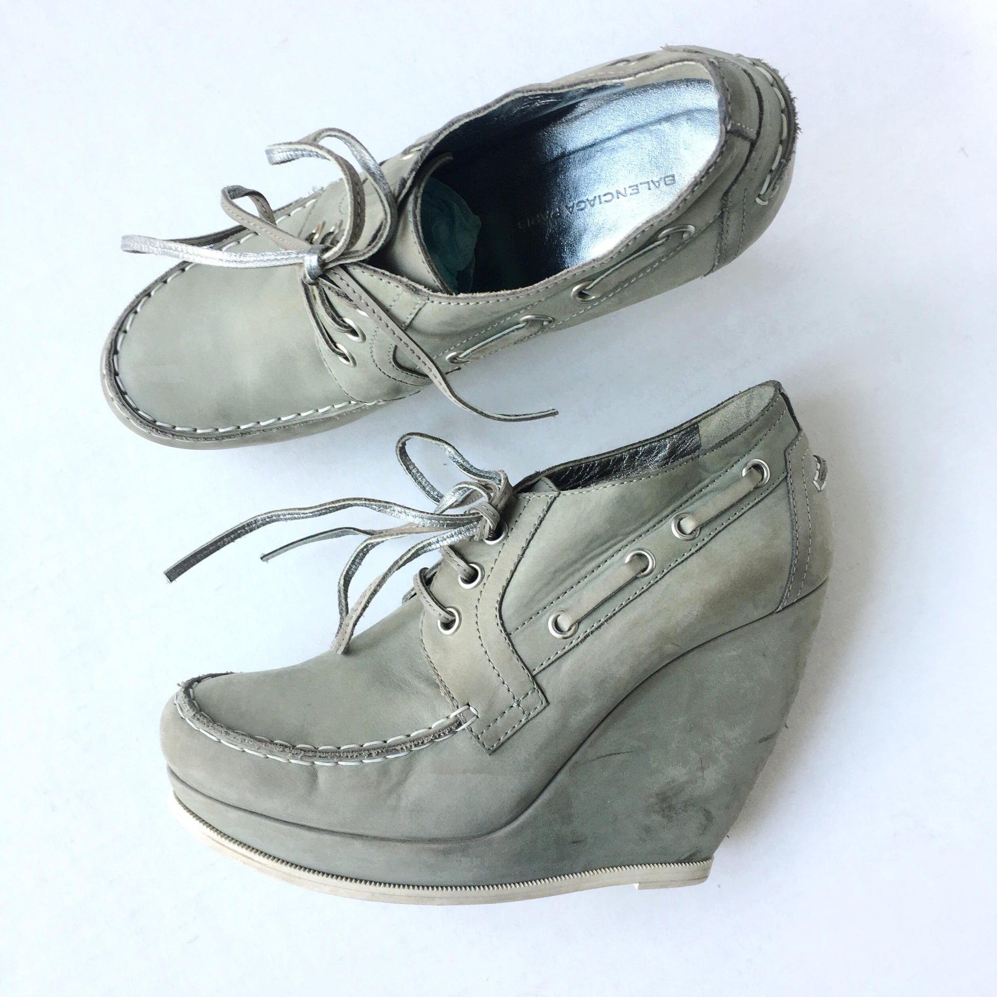 Item Description: A feminine take on the classic loafer shoe, this Balenciaga pair of lace-up wedge loafers has visible front seams and a wedge heel that's perfect for long days. 100% leather upper, rubber sole
