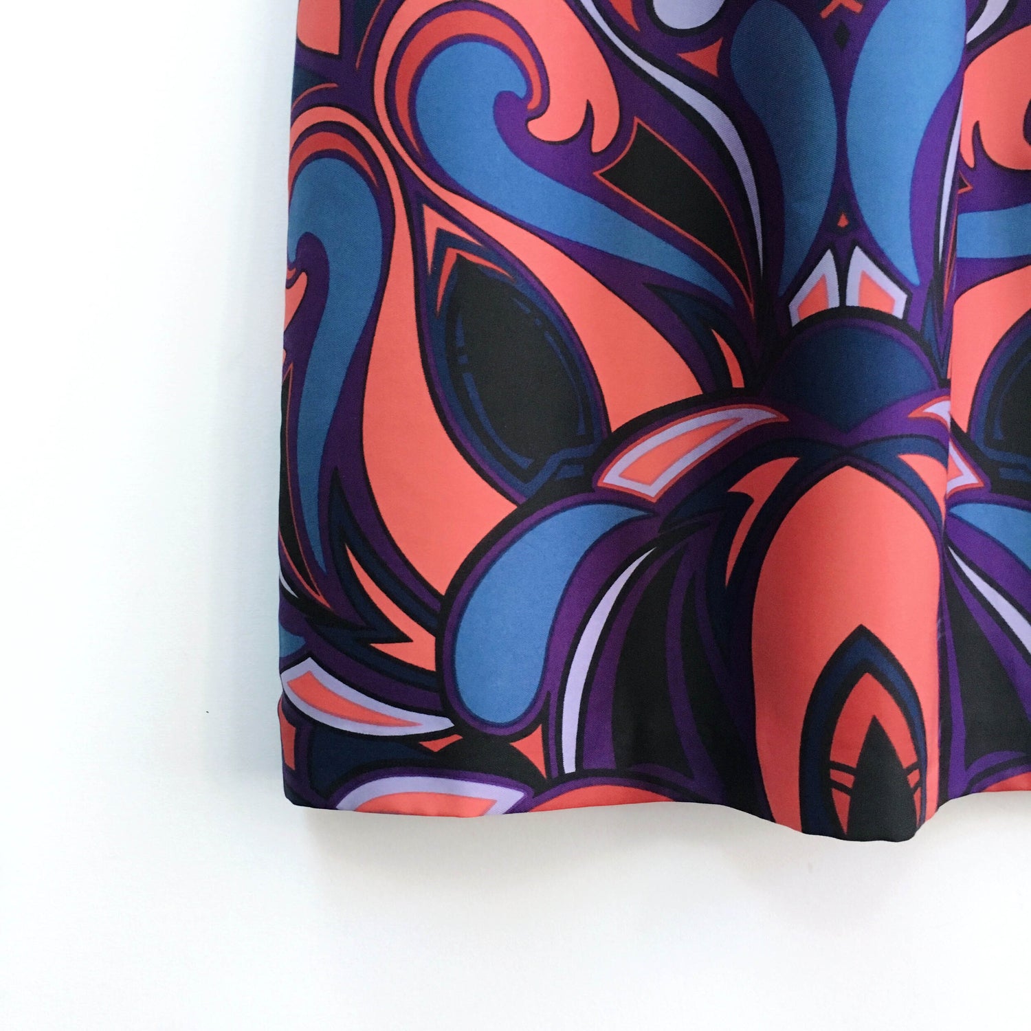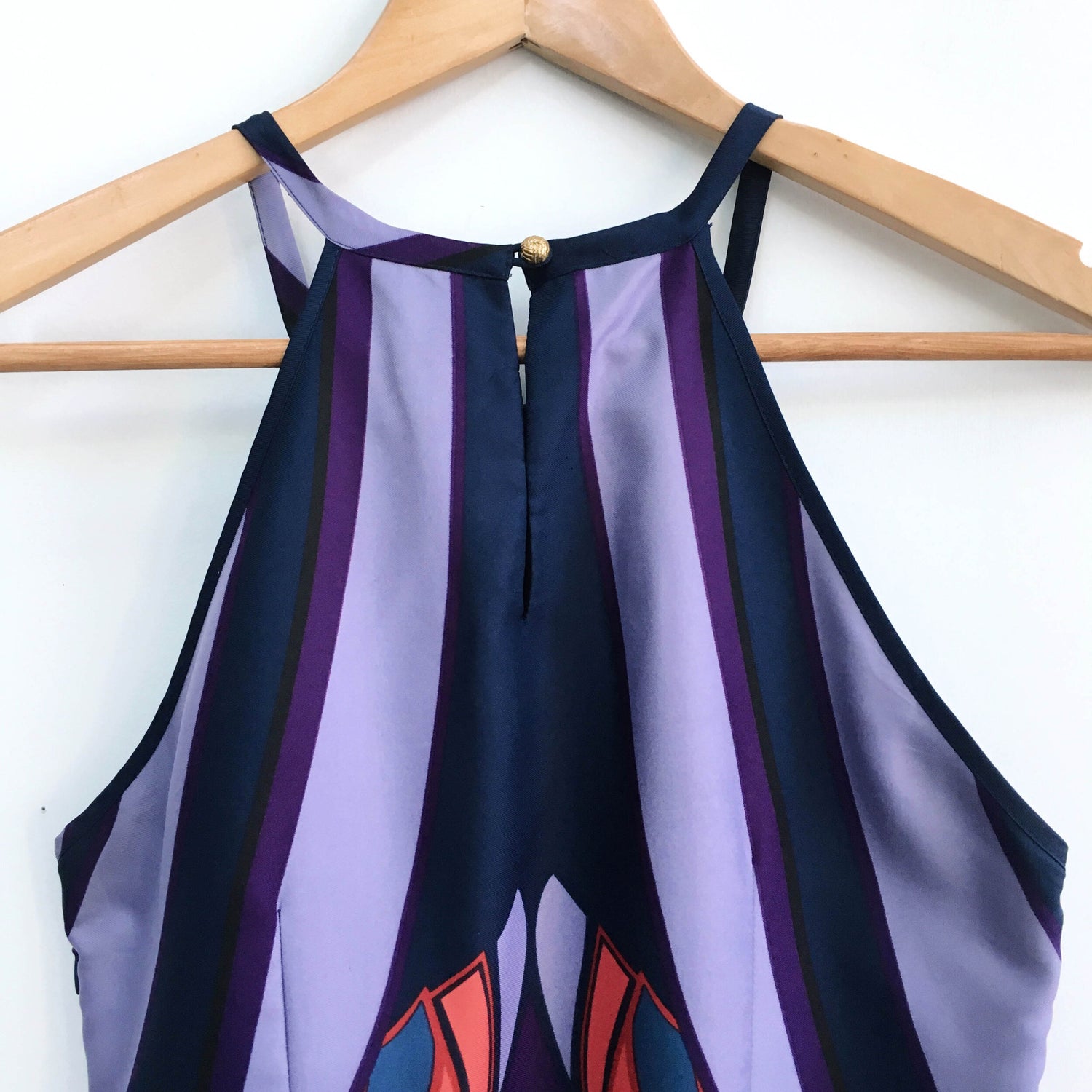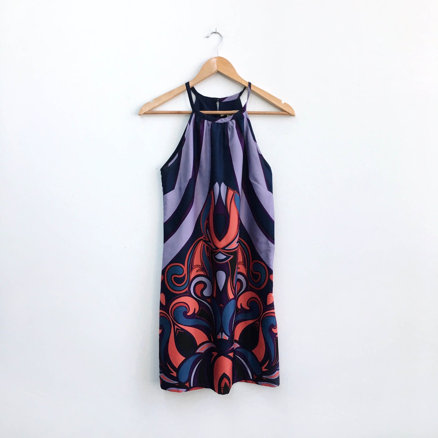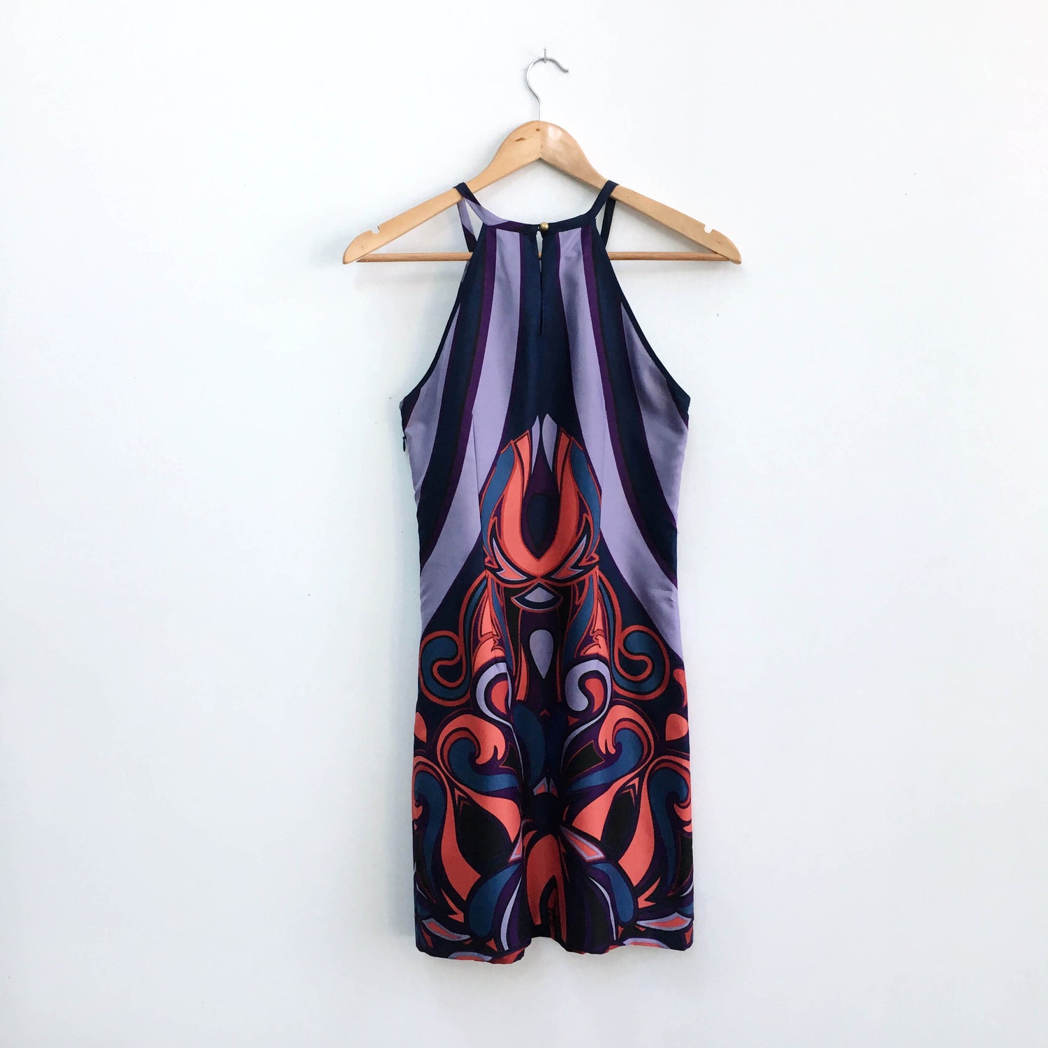 Item Description: This vibrantly colourful mini dress from Banana Republic features a high neck with keyhole back and gold button closure, and a side zipper. 100% polyester