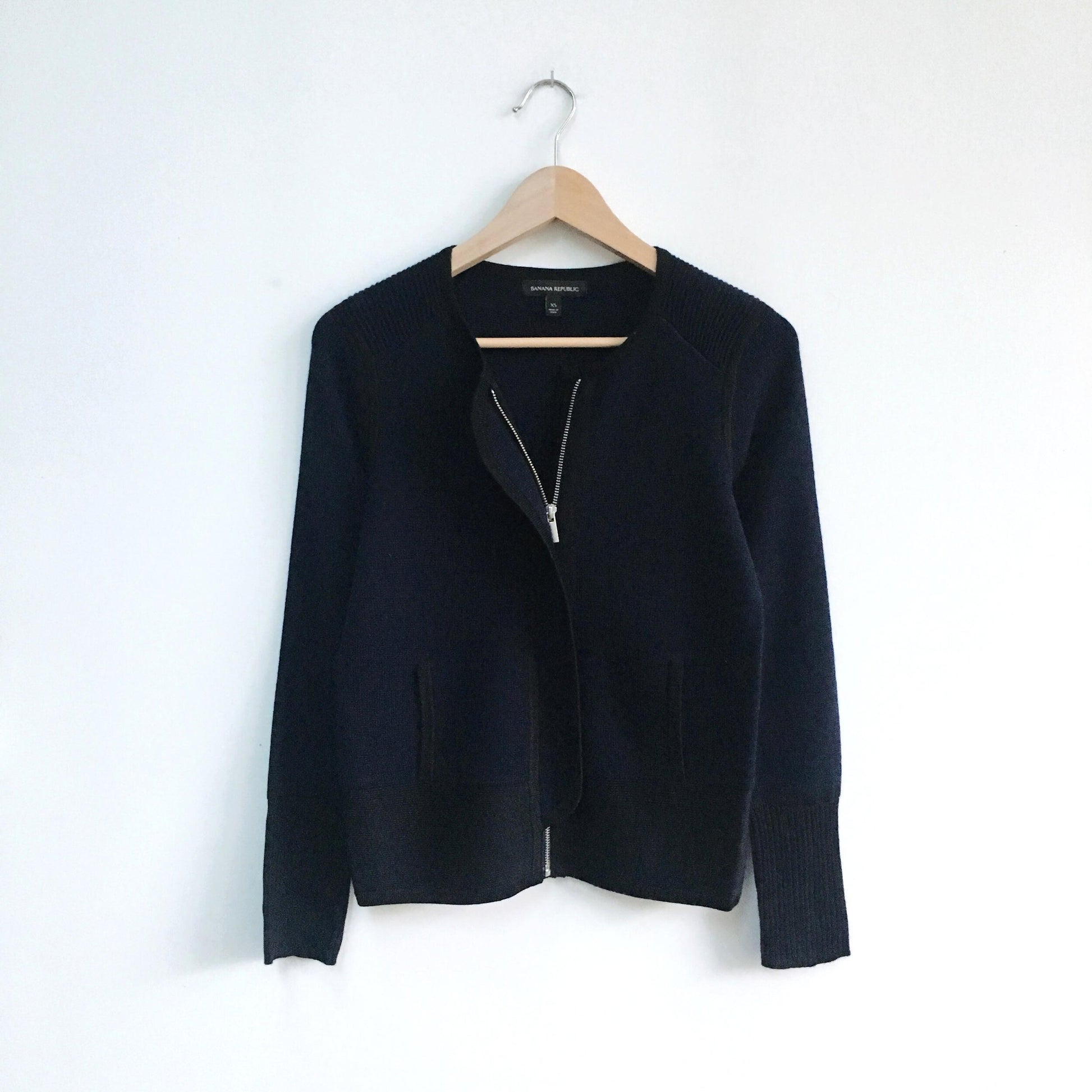 Item Description: This stunning wool sweater jacket from BR features a contrast black trim, hidden zipper and ribbed shoulder detail. 60% extra fine merino wool 40% nylon