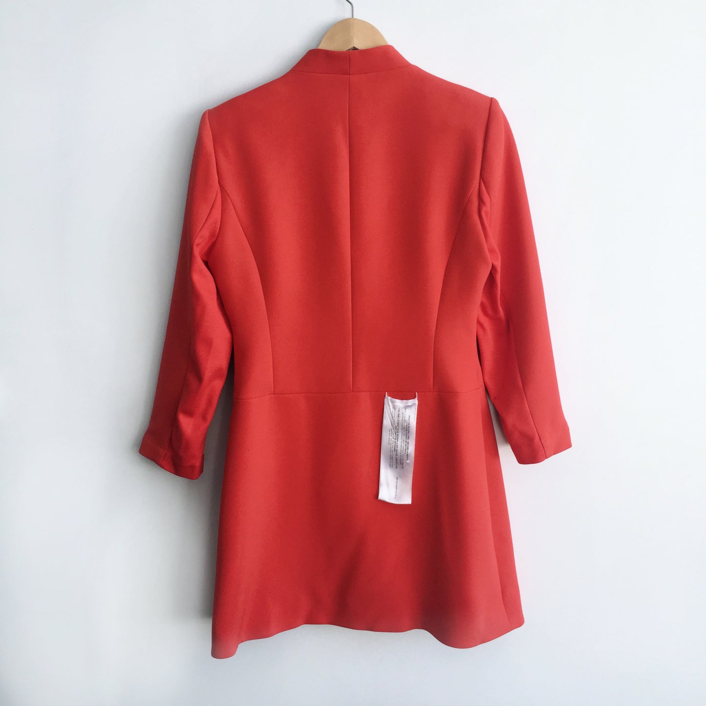 - Shawl collar - Surplice V-neckline - Long sleeves - Shoulder pads - Princess seams - A-line skirt - Hits above the knee - Double-breasted button-front closure - Self: Polyester, Rayon, Spandex double face - Contrast: Rayon, Nylon, Spandex ponte - Lining: Polyester.