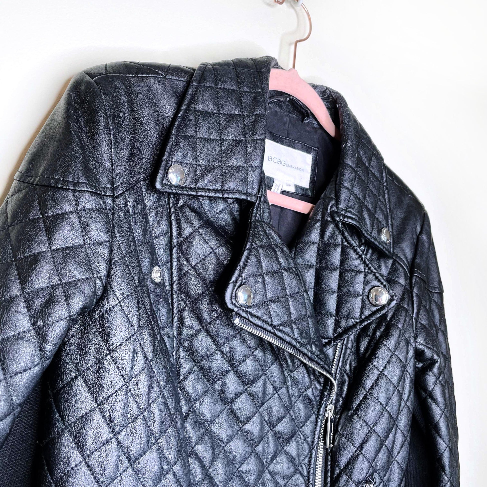Item Description: A fitted jacket of quilted faux leather revs up with vintage motorcycle details, including a snap-down collar, asymmetrical zip closure and zip-vented sleeves in this BCBGeneration number. Stretch panels under the sleeves give room to breathe and move. 100% polyurethane