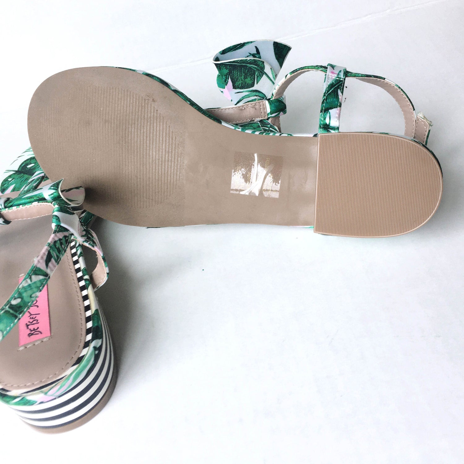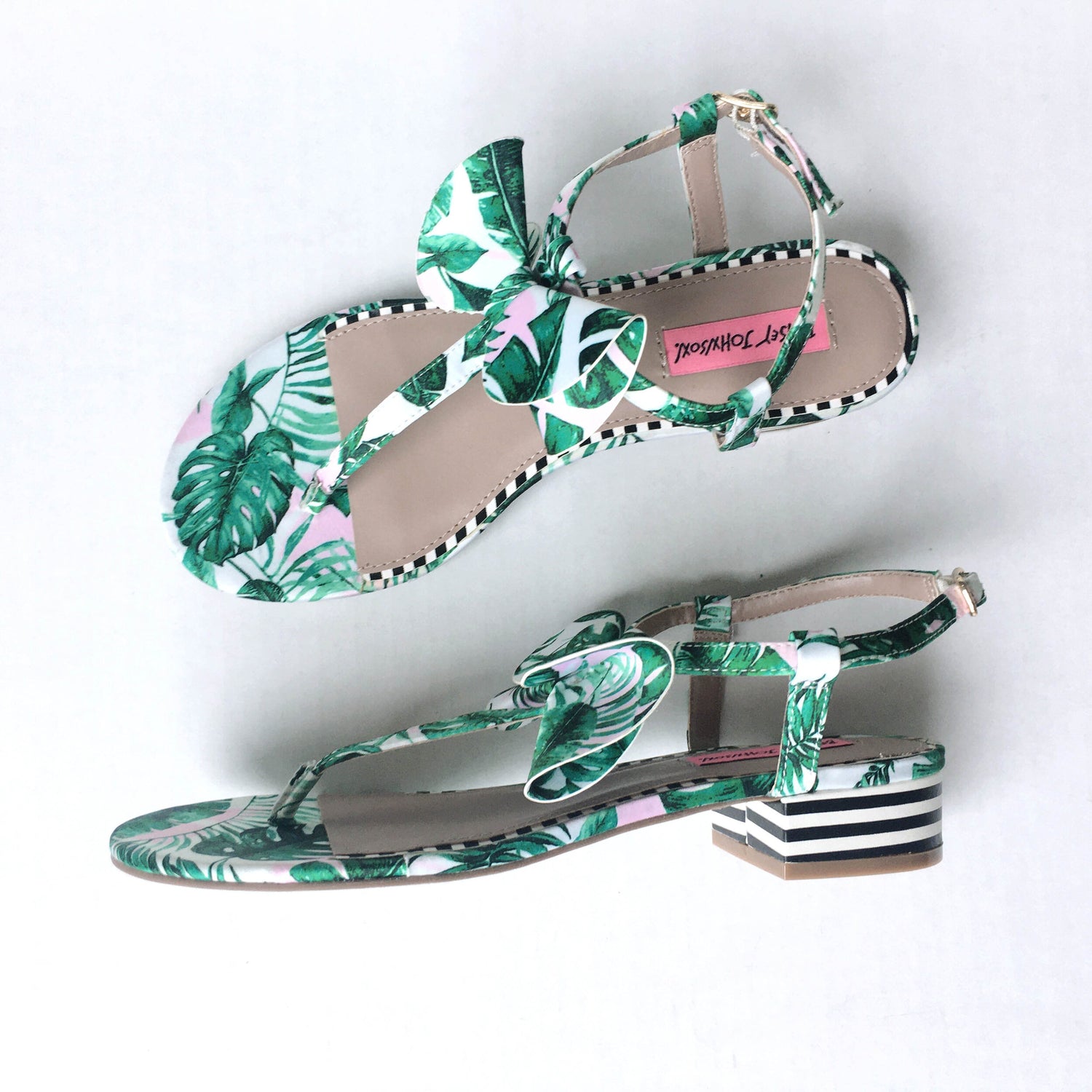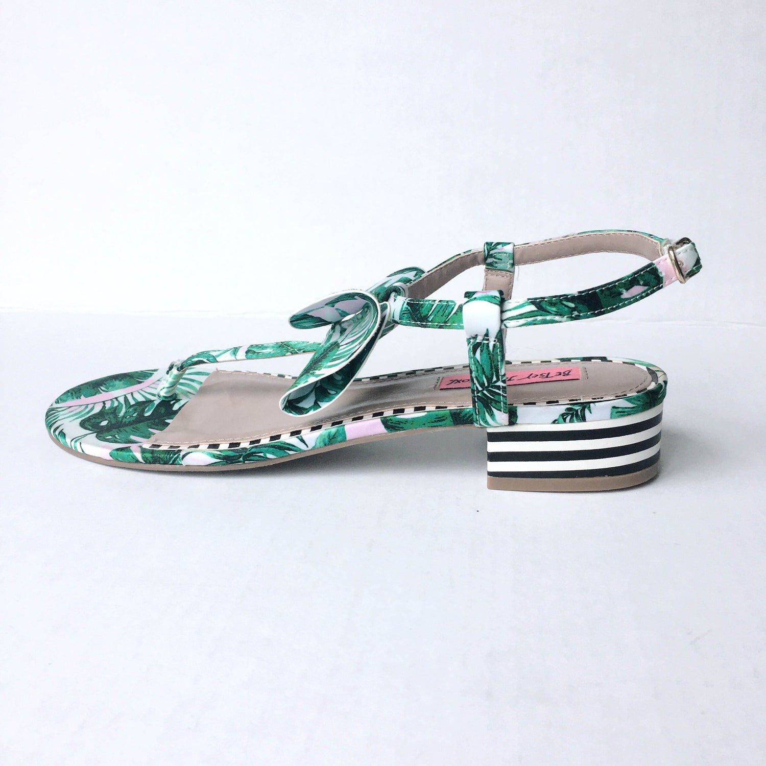 Item Description: Betsey Johnson always delivers on a good time - these tropical thong sandals feature a pretty bow topper and striped heel.