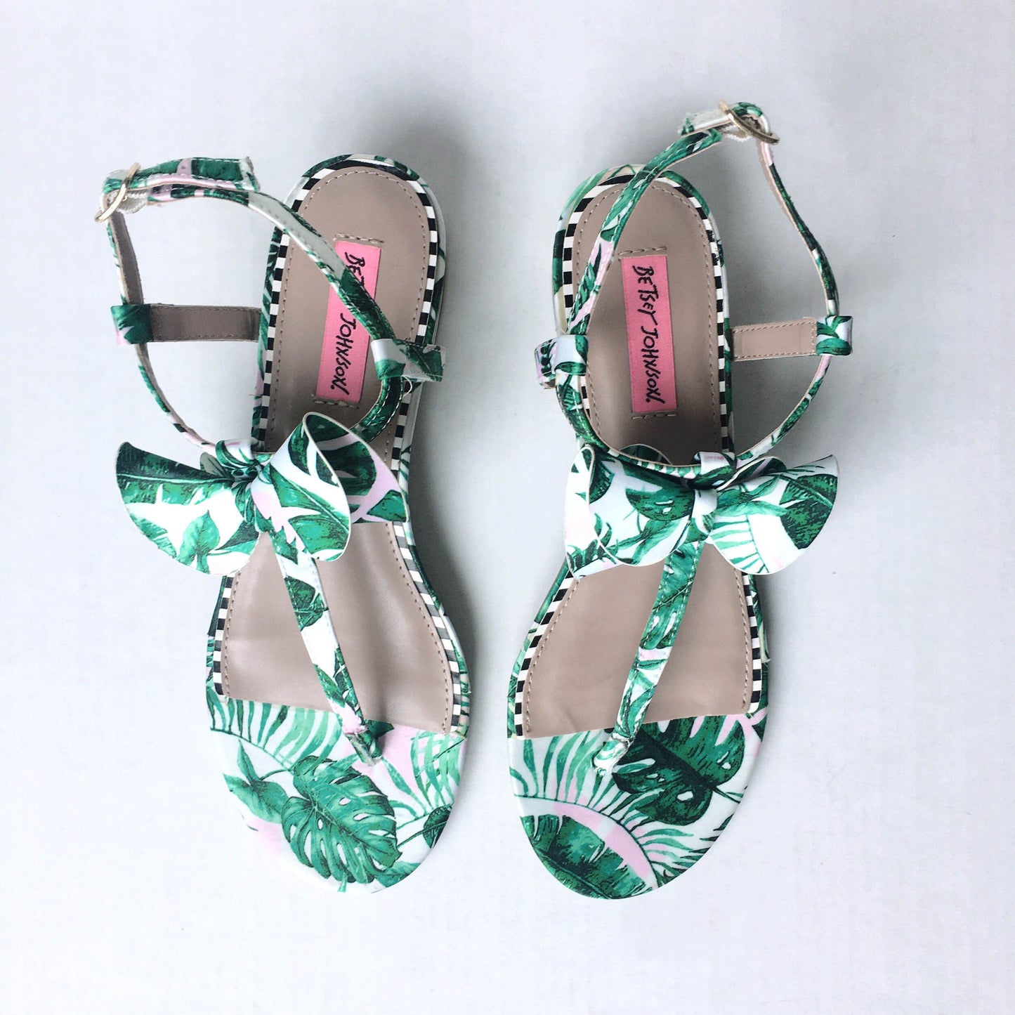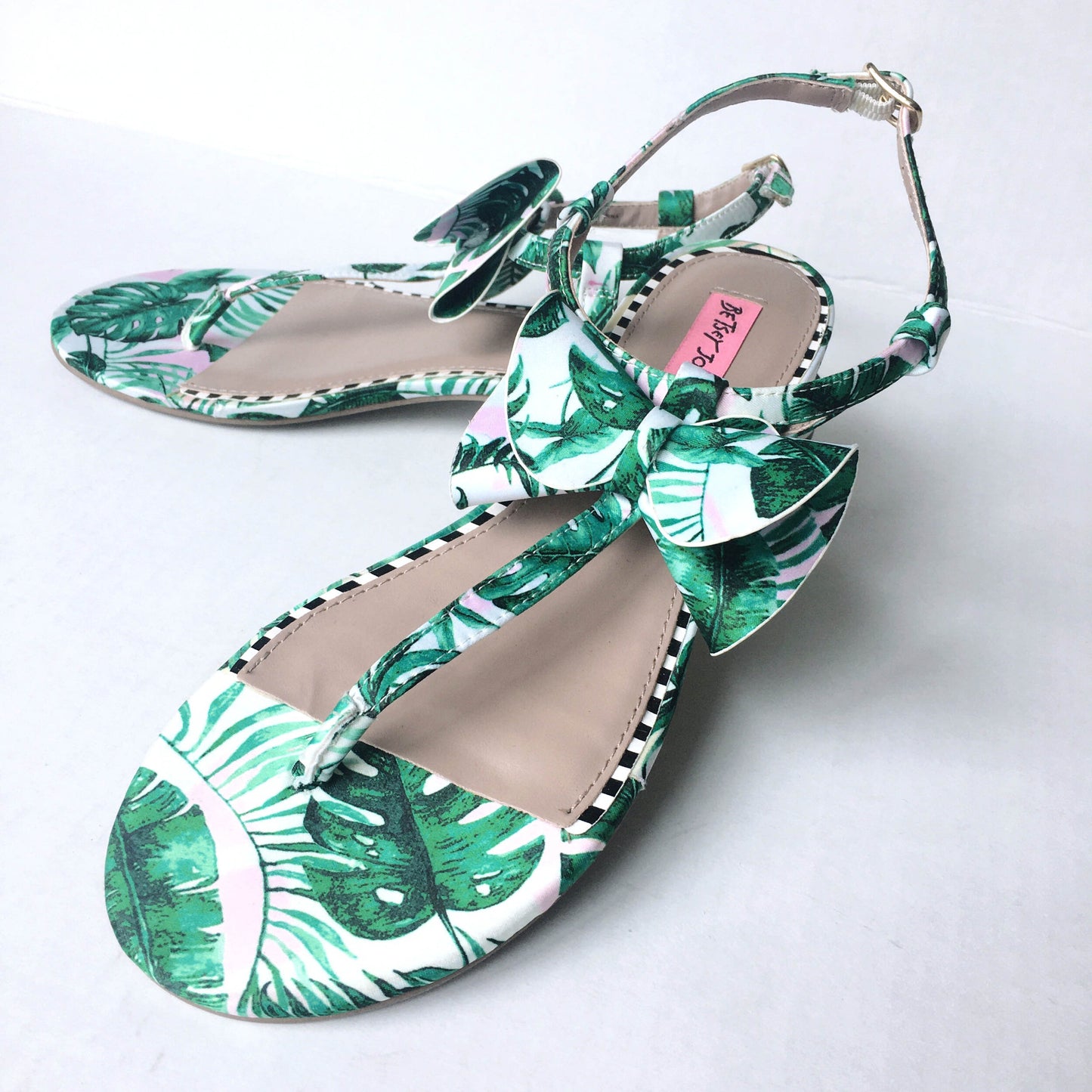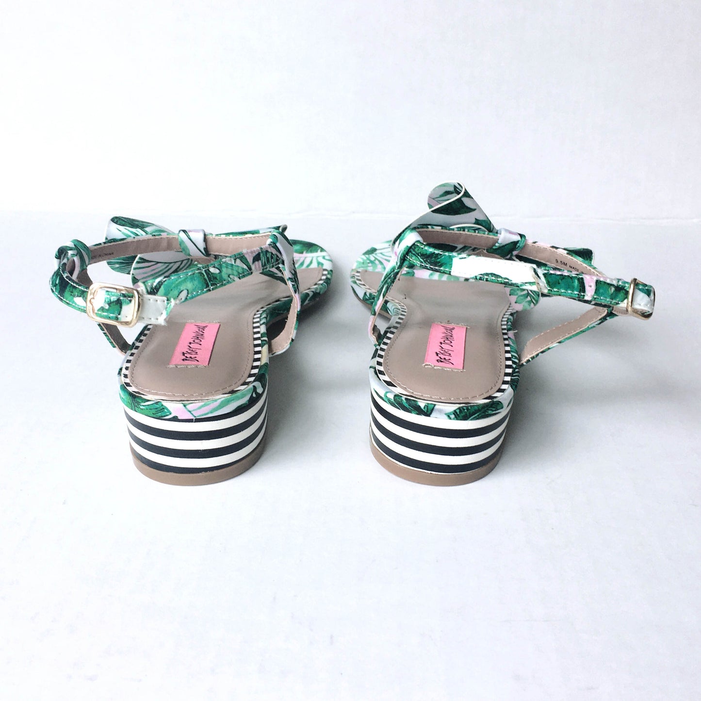 Item Description: Betsey Johnson always delivers on a good time - these tropical thong sandals feature a pretty bow topper and striped heel.