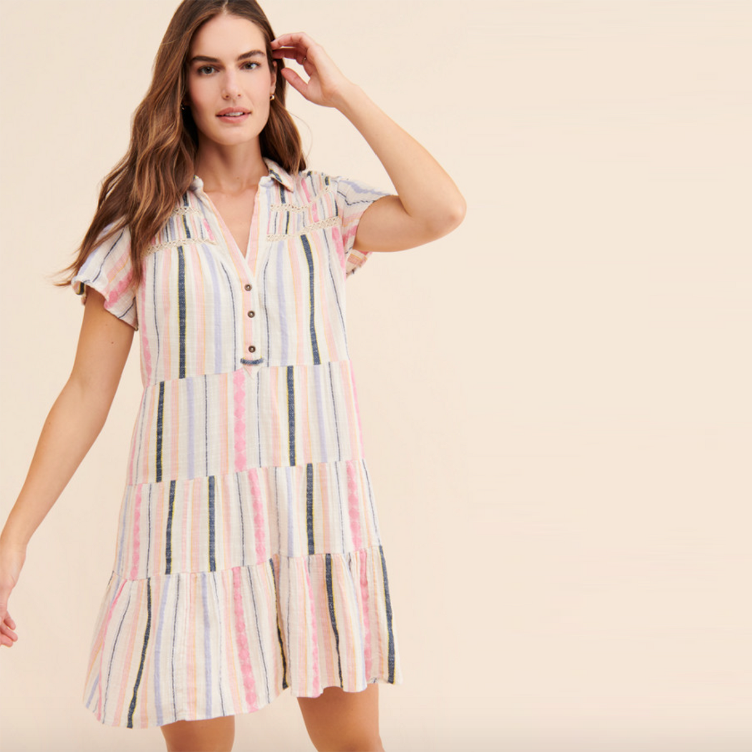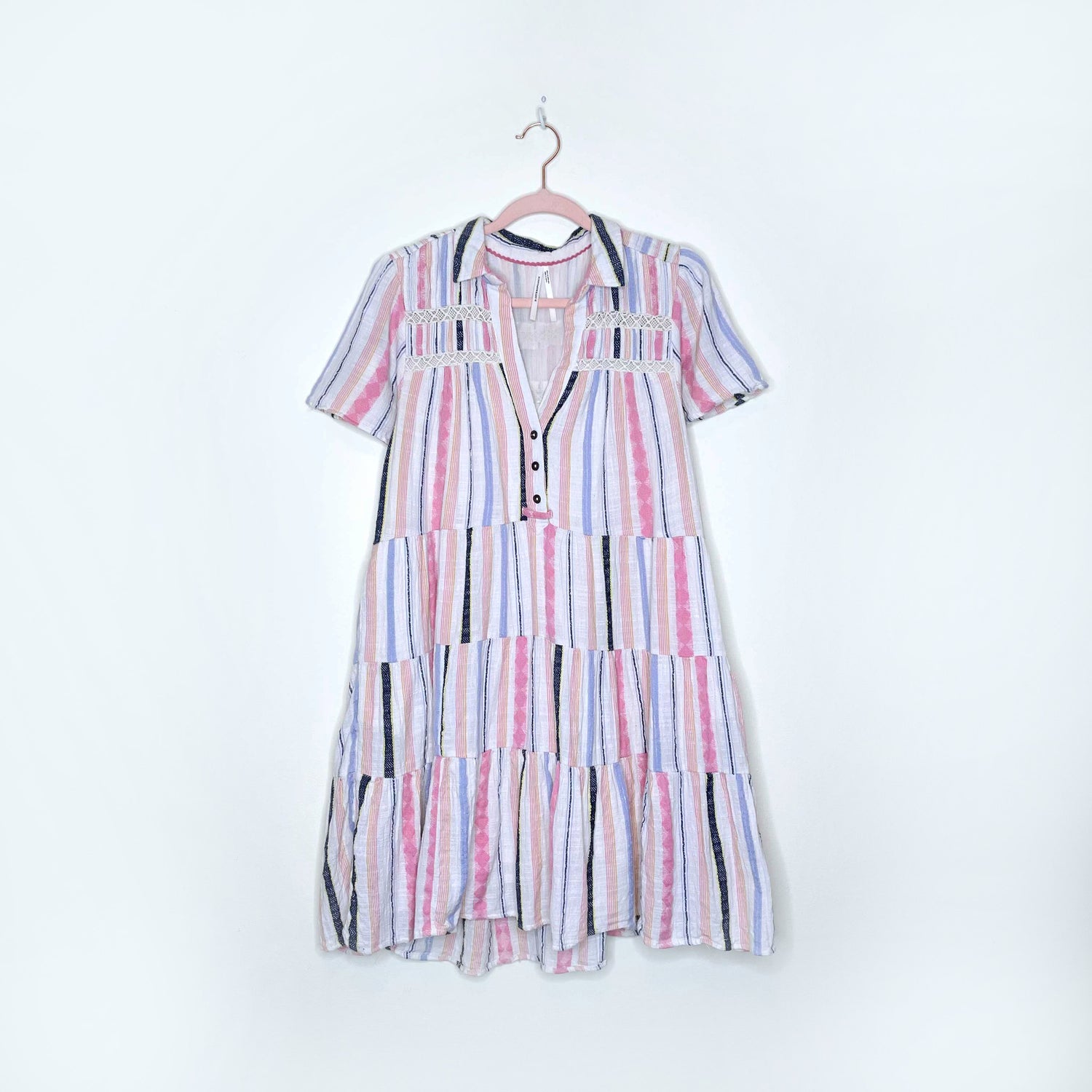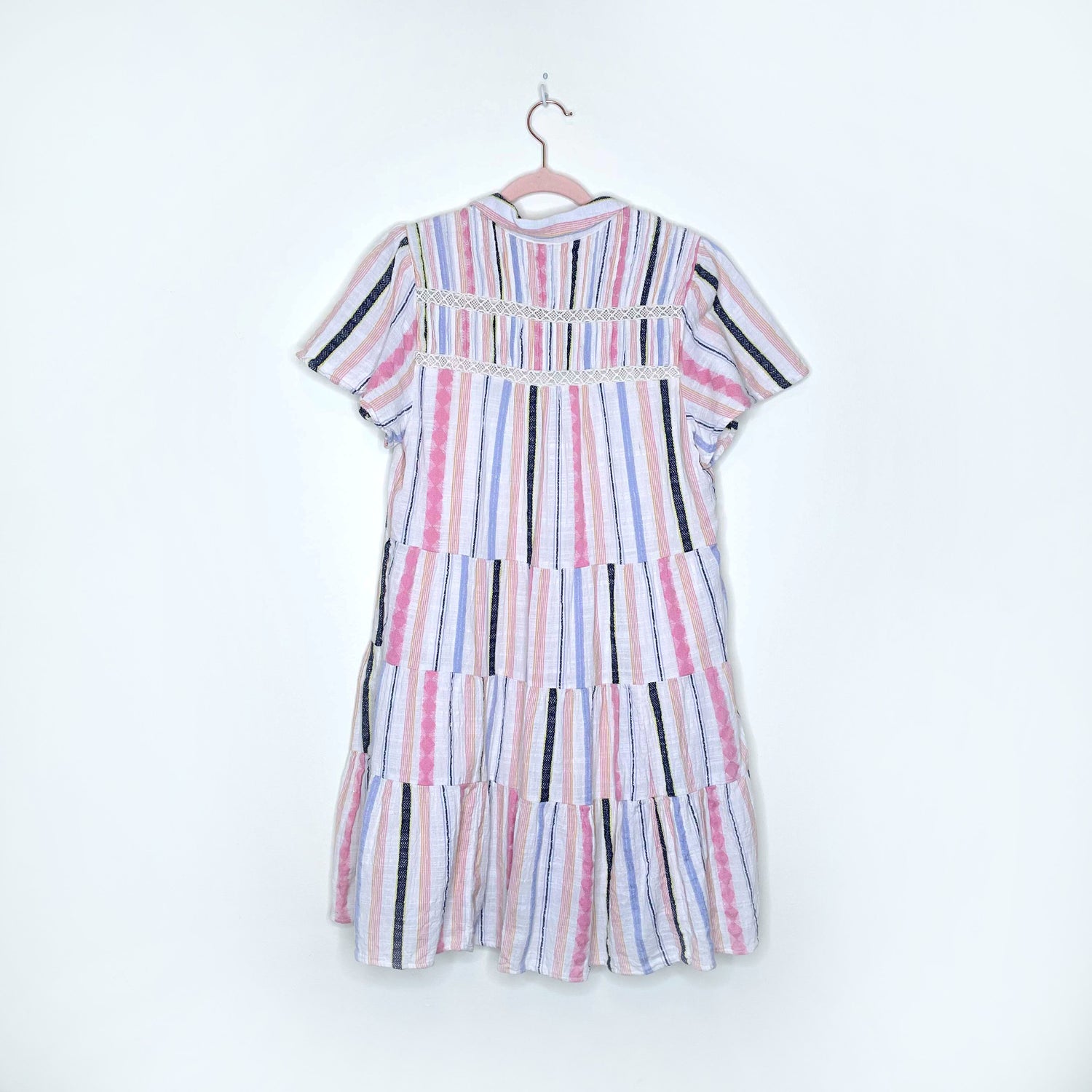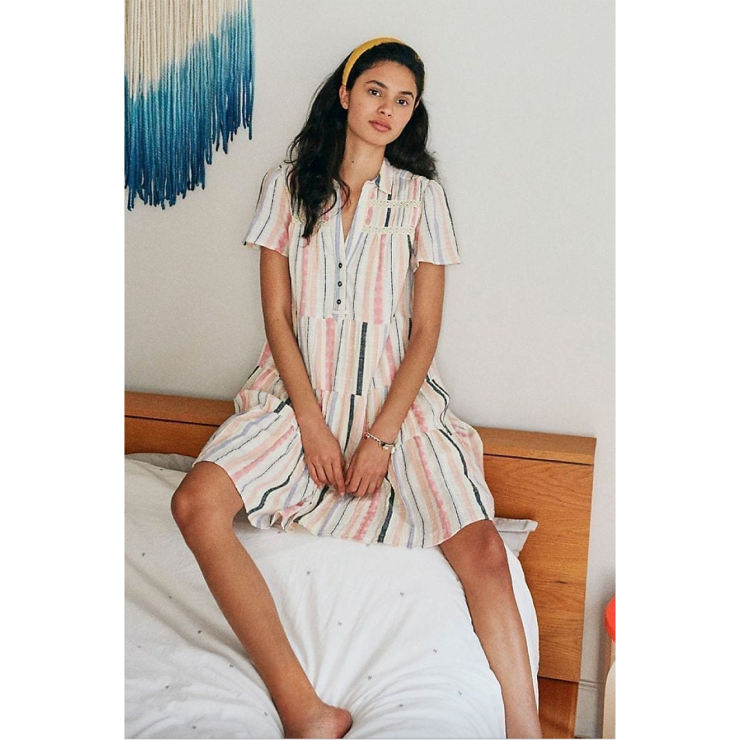 Item Description: This coveted tiered shirtdress from Anthropologie features a natural, woven aesthetic with short sleeves and a swing hem. Lined. 100% cotton