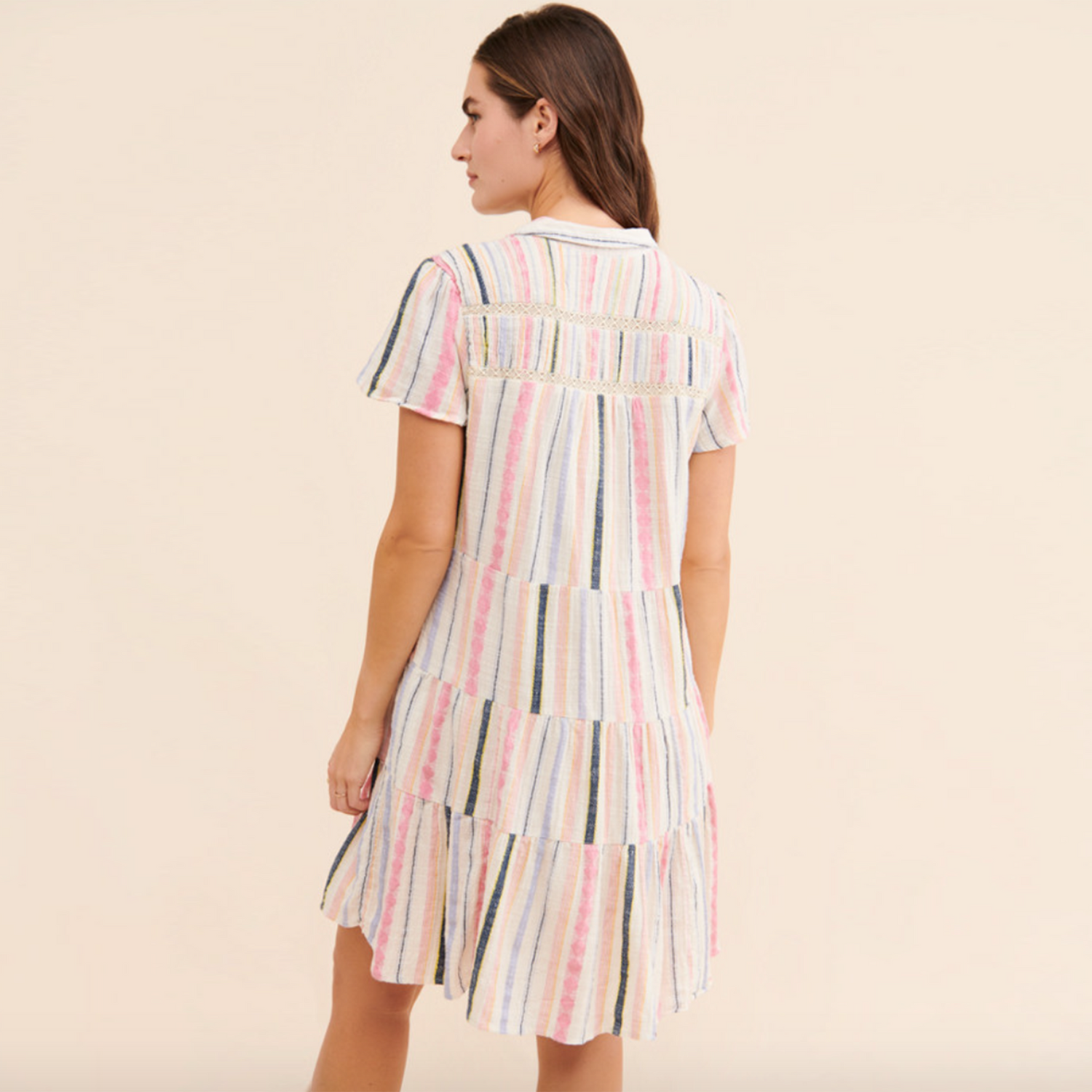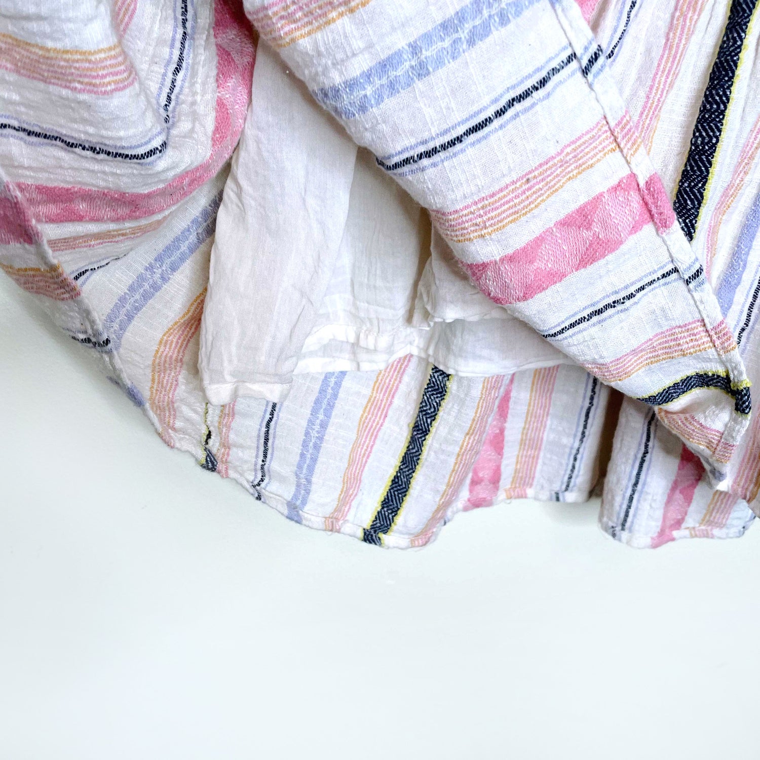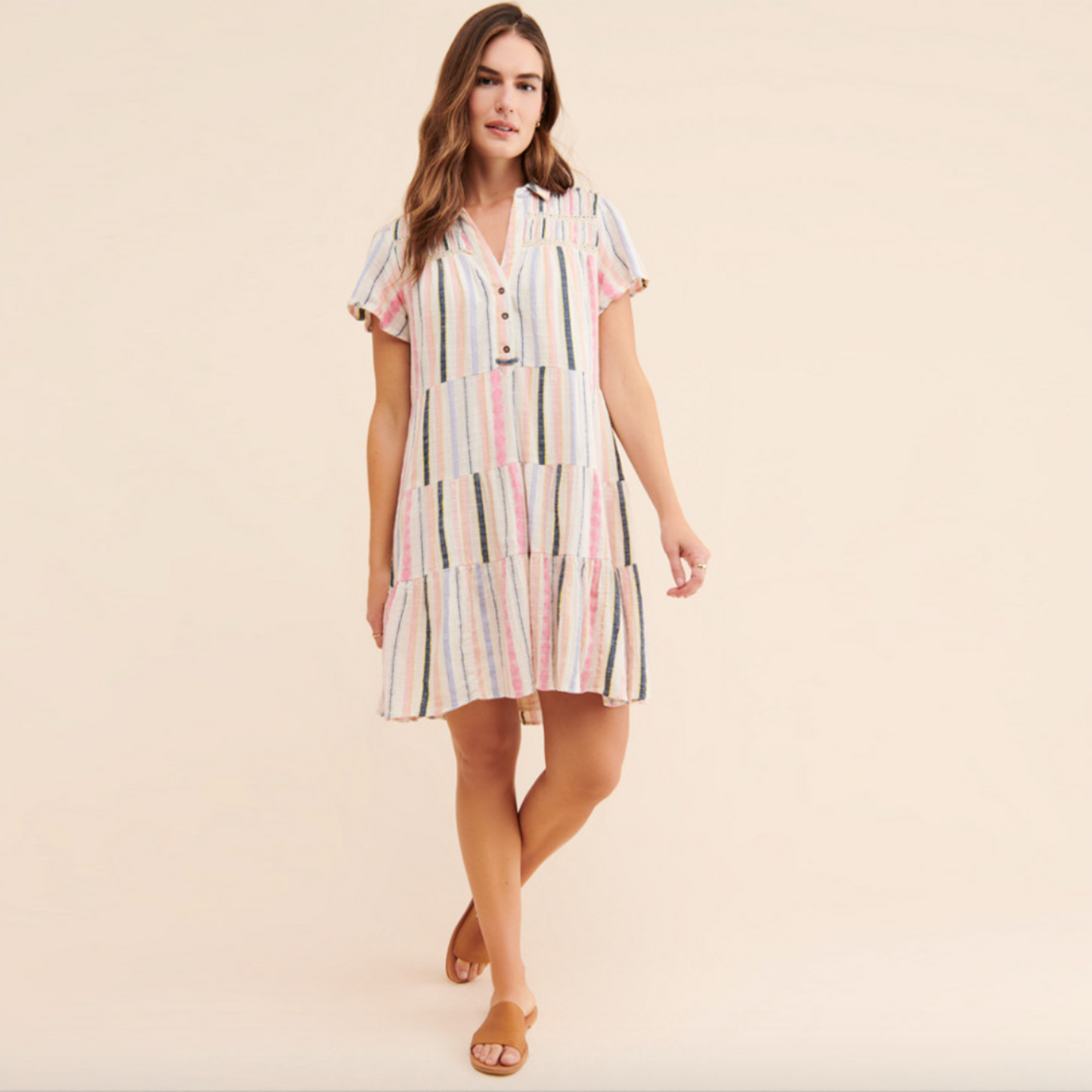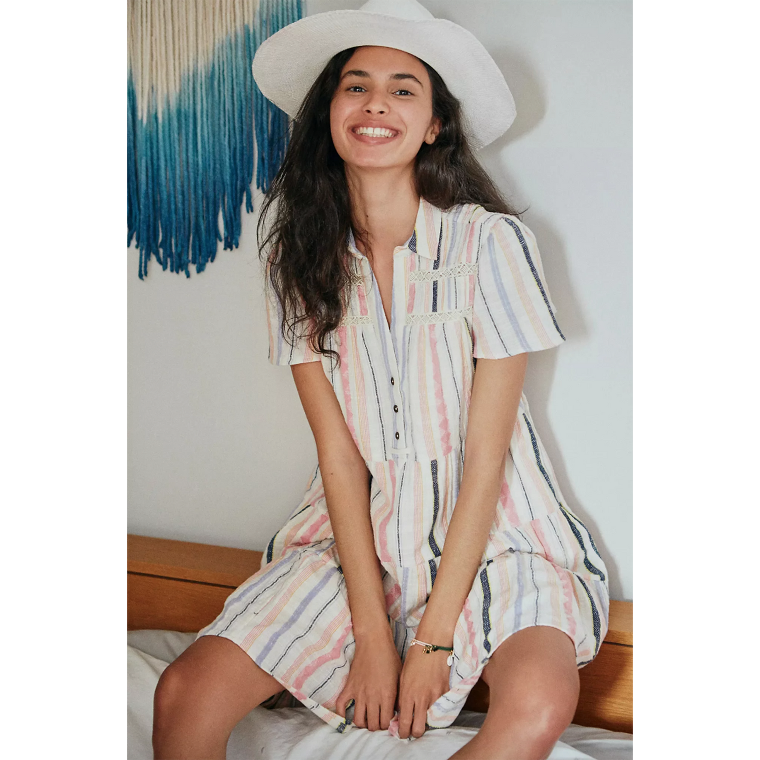 Item Description: This coveted tiered shirtdress from Anthropologie features a natural, woven aesthetic with short sleeves and a swing hem. Lined. 100% cotton