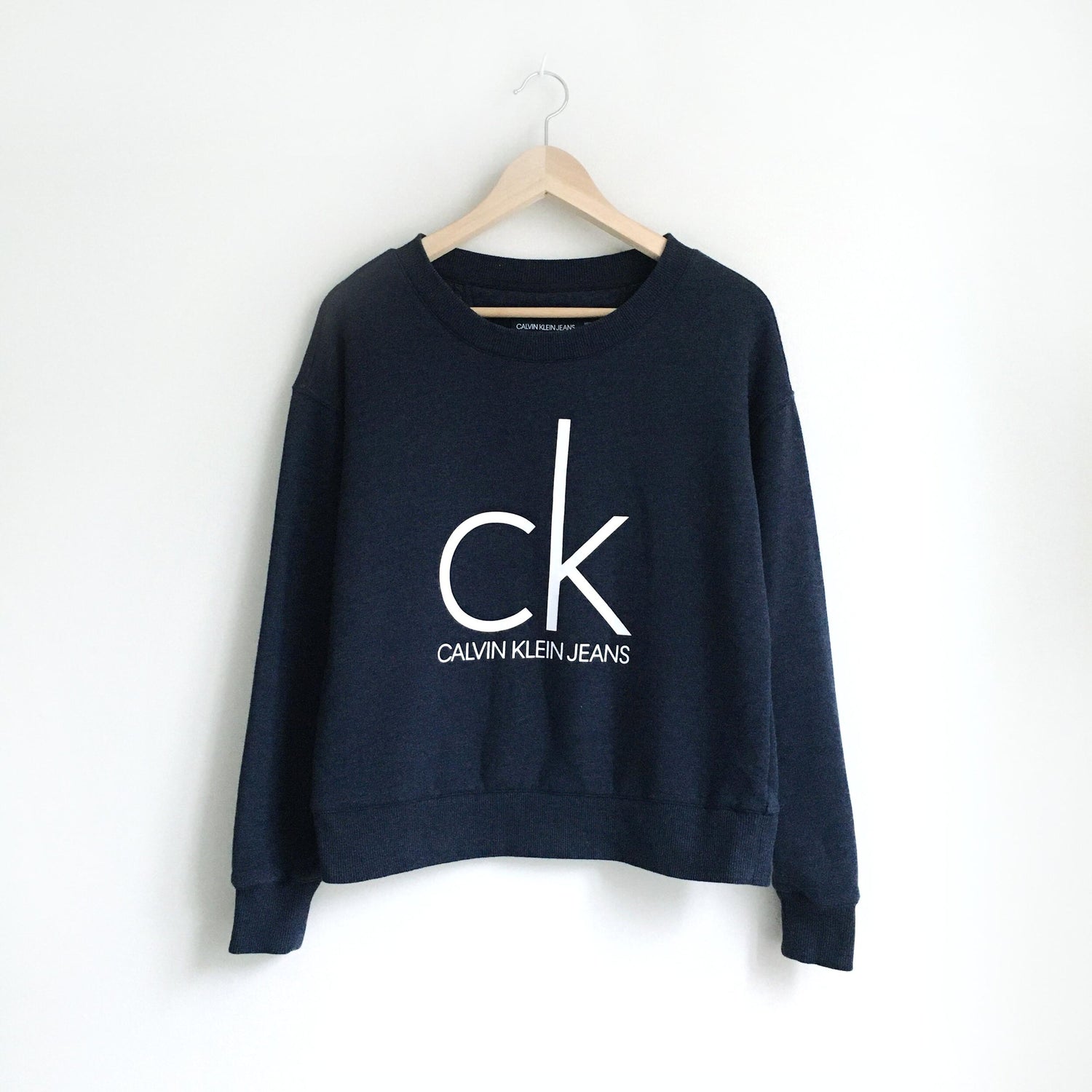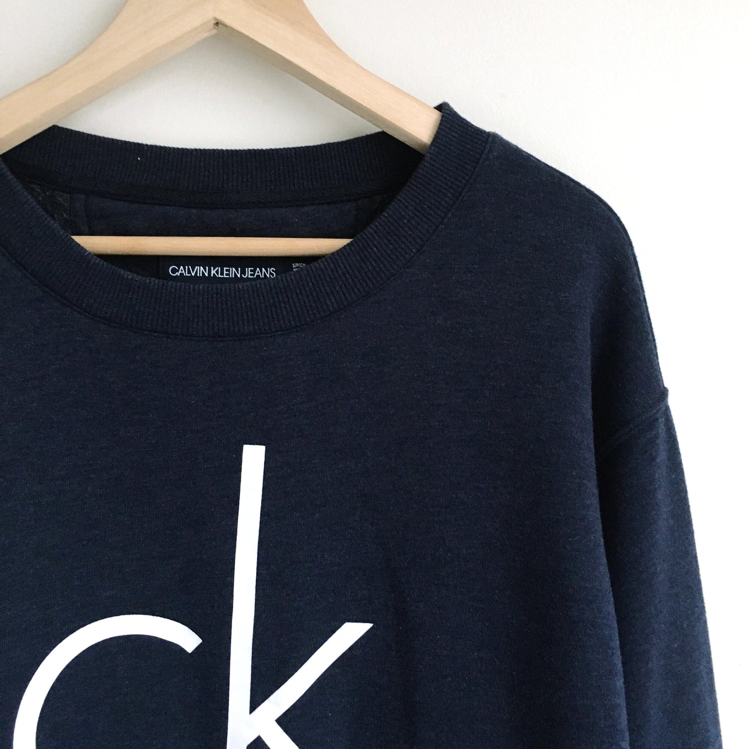 Item Description: This classic crewneck from Calvin Klein features a white ck logo graphic front and overall navy heather body. 55% cotton 45% polyester
