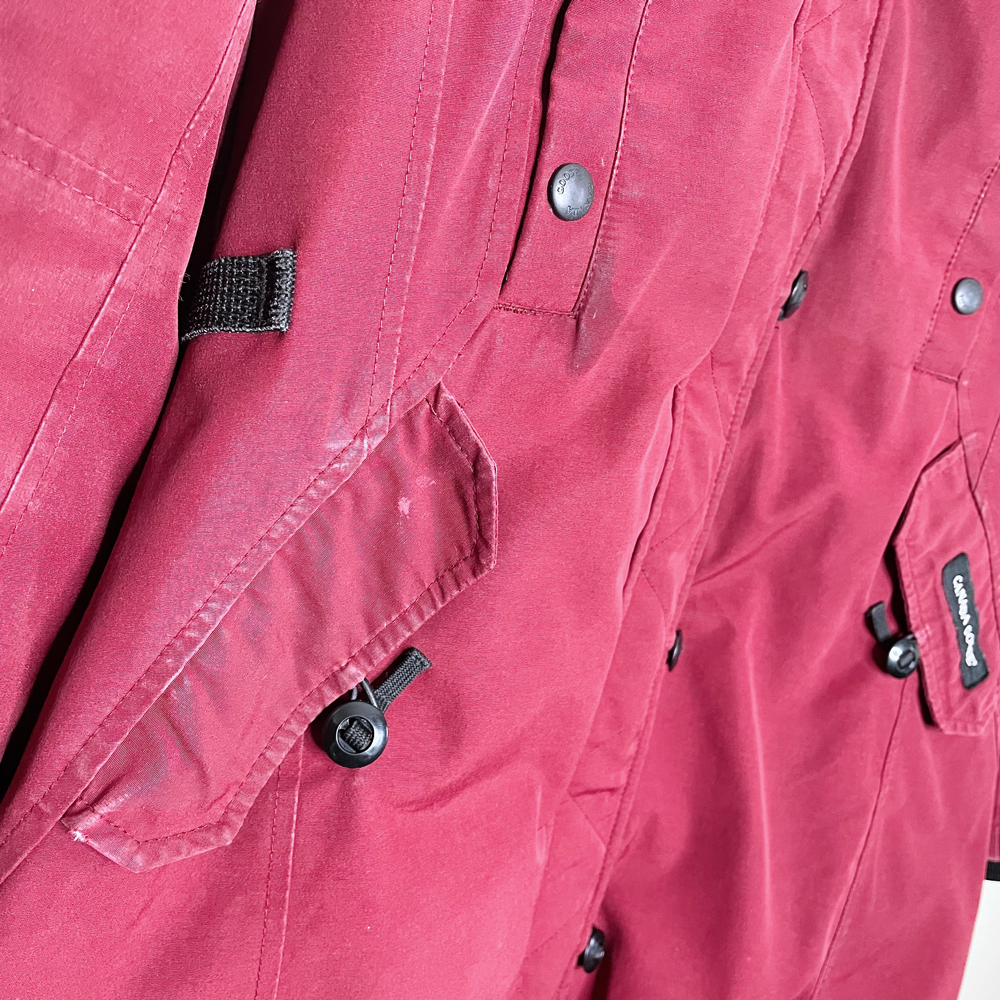 Item Description: This older model parka from Canada Goose features a puffer inside, with expedition-style shell outside. Knee-length silhouette keeps the bitter cold out, with three snaps at the calves for easier walking during those treks, and a faux-fur lined hood keeps you cozy. Shell: 85% polyester 15% cotton Fill: 100% white duck down