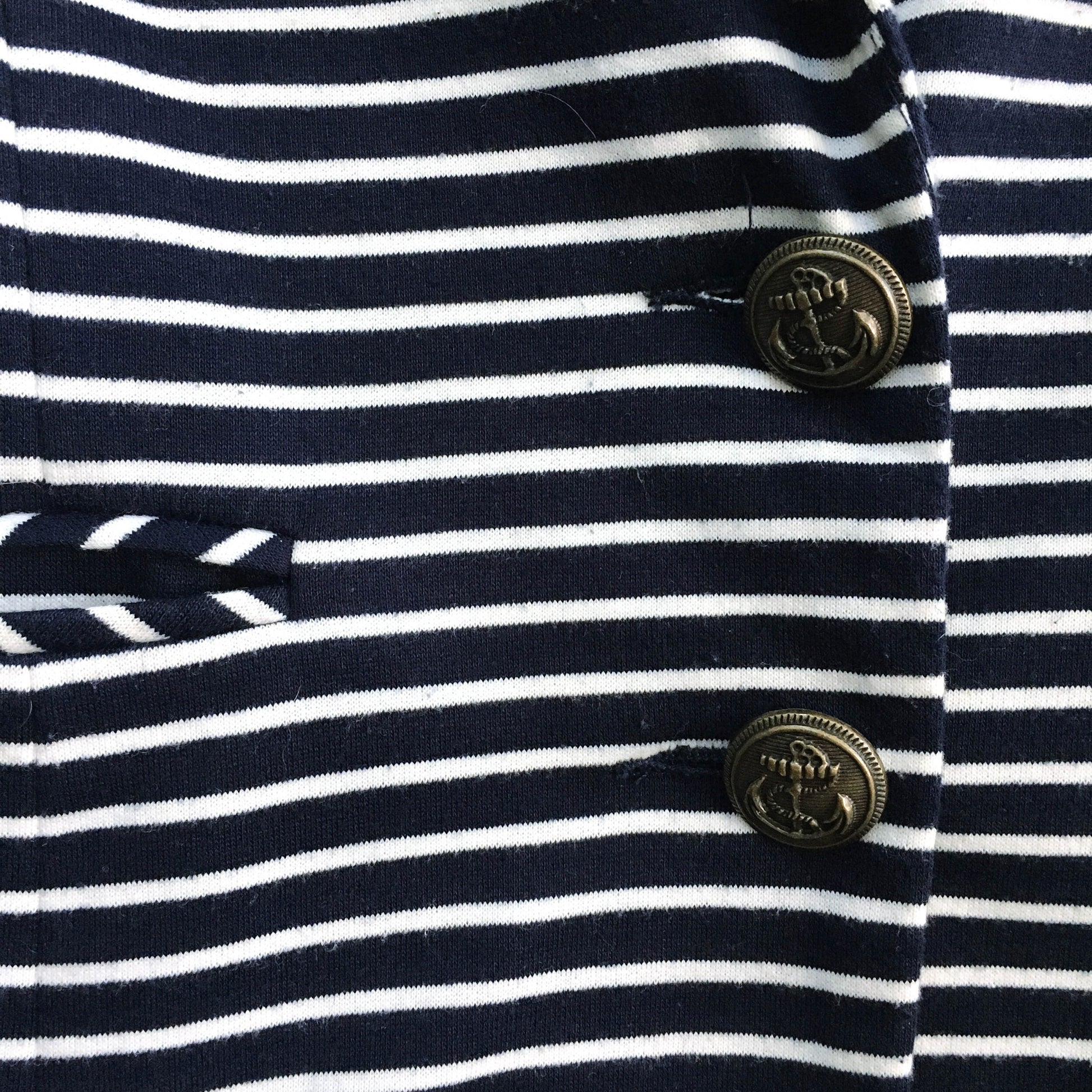 Item Description: This awesome stretch-knit striped blazer from Anthropologie features nautical metal buttons and a rolled cuffs. Easy to wear, easy to care. 65% rayon 35% polyester lining 100% cotton