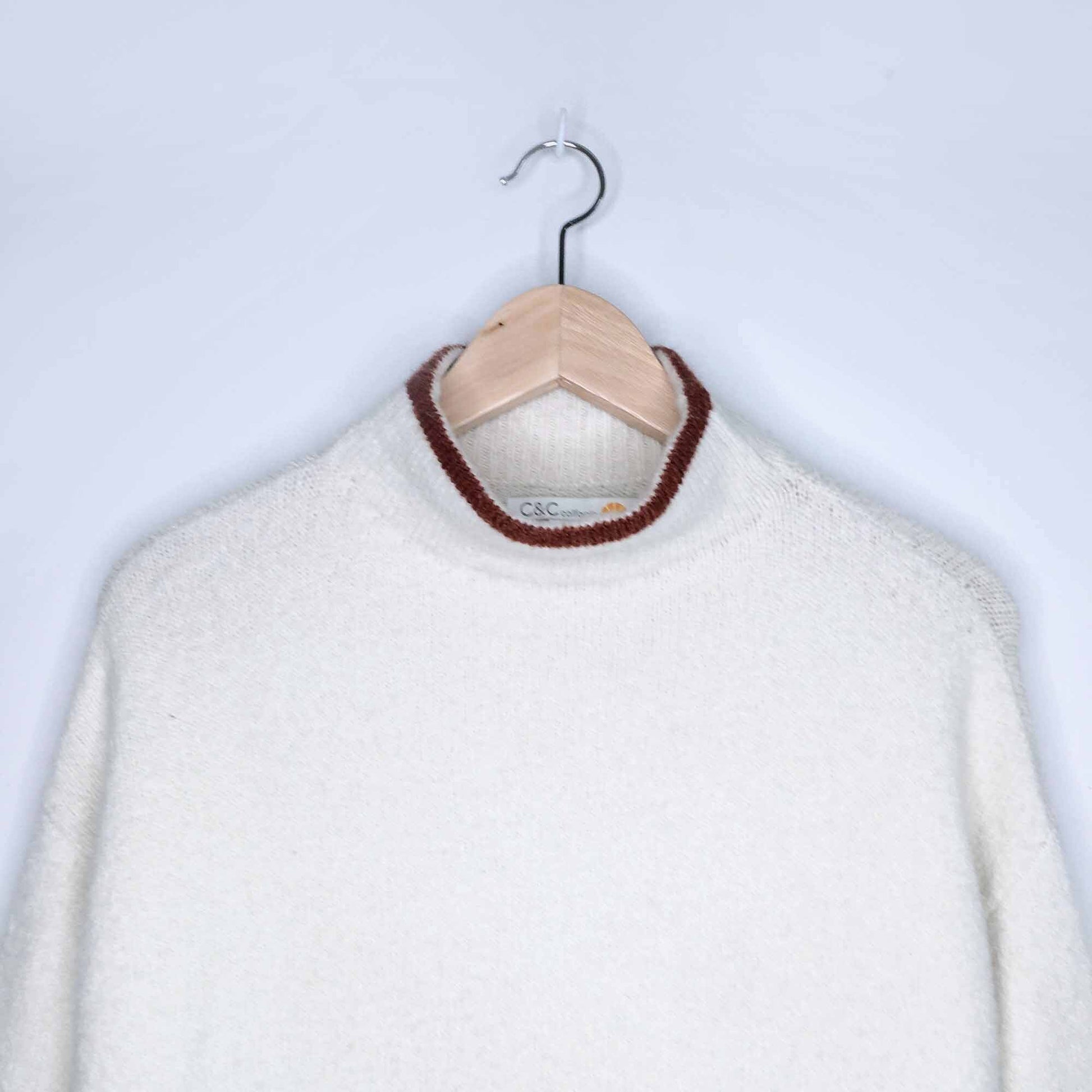 Item Description: This ultra soft and cozy wool-blend sweater from C&C California features a colour block striped sleeve and all the 70’s vibes. 39% acrylic 31% nylon 28% merino wool 2% spandex