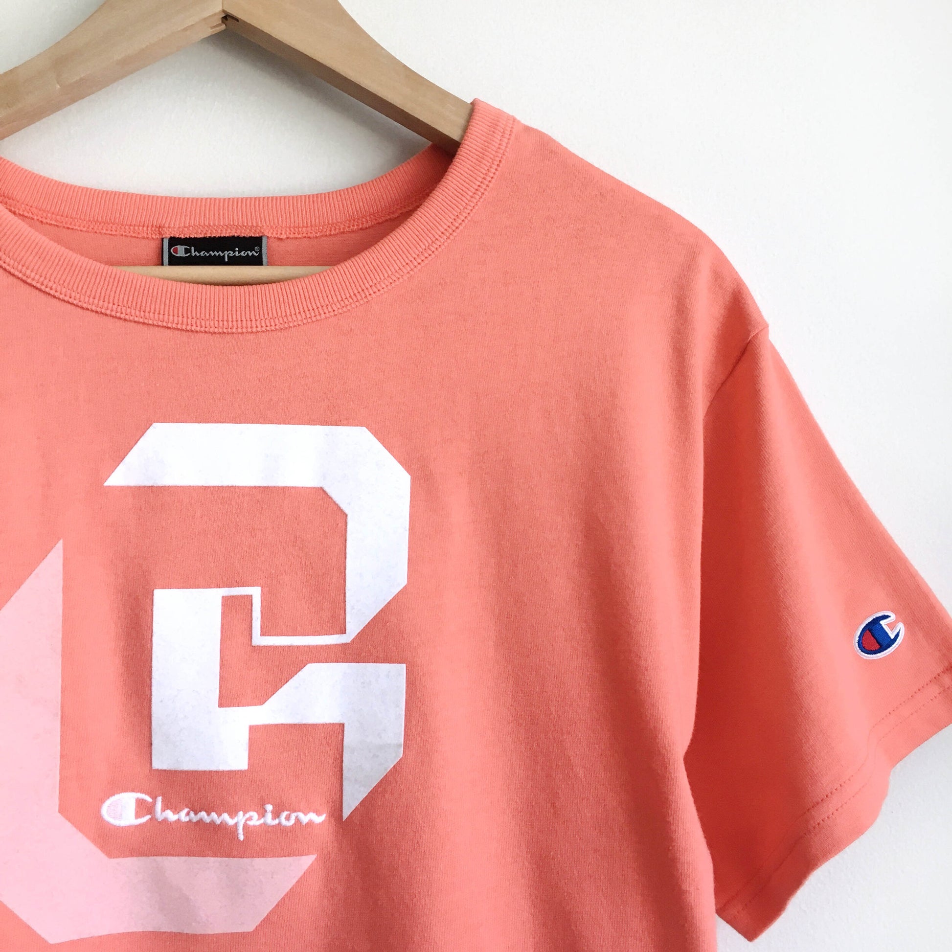 Item Description: This summer coral cropped tee from Champion features the shadow C graphic front with embroidered logo and embroidered C logo sleeve. 100% cotton