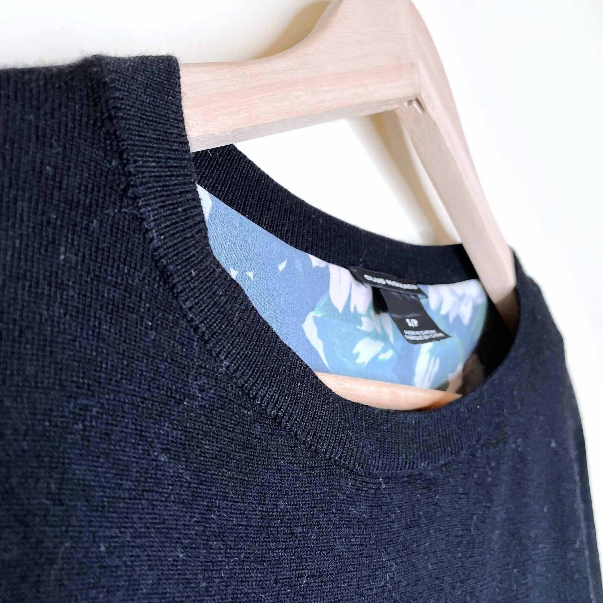 Item Description: Artfully layered with adorable covered buttons details. A burst of floral peeks out from a classic merino sweater. Merino wool sweater with floral poly lining.