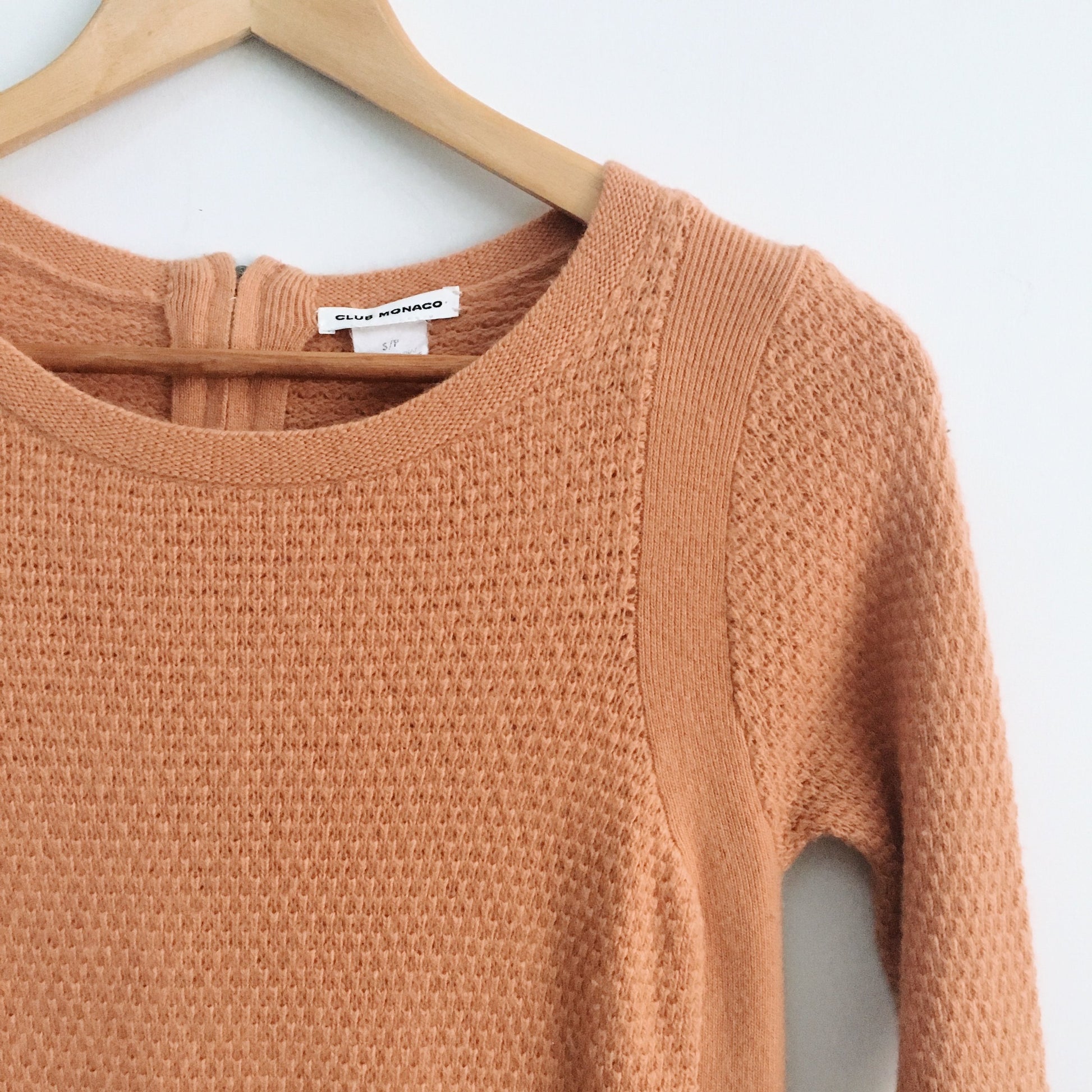 Item Description: A soft cashmere/wool/angora blend sweater dress from Club Monaco with leather elbow patches and back zipper in ‘orange creamsicle’. Fits more like an x-small.