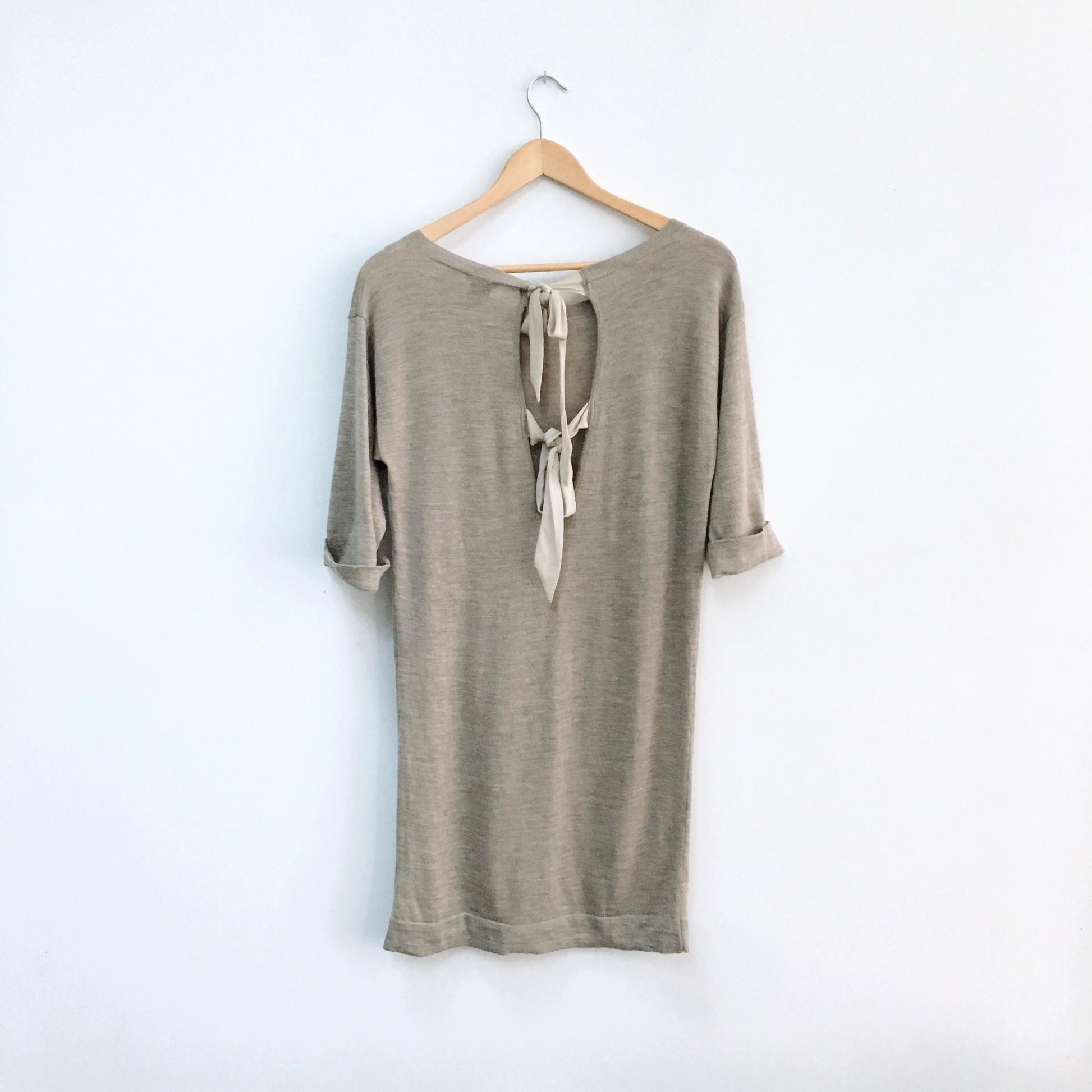 Item Description: The Catherine Sweater dress in Oatmeal is a wool jumper with two silk tie bow closures on the back, and cuffed sleeves. 100% wool body and 100% silk ties