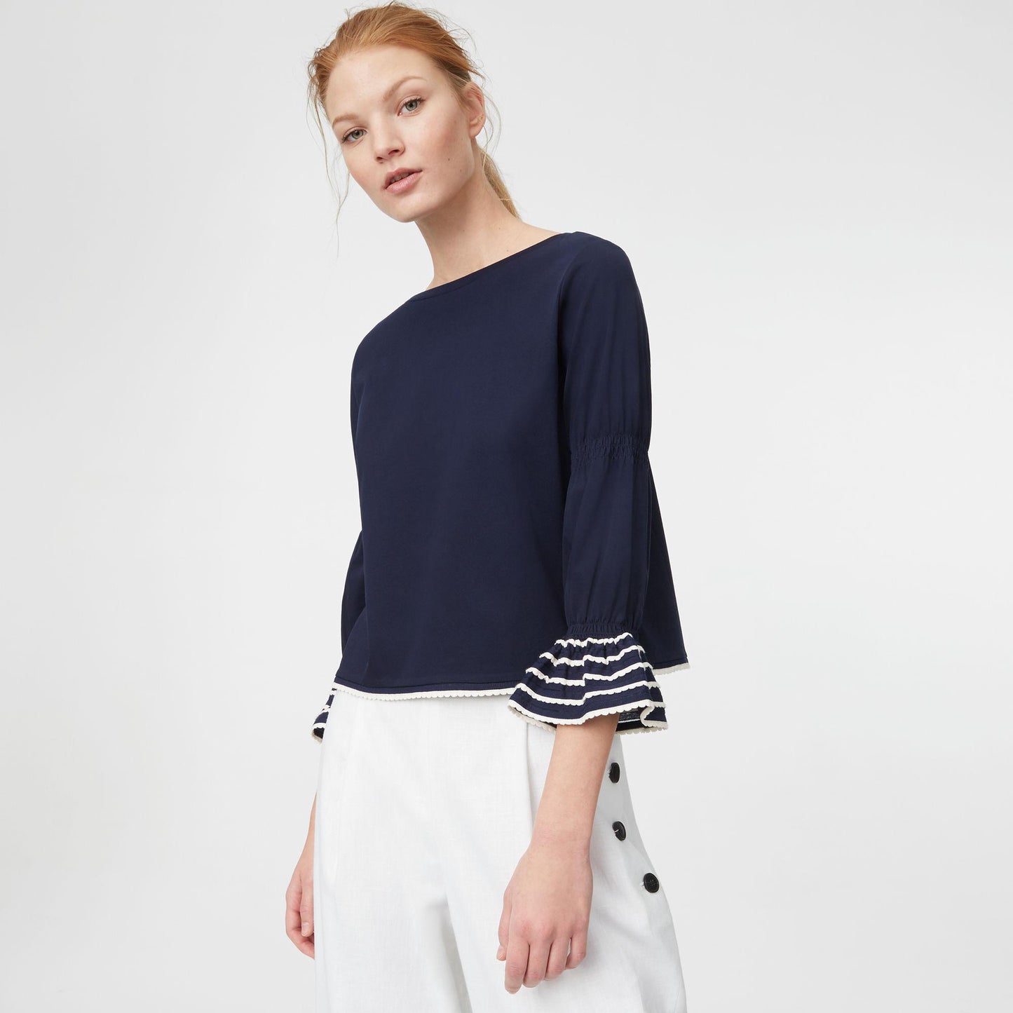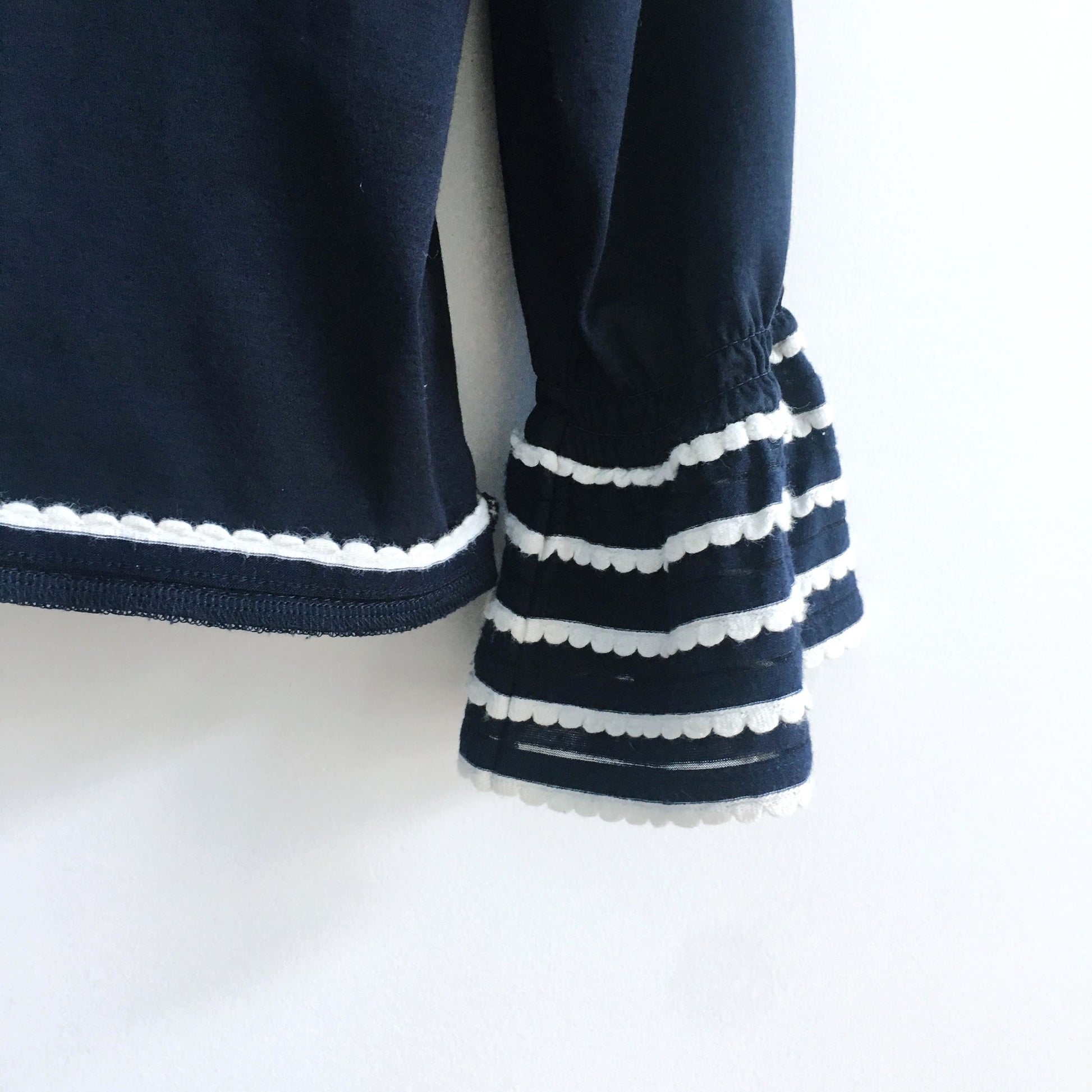 Item Description: This gorgeous top from Club Monaco is feminine meets comfort and style. A navy blue 3/4 sleeve top with elastic elbows, ruffle sleeves and white scallop trim.