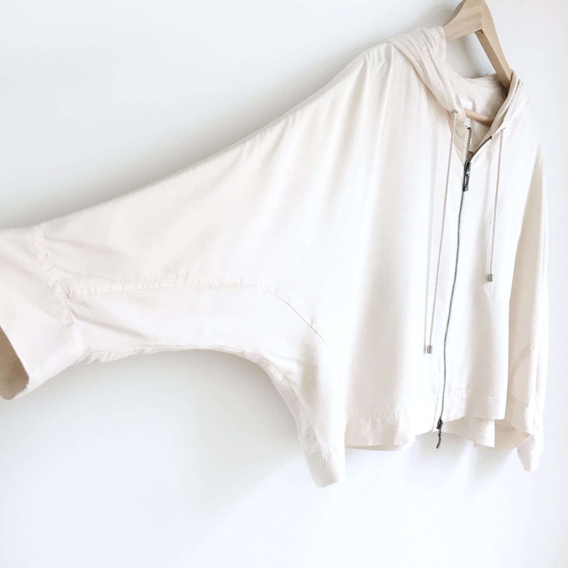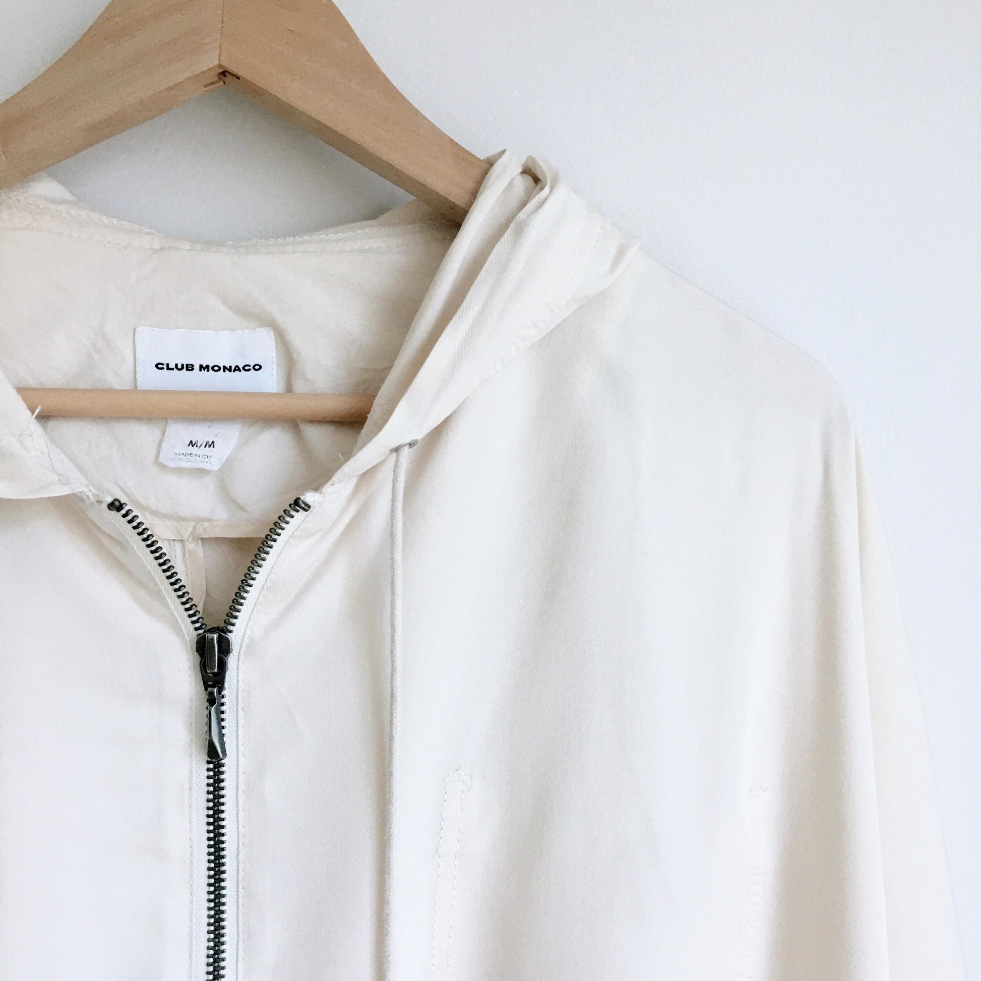 Item Description: This lightweight summer zip from Club Monaco features a cropped silhouette, dolman wing sleeves and a reverse front pocket with drawstring hood. 100% rayon