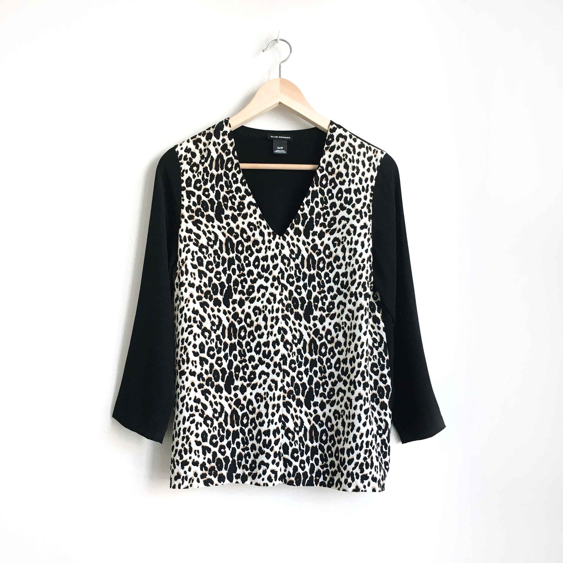 Item Description: This top is the cat’s meow. Club Monaco nails it with this v-neck leopard front silk blouse. 100% silk