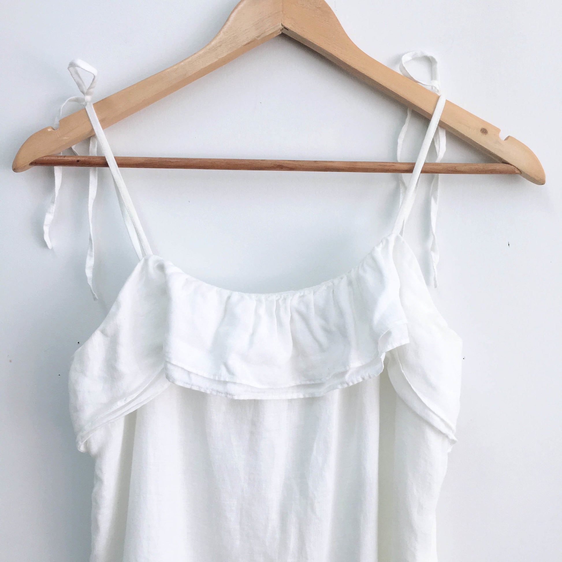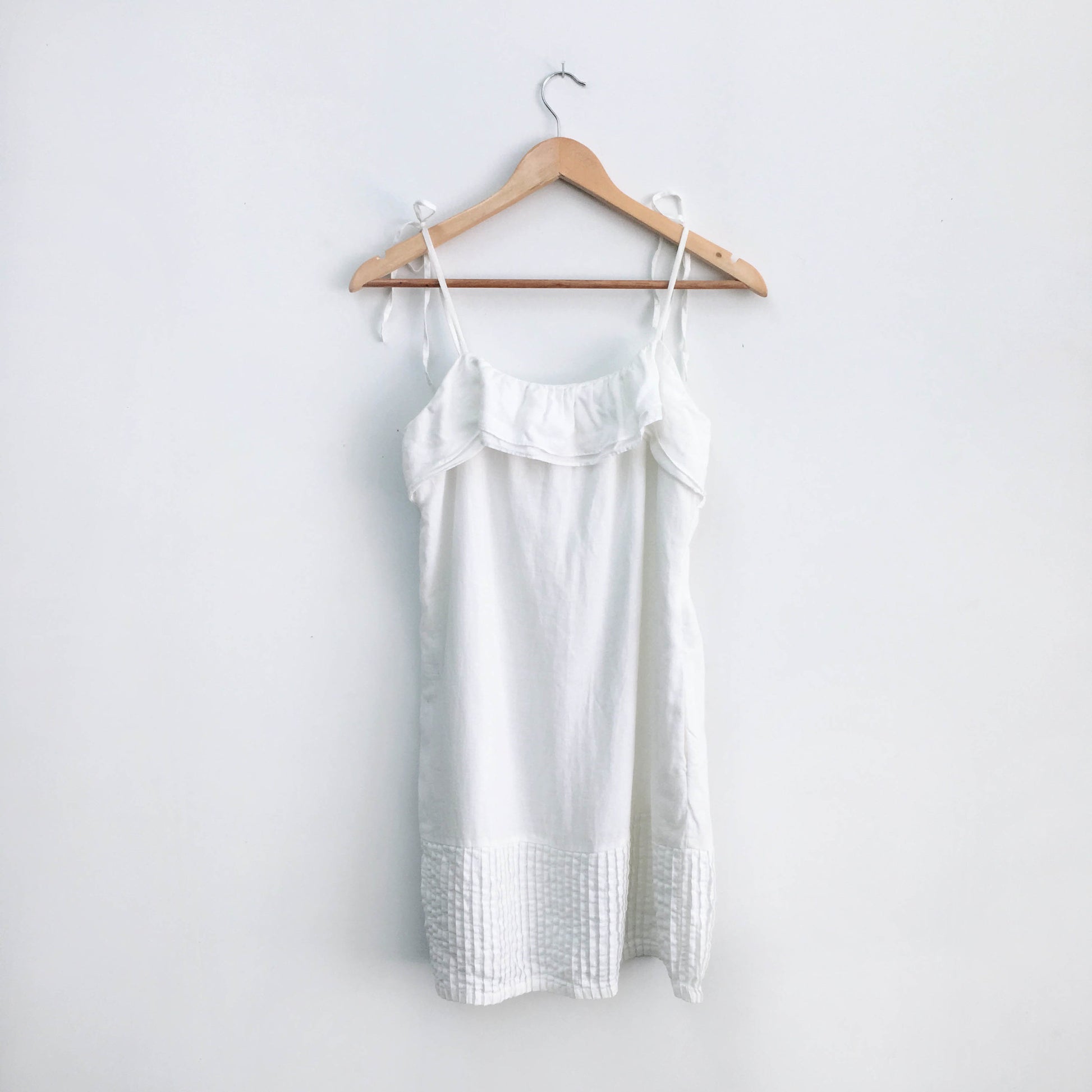 Item Description: This lovely white linen beach dress features a ruffle neckline, tie-string straps, side pockets, side zipper and is lined - making it perfect to wear to dinner at the resort! 100% linen exterior 100% cotton lining