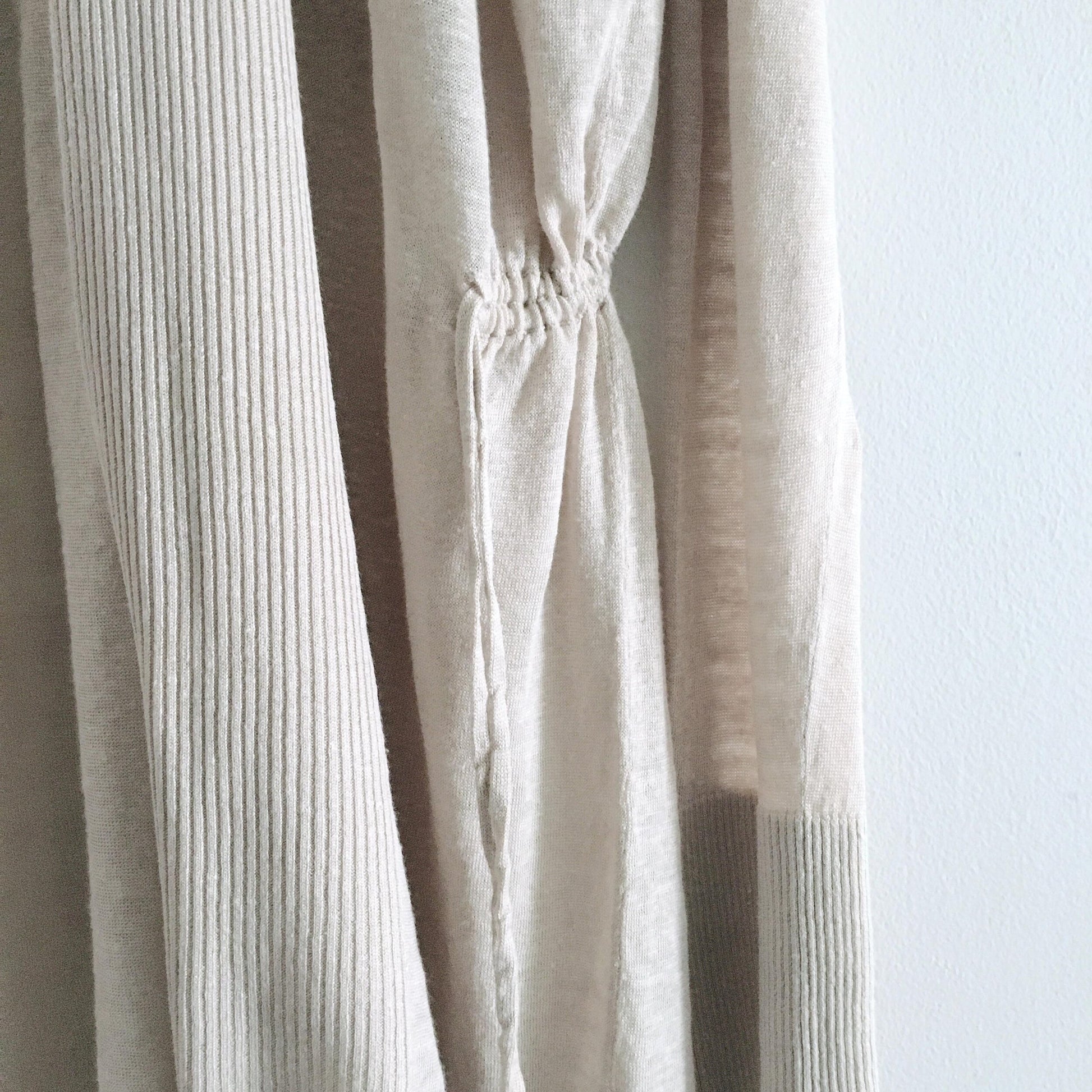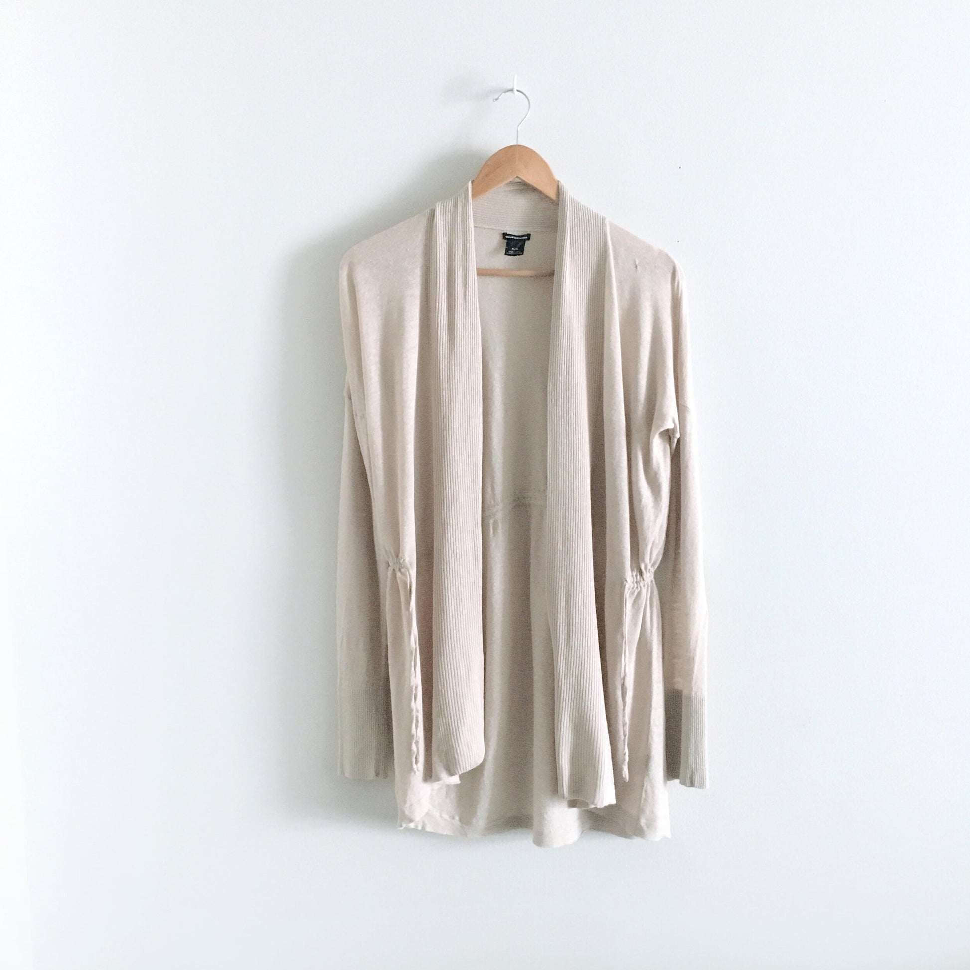 Item Description: The perfect piece for spring, this lightweight open linen cardigan from Club Monaco features a drawstring waist, ribbed neckline and cuffs in a long silhouette. 72% linen 28% rayon