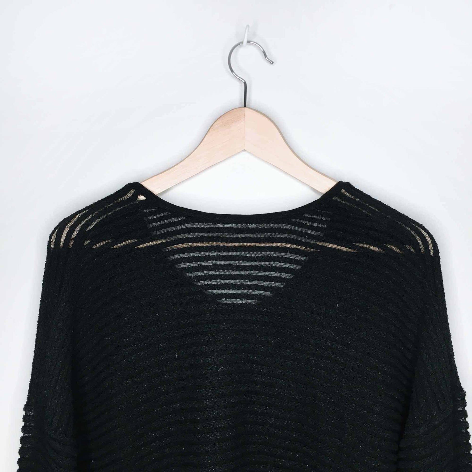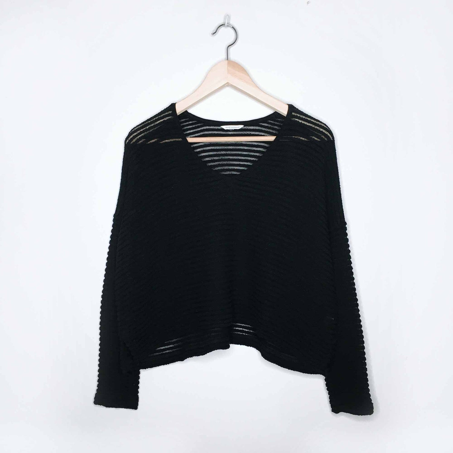 Item Description: This cute top from Club Monaco features a sheer-ribbed textured shell, v-neckline and wide, oversized fit with a slightly cropped silhouette. 52% cotton 41% viscose 7% nylon
