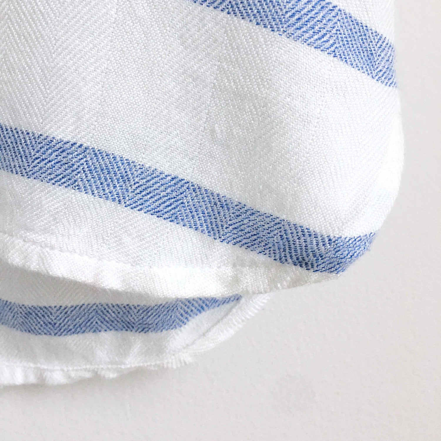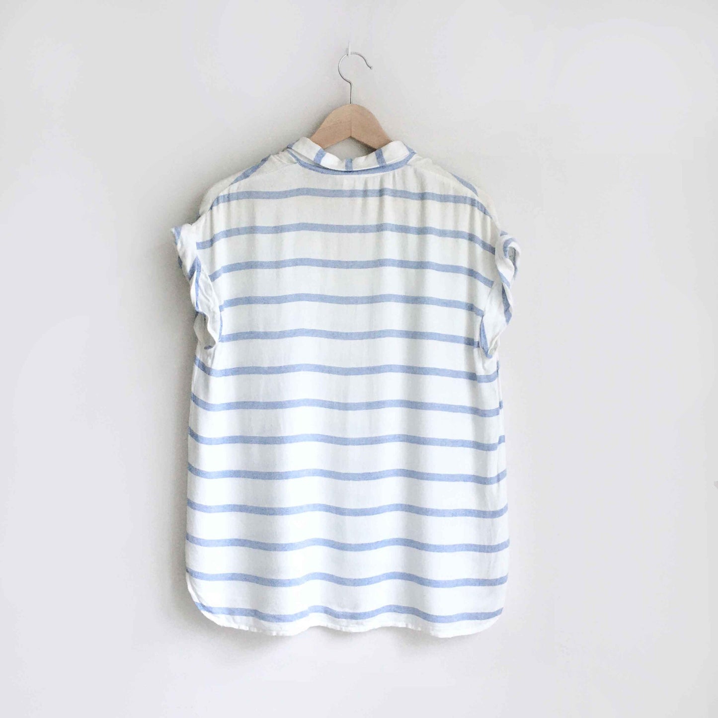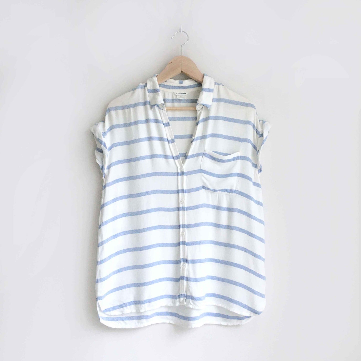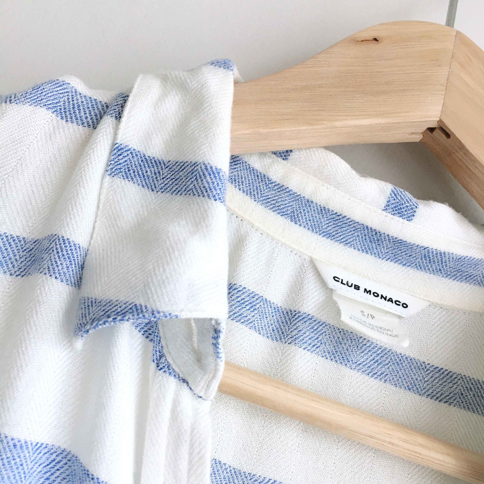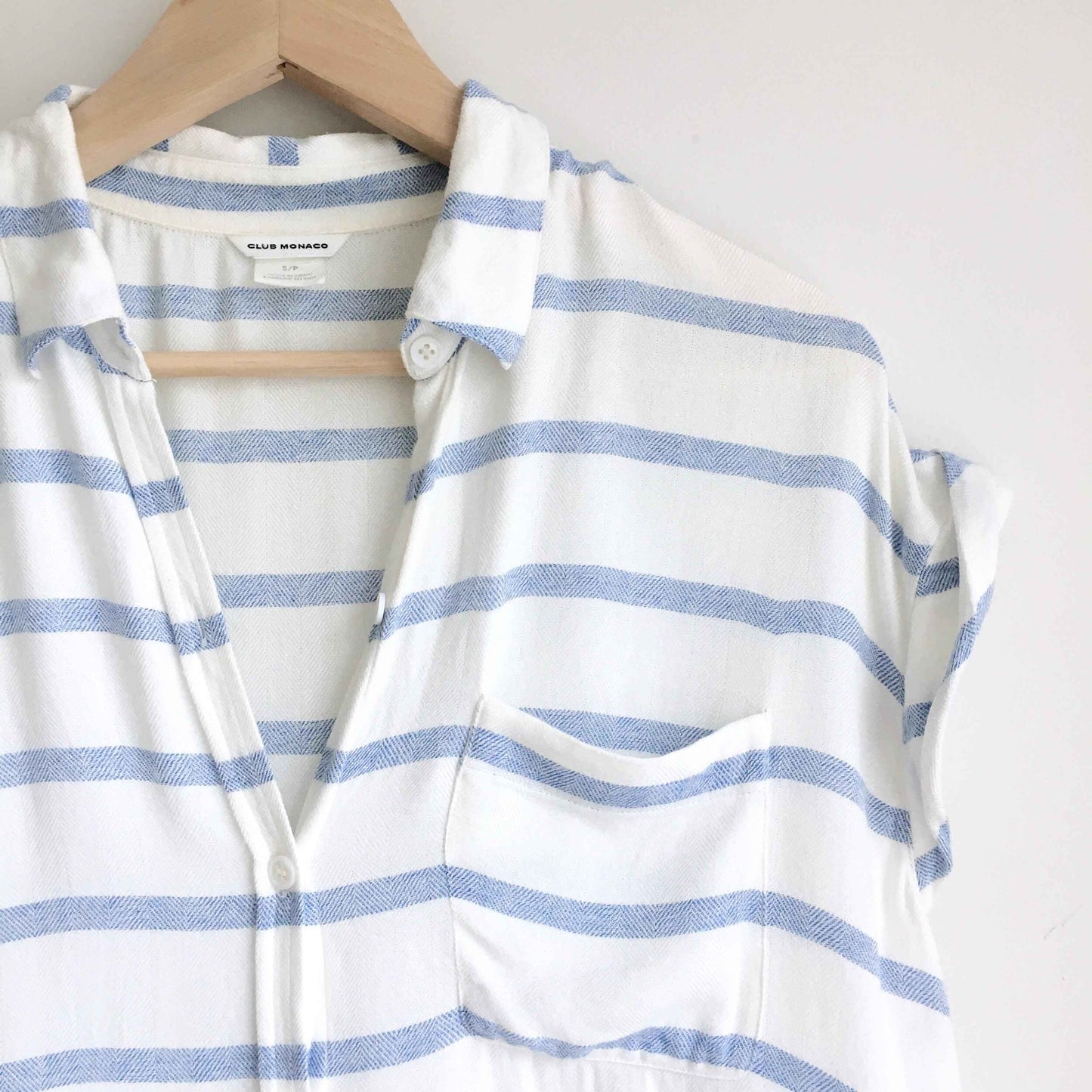 Item Description: This oversized flowy v-neck button down from Club Monaco is made from a super soft cotton-viscose blend in a herringbone weave. Short, rolled sleeves in a drop shoulder and front pocket in a summery, nautical stripe. No fabric tag.
