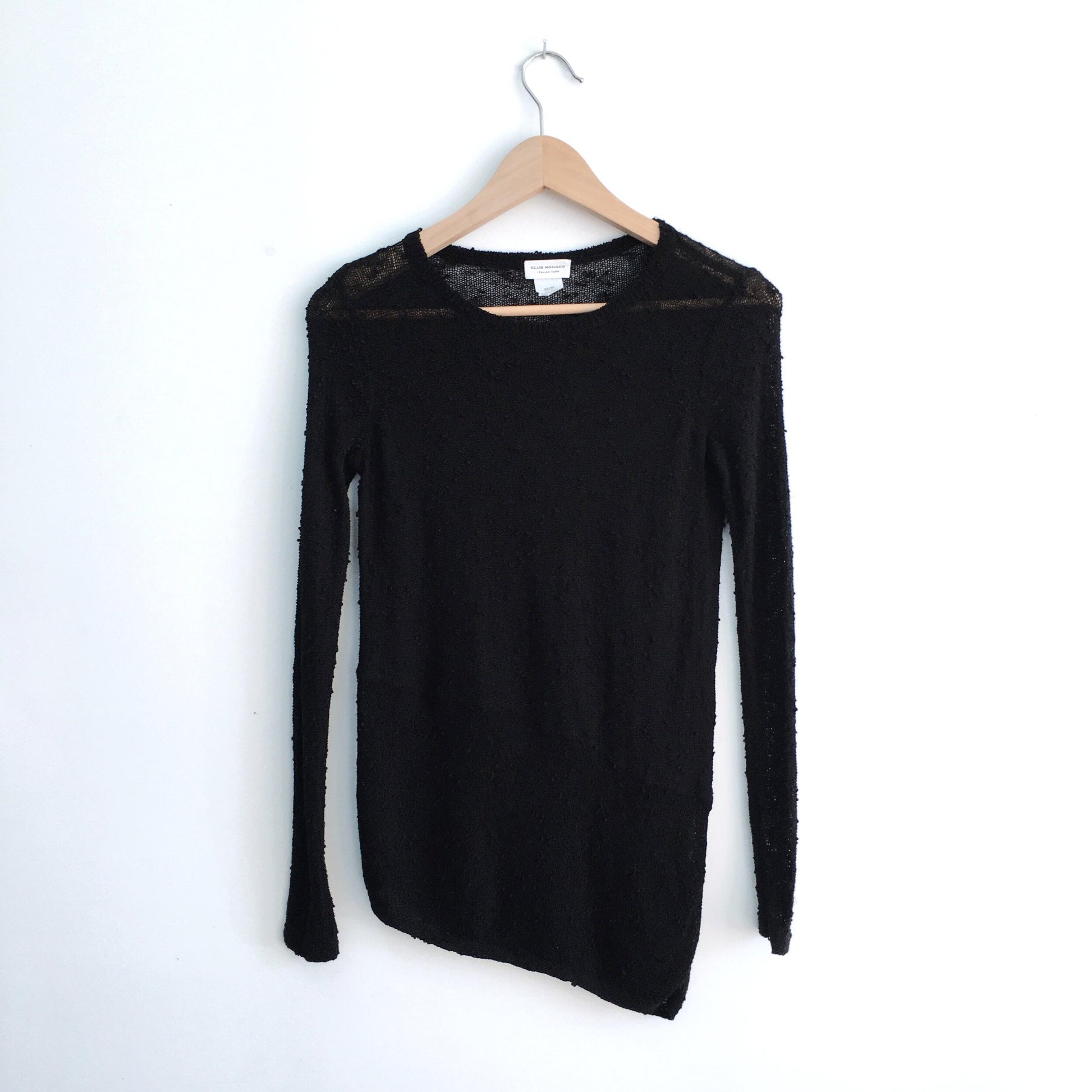 Item Description: This light knit sweater from Club Monaco is adorned with tiny pom pom’s woven in all over and made from Italian Yarn. Features an asymmetrical hem.