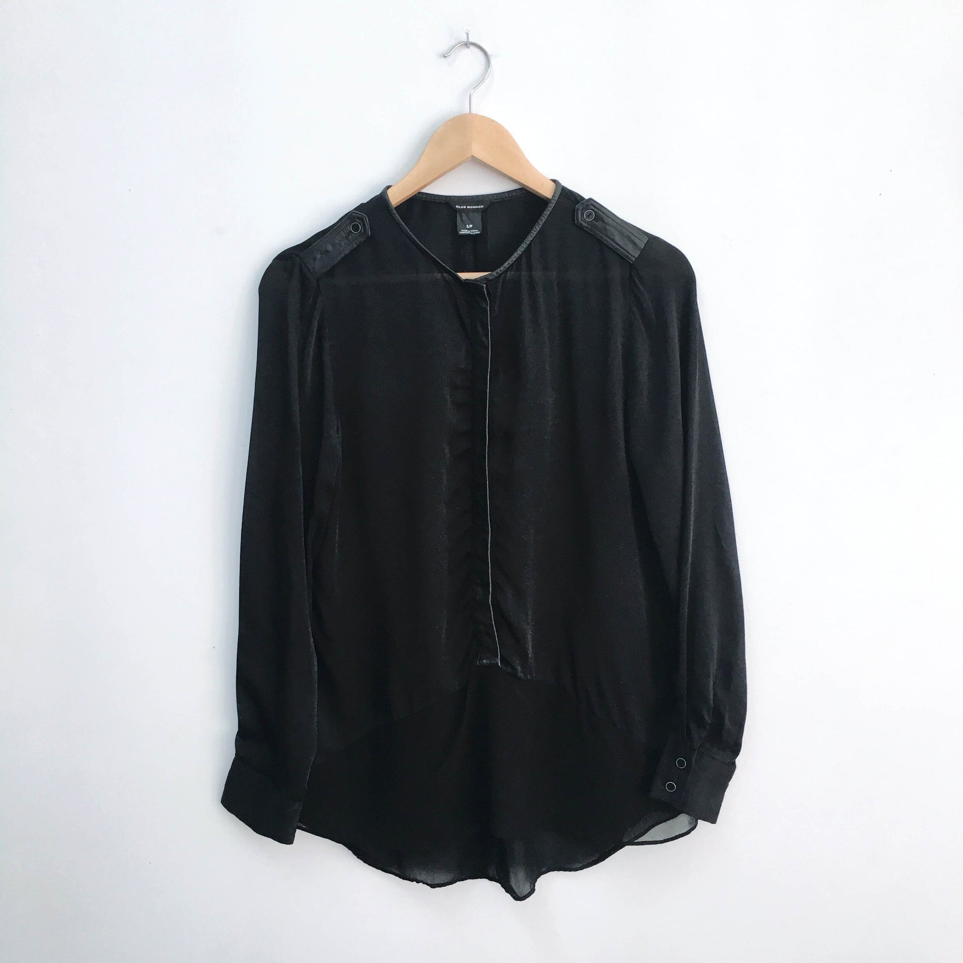 Item Description: This semi-sheer silk blouse from Club Monaco features a leather trim, hidden buttons and shoulder epaulettes for a statement piece from day to night. 100% silk with leather trim