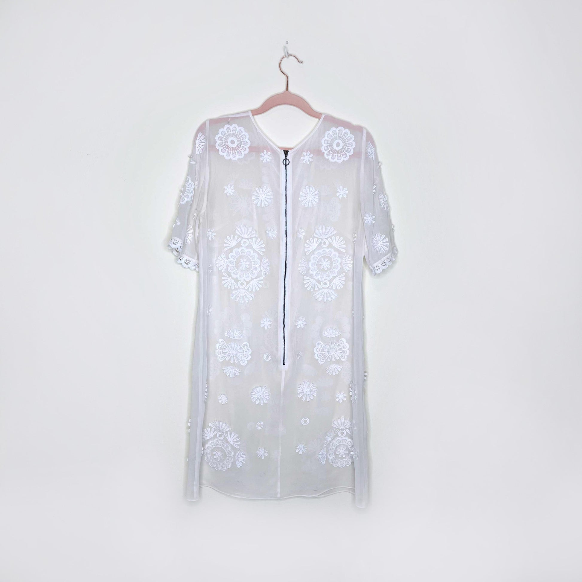 Item Description: Your beach cover-up game just elevated. This stunning creamy silk chiffon dress from Club Monaco features embroidered flower cut-outs all over in a caftan-style shift dress. Perfect for sipping a refreshing cocktail on a white beach. 100% silk
