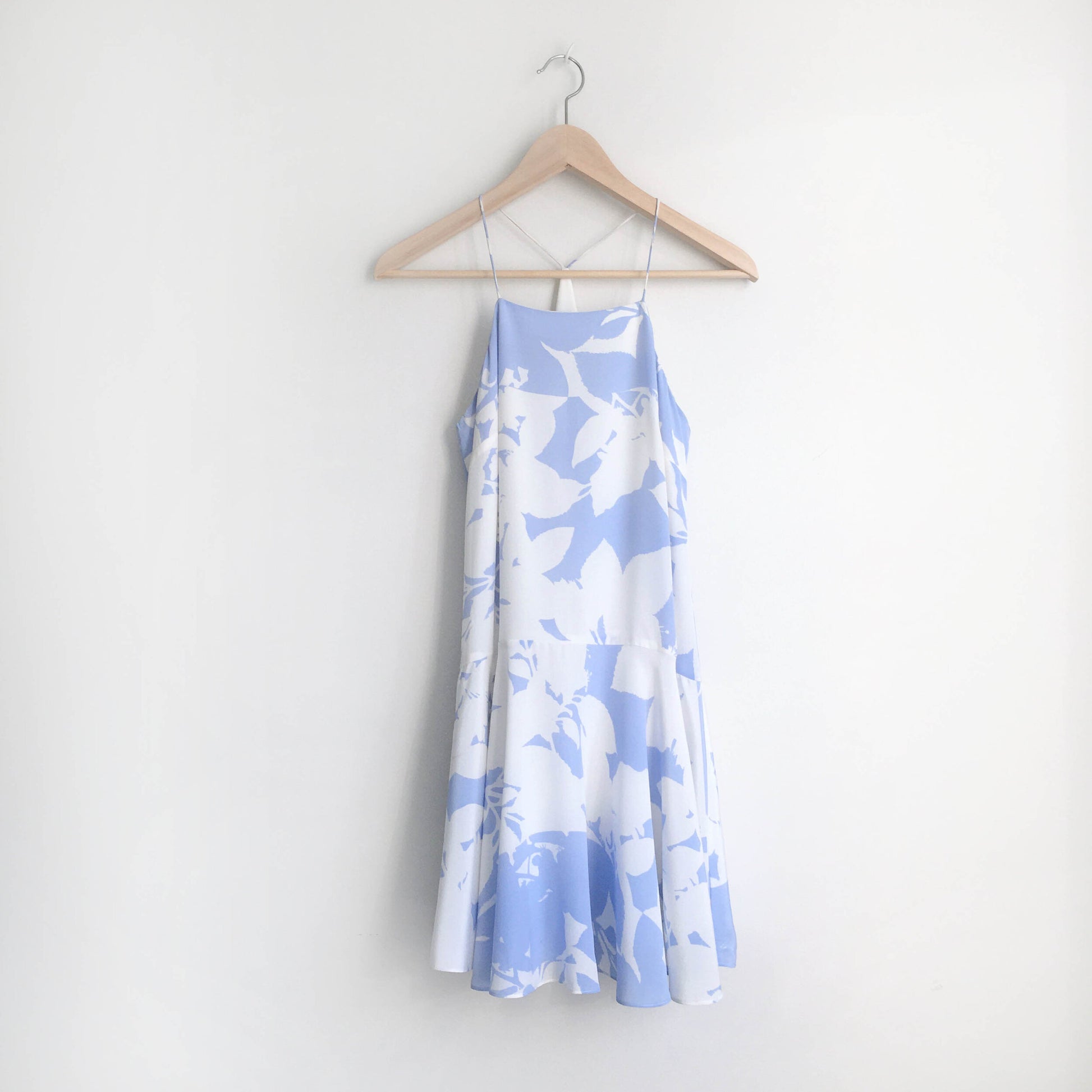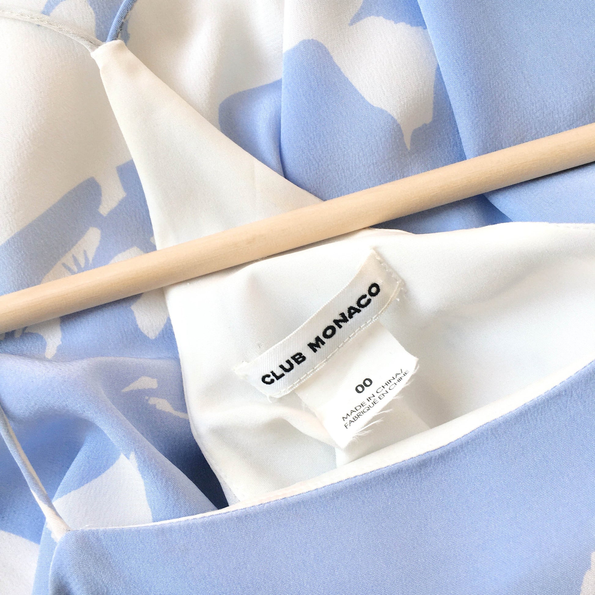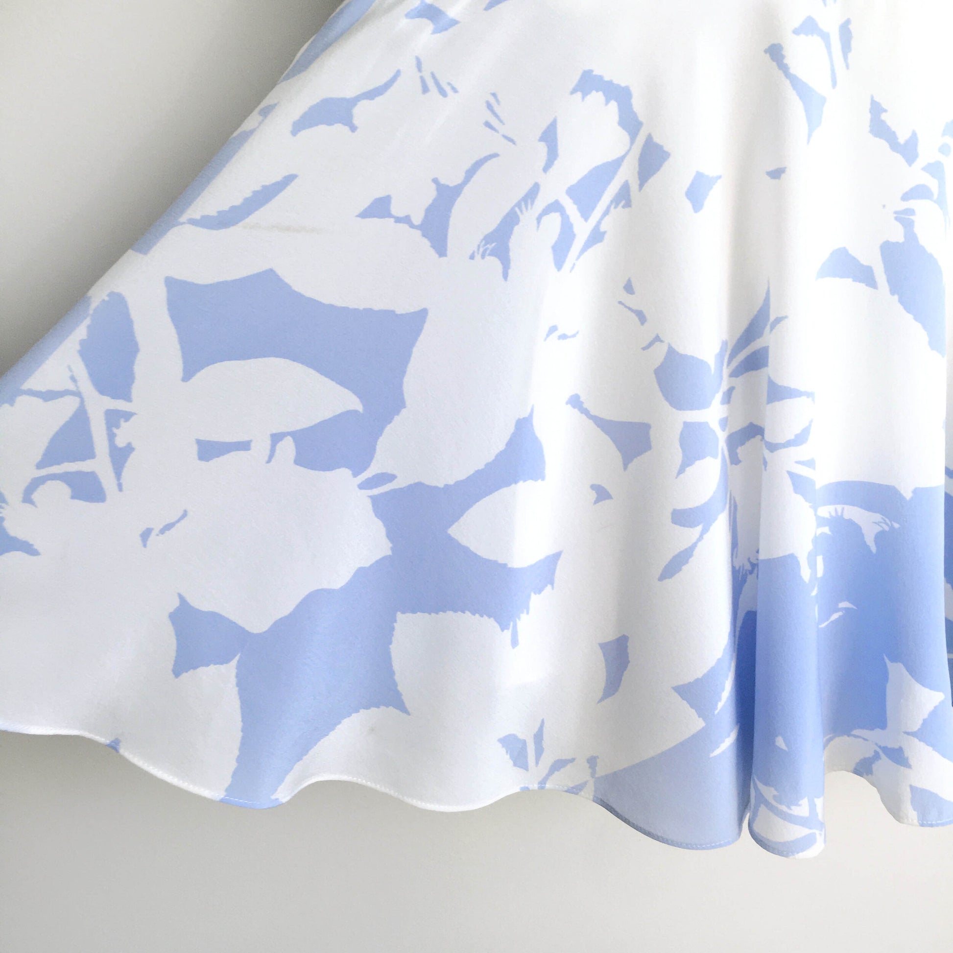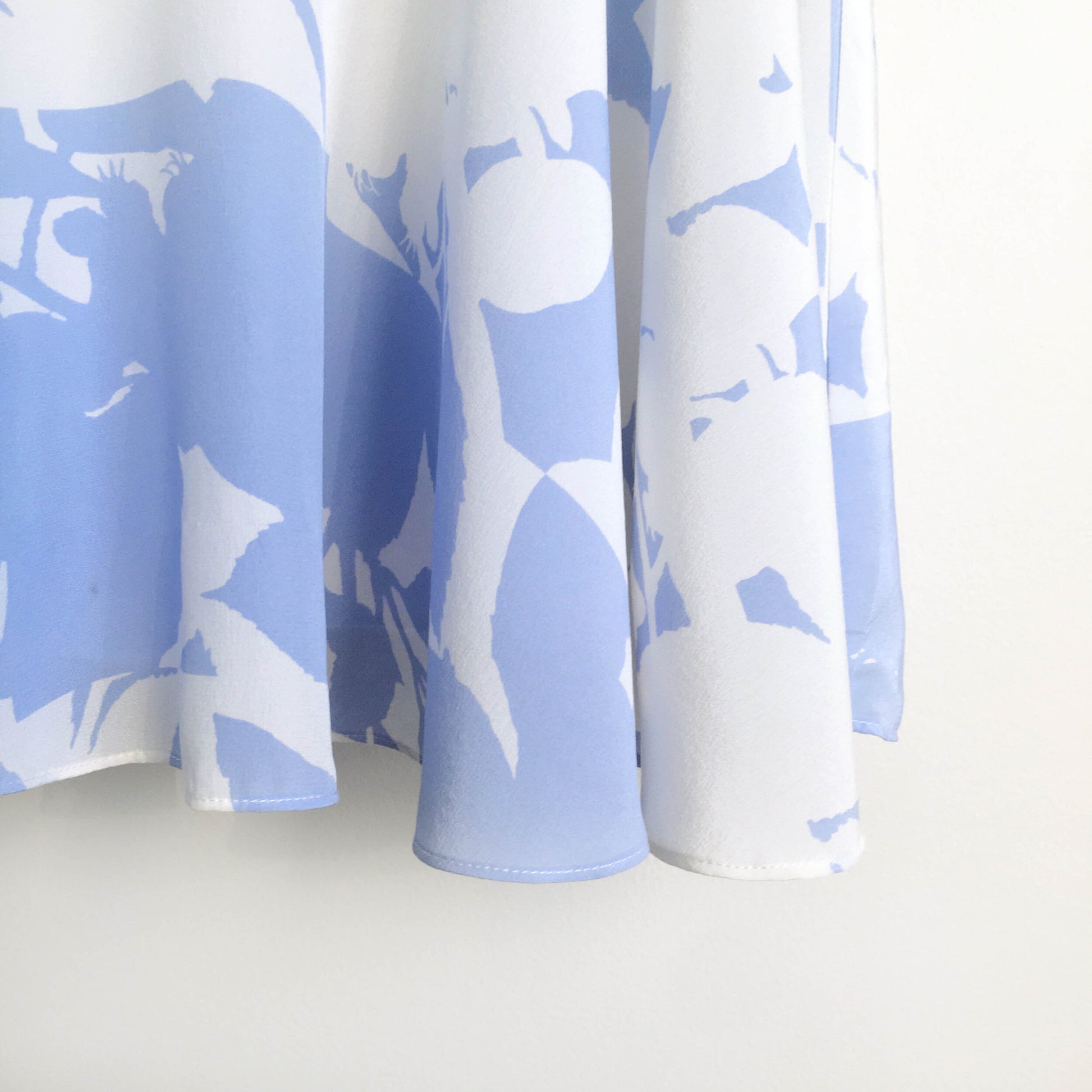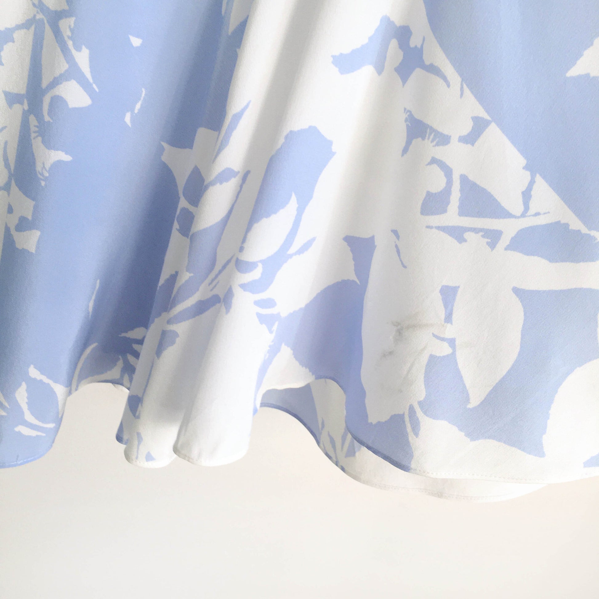 Item Description: This stunning silk dress from Club Monaco features a high neck, peplum a-line hem with fabric for days, and an overall light blue (perhaps even periwinkle) and white floral print. Lined. 100% silk shell 100% polyester lining