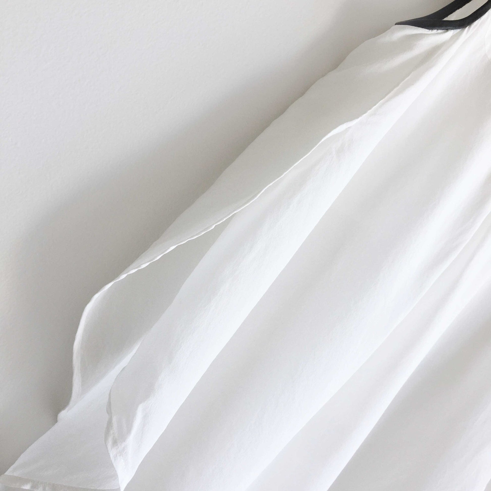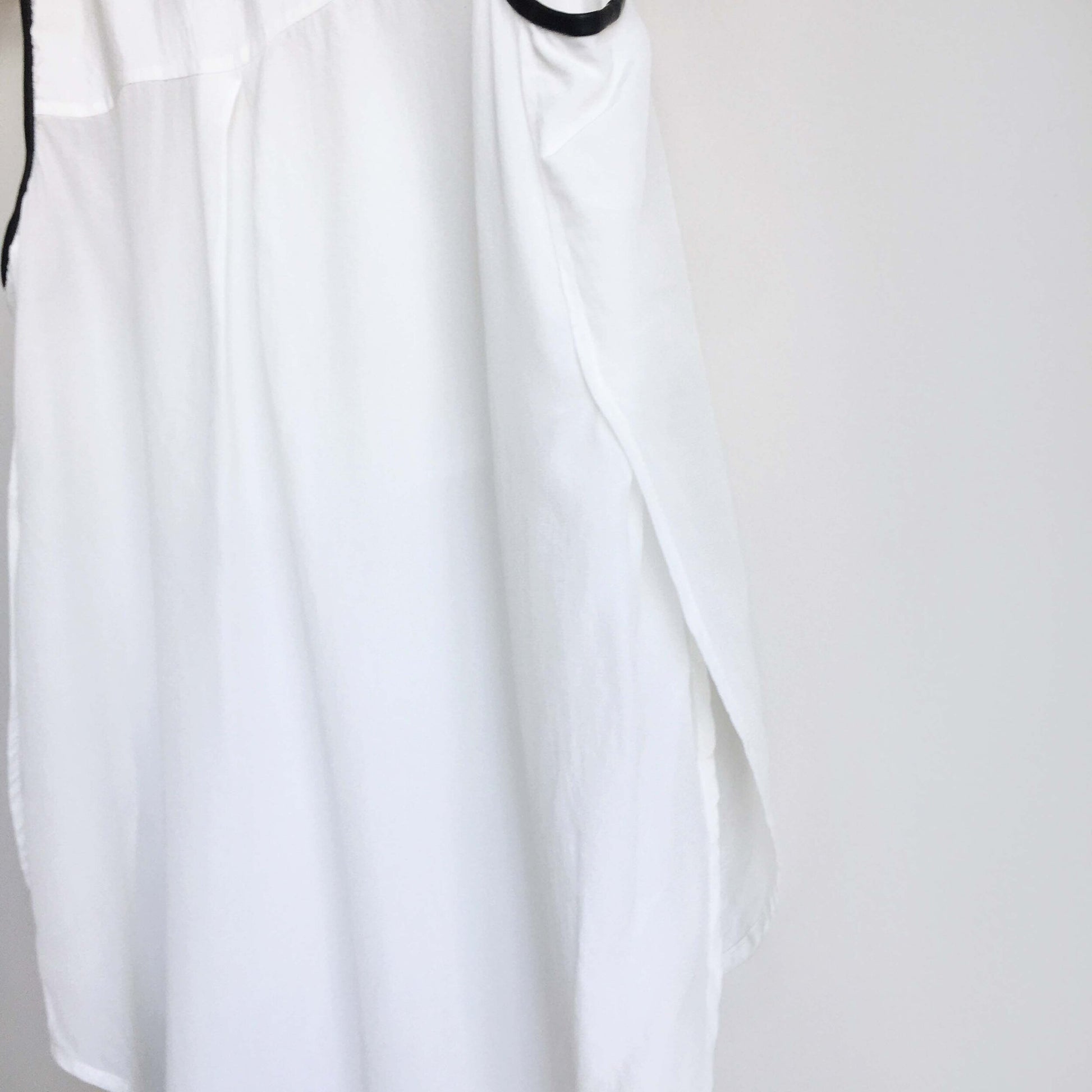 Item Description: This flowing white silk buttondown from Club Monaco features covered buttons, faux leather trim and a gold top button. 100% silk
