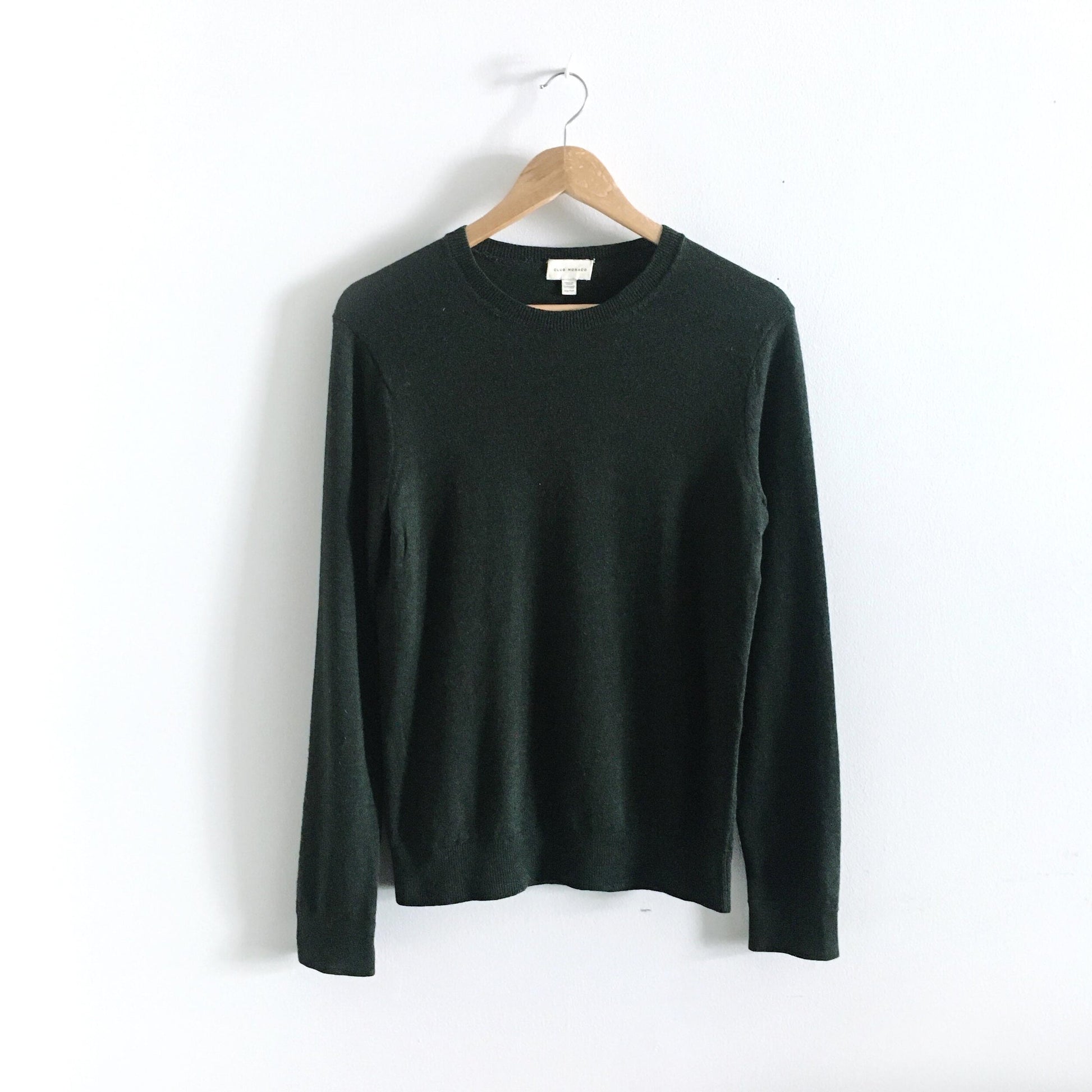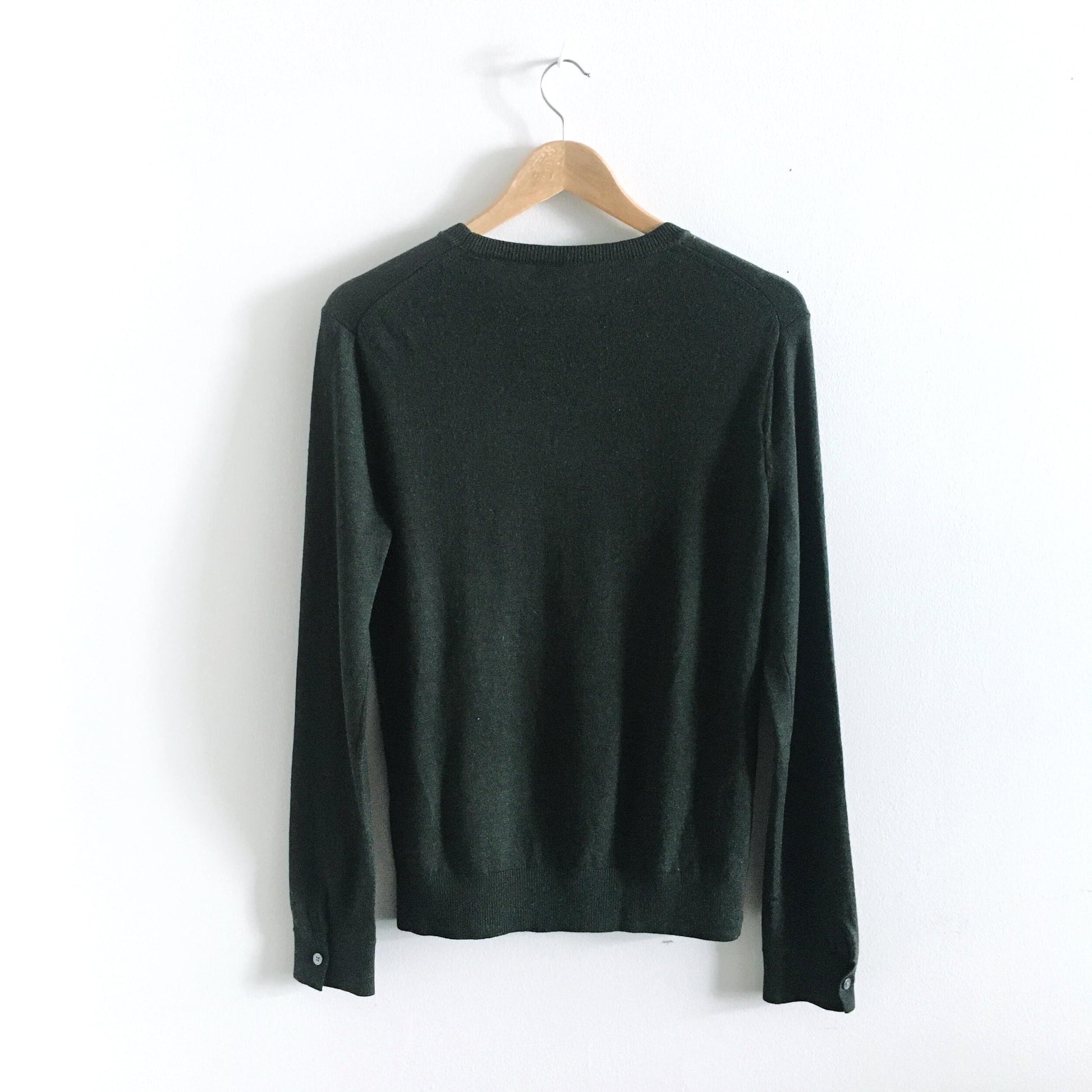Item Description: A deep jewel green crewneck sweater from Club Monaco with button cuffs. 100% wool