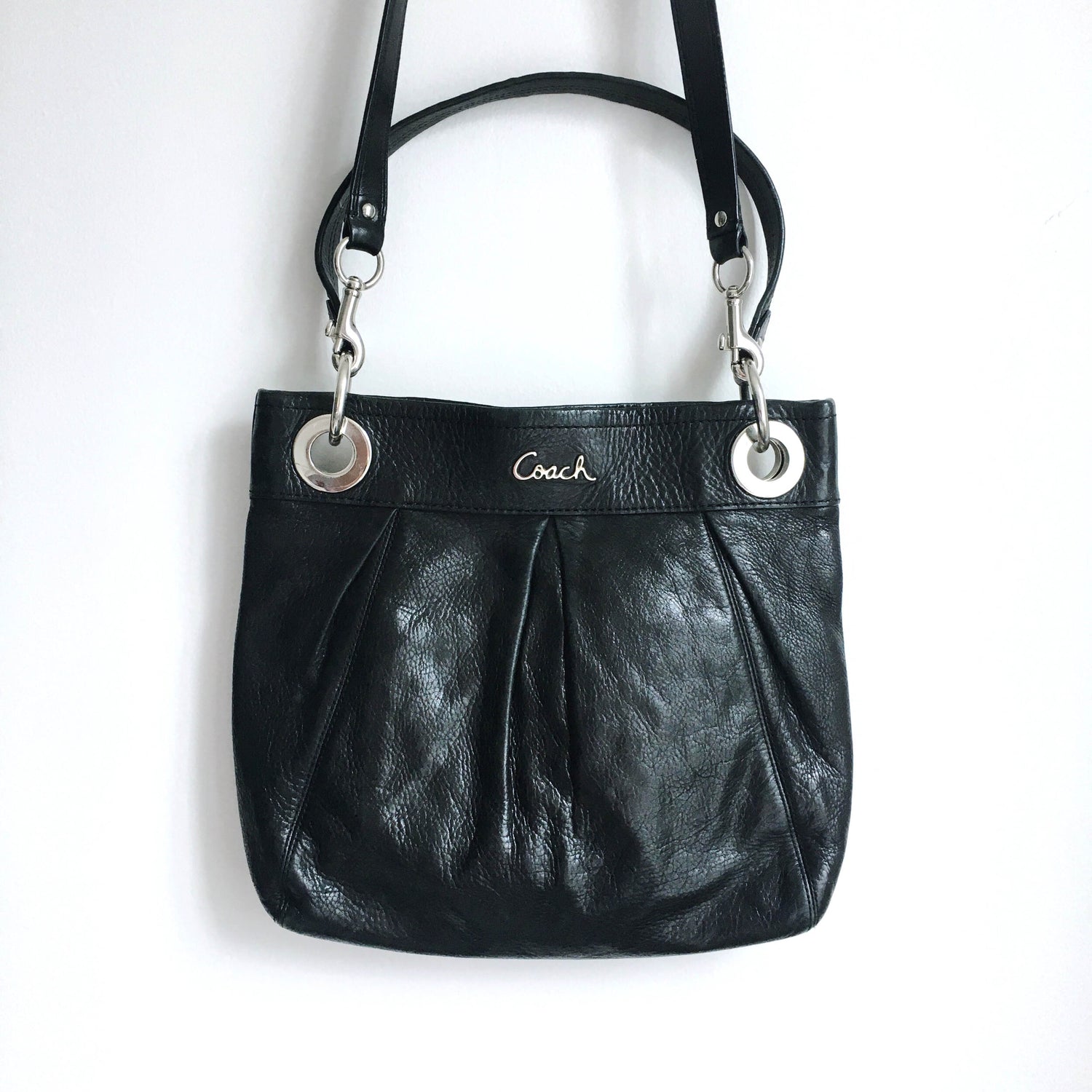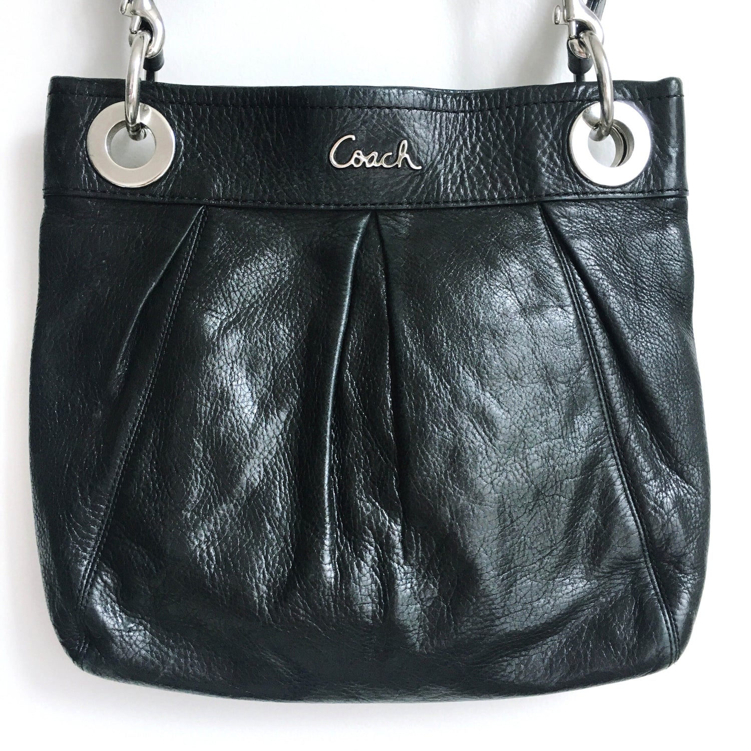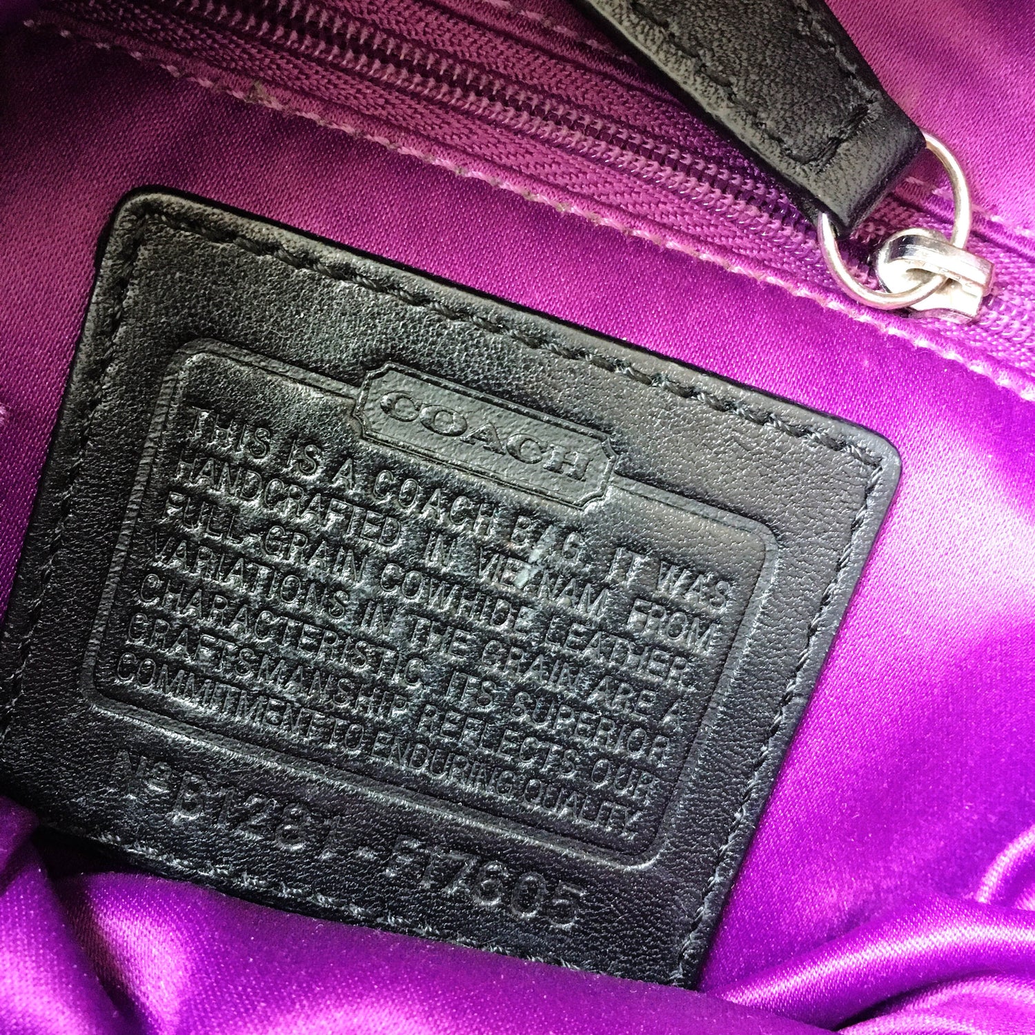 Item Description: The classic Ashley Hippie bag from Coach features both a carrying handle and shoulder strap. The exterior boasts the scripted logo and nickle hardware along with signature pleats. Numerous interior pockets in a purple satin make organizing your life in this medium sized bag, super easy. 100% leather