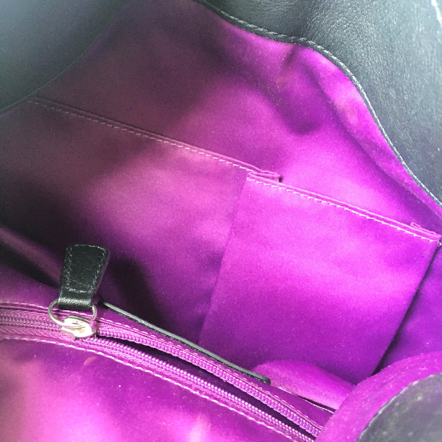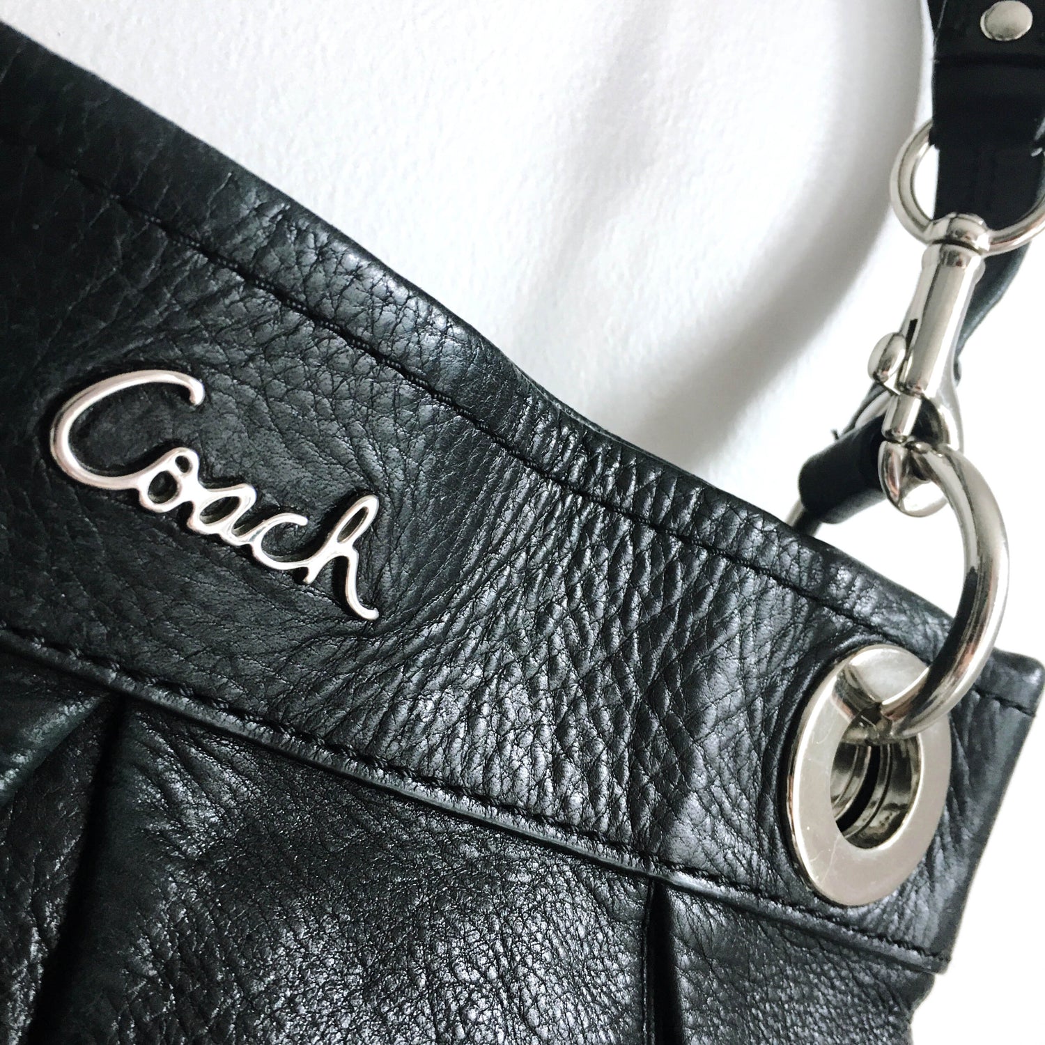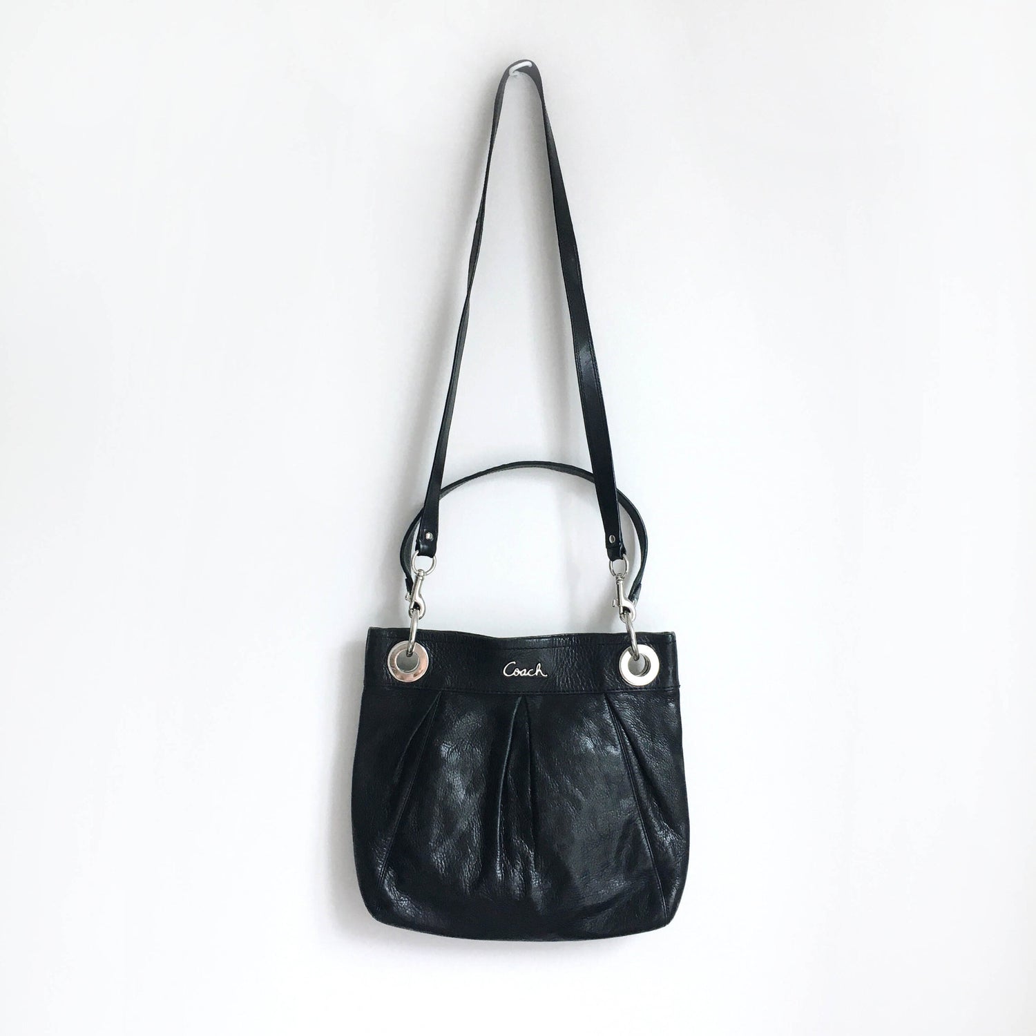 Item Description: The classic Ashley Hippie bag from Coach features both a carrying handle and shoulder strap. The exterior boasts the scripted logo and nickle hardware along with signature pleats. Numerous interior pockets in a purple satin make organizing your life in this medium sized bag, super easy. 100% leather