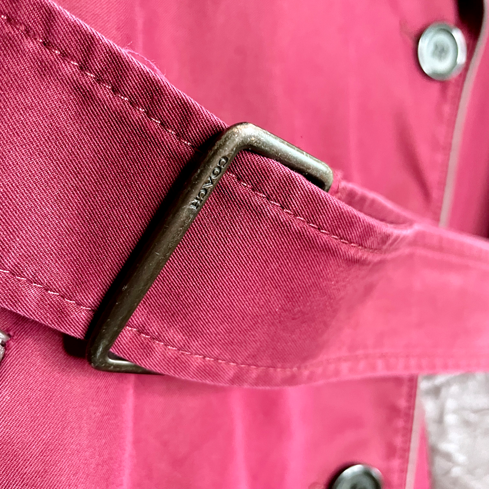 Item Description: This classic trench coat from Coach features and array of details including leather trimmed pockets and piping, funnel neck closure, double breasted front and belted waist in a structured, lightweight cotton twill.