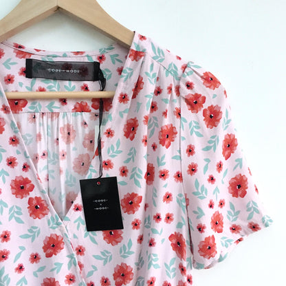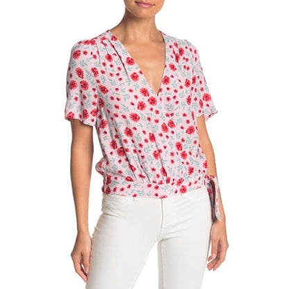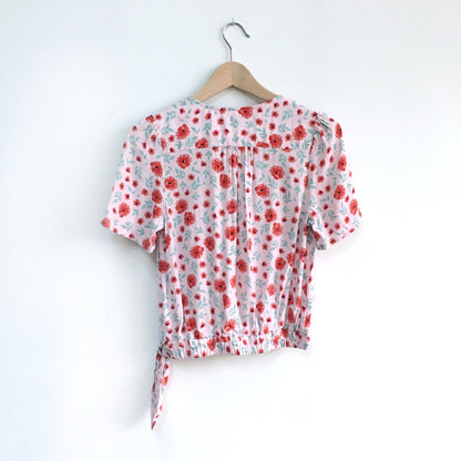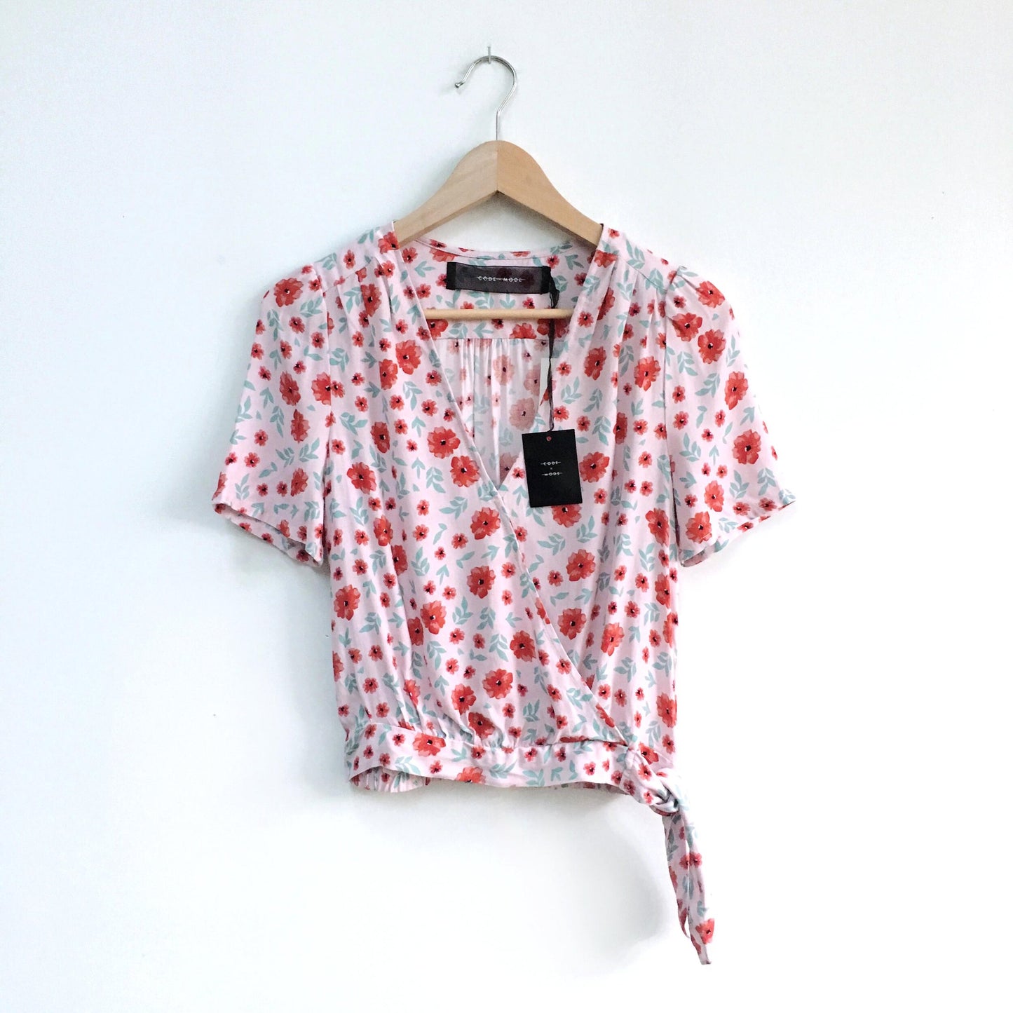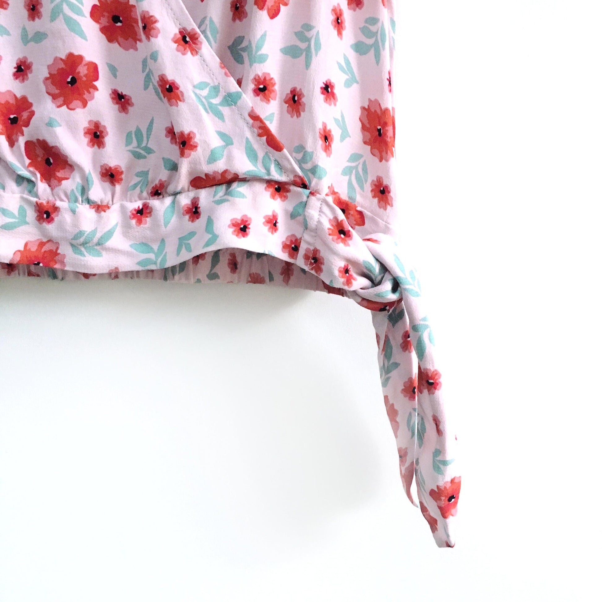 Item Description: A classic floral print details this crop top with a chic side tie finish. Slips on overhead. 100% rayon