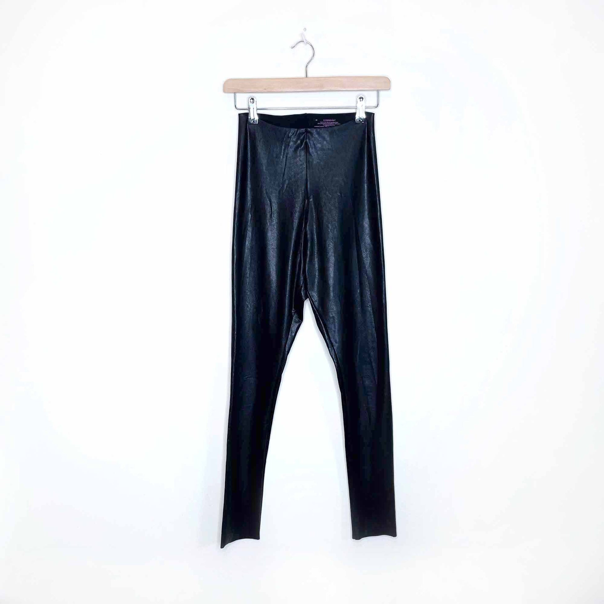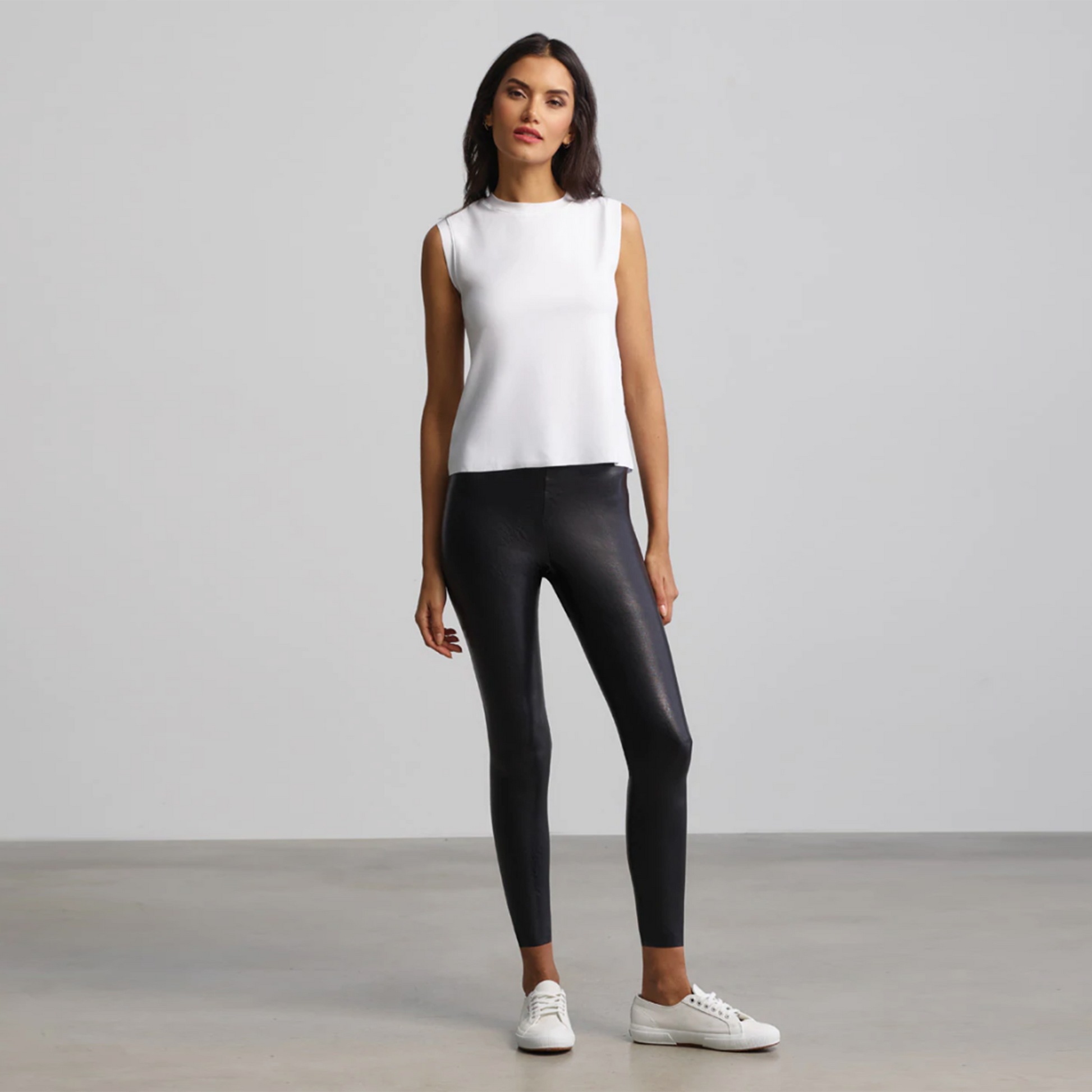Item Description: Our faux leather fabric has phenomenal four-way stretch, raw-cut edges and smoothing properties. These 7/8 length faux leather leggings are made with commando's signature internal waistband, flattering high-rise, and a slightly shorter length, raw-cut hem. 55% polyurethane 44% viscose 1% elastane